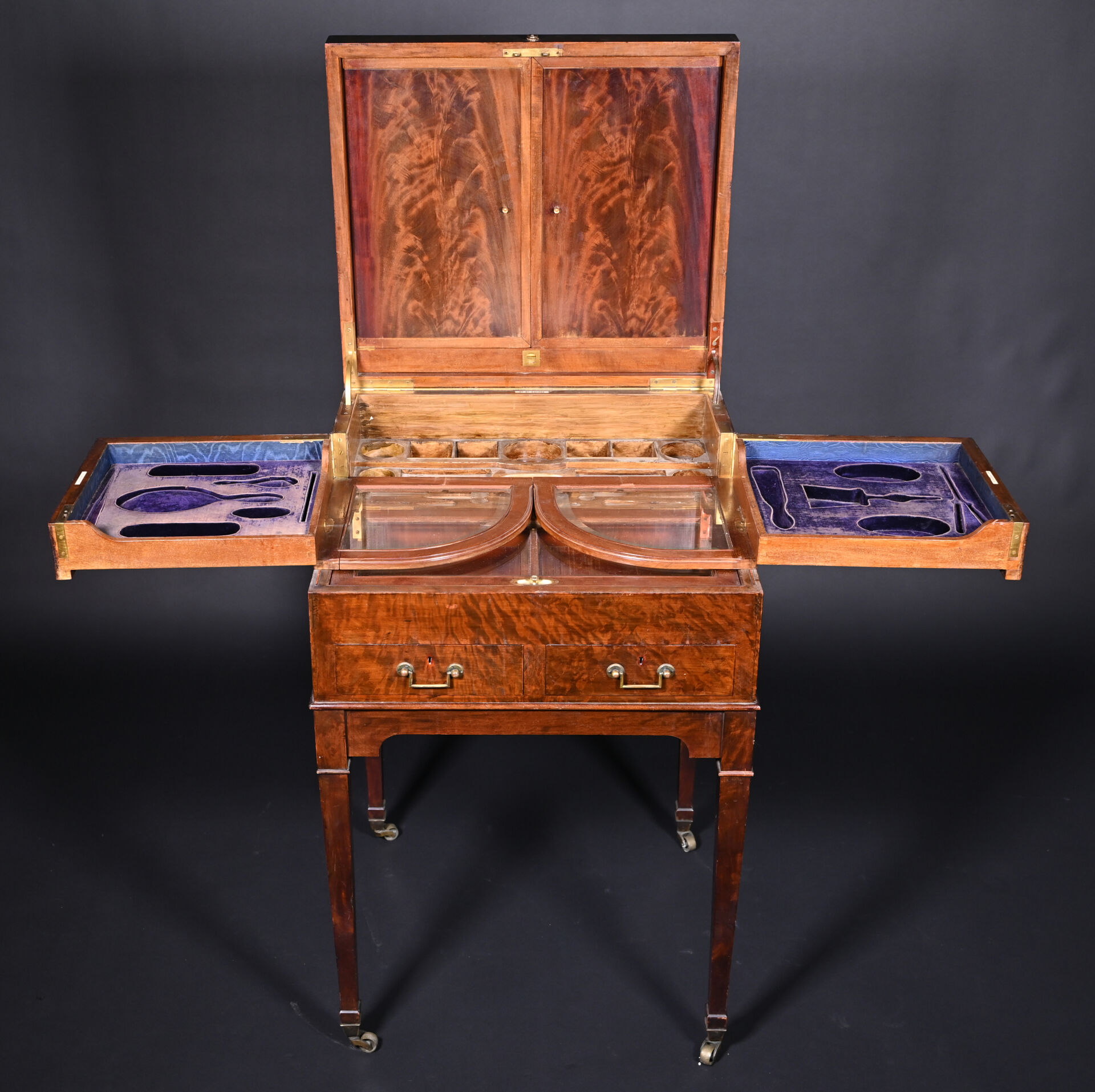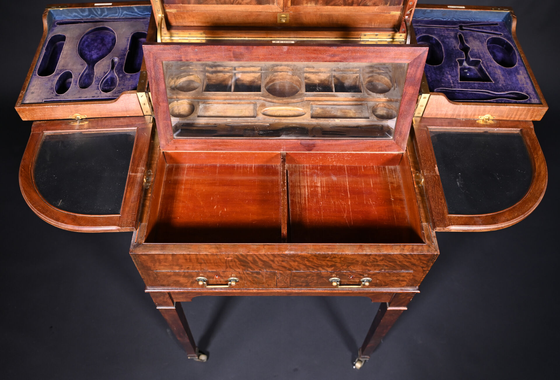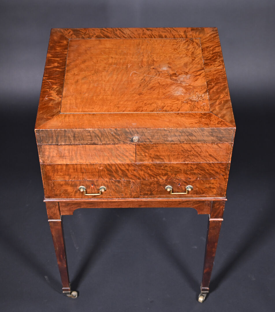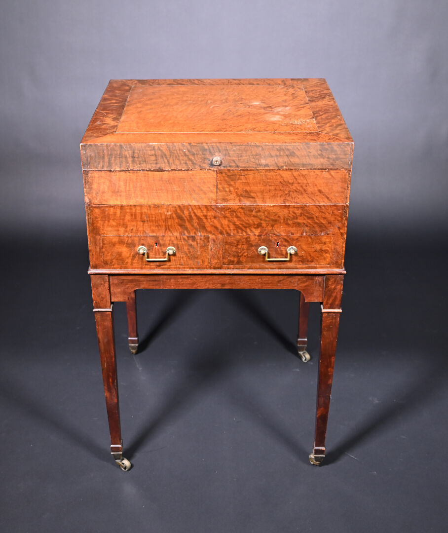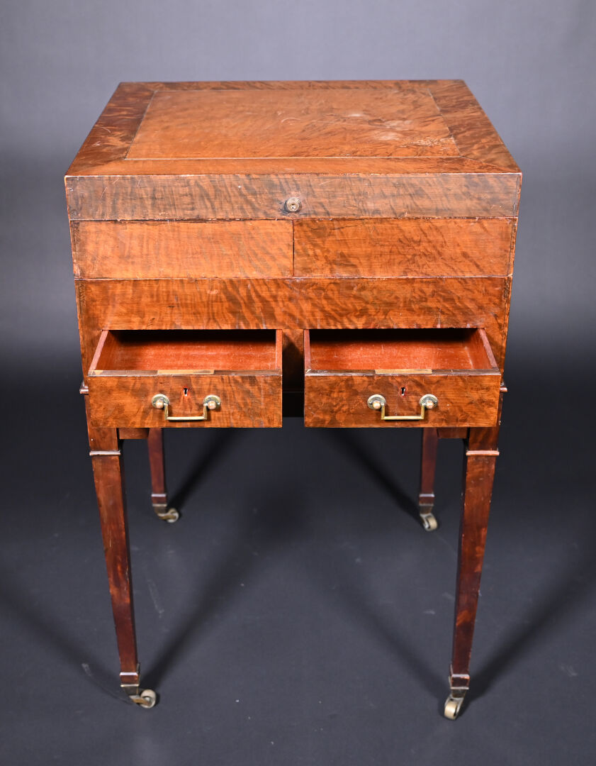 Meuble de toilette en acajou et placage d’acajou mouluré, le plateau brisé découvre un miroir tripartite et un intérieur aménagé à quatre plateaux pivotants, la ceinture ouvre par deux tiroirs, pieds en gaine munis de roulettes (usures d’usage, frottements, légers manques).