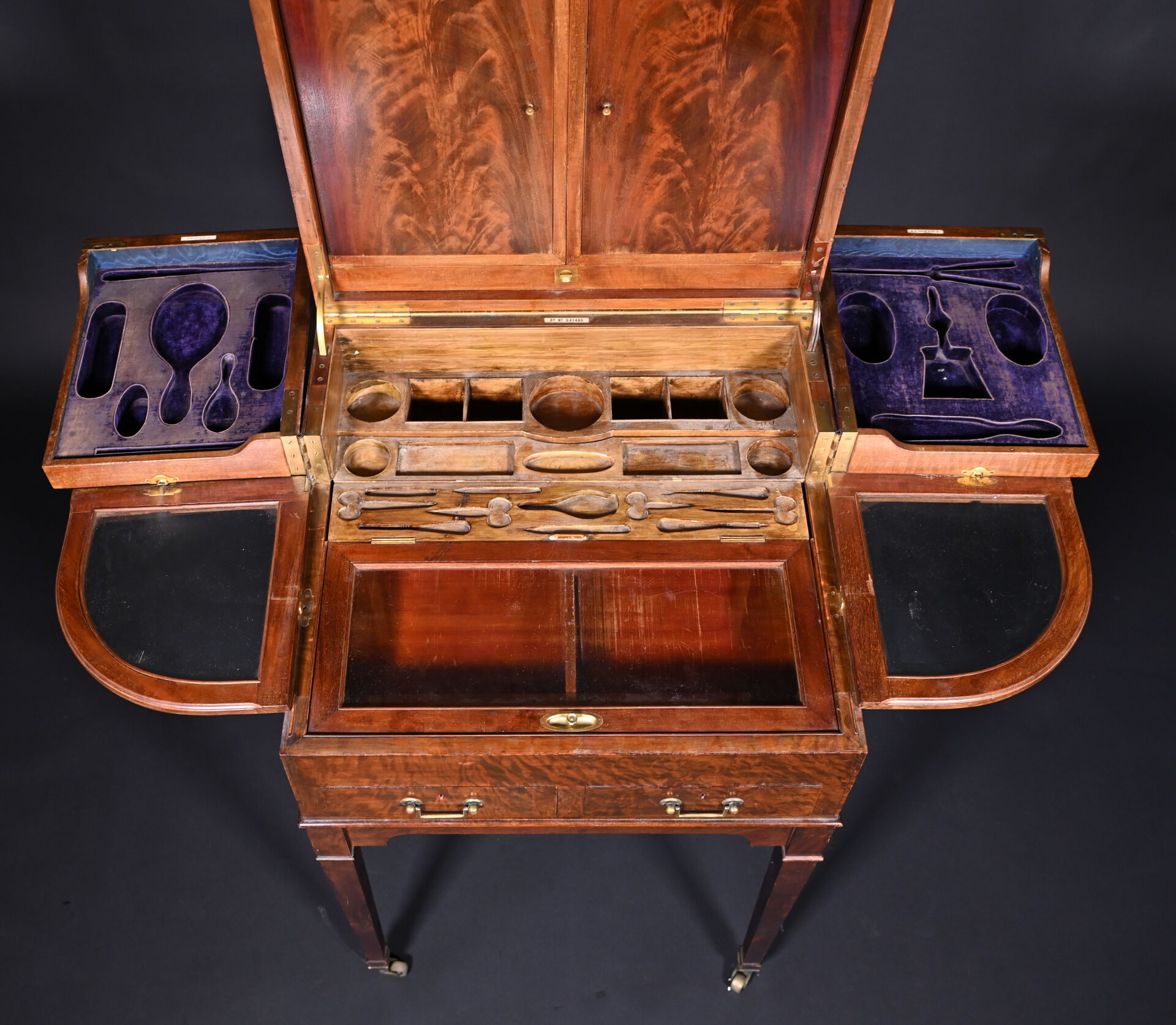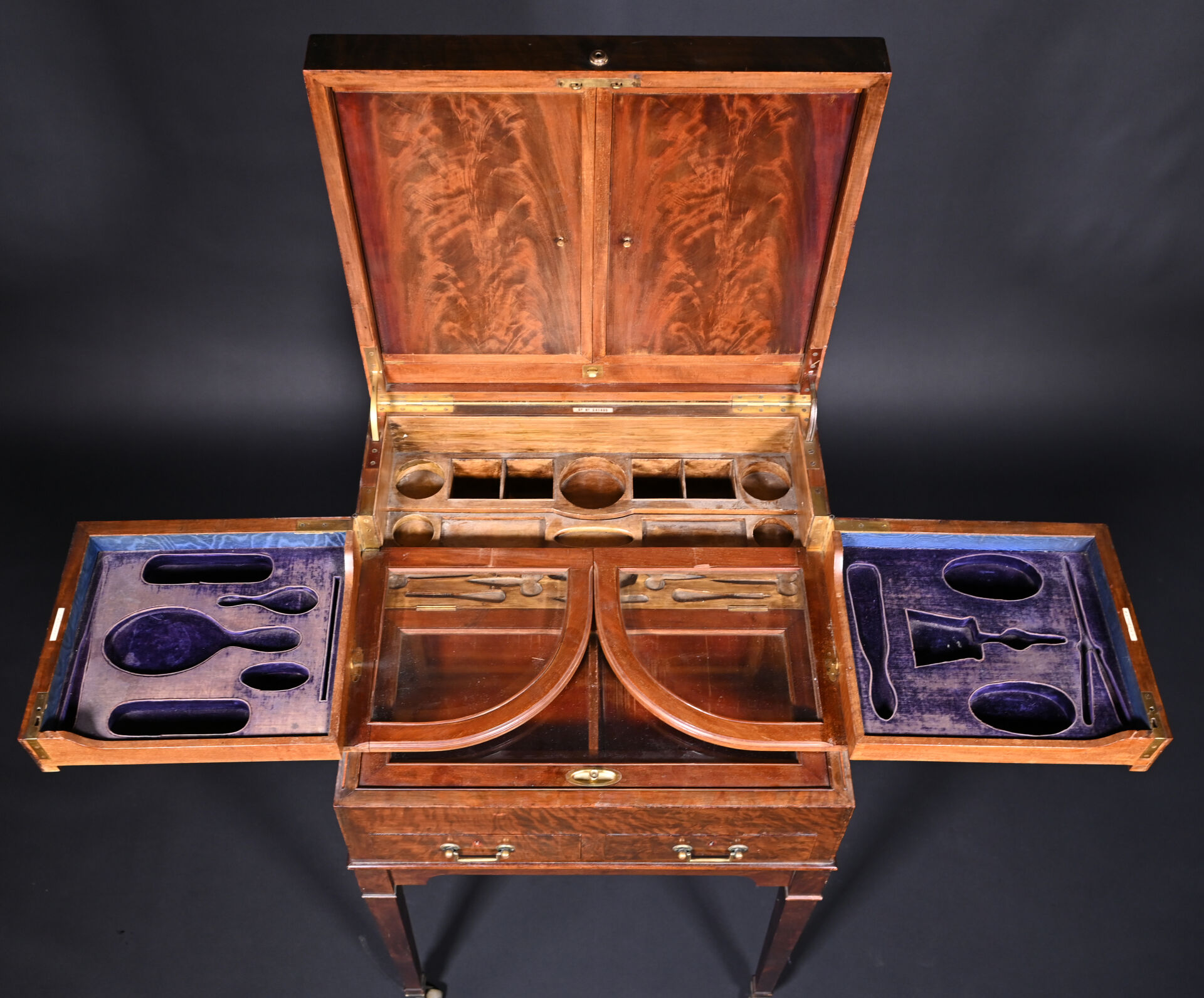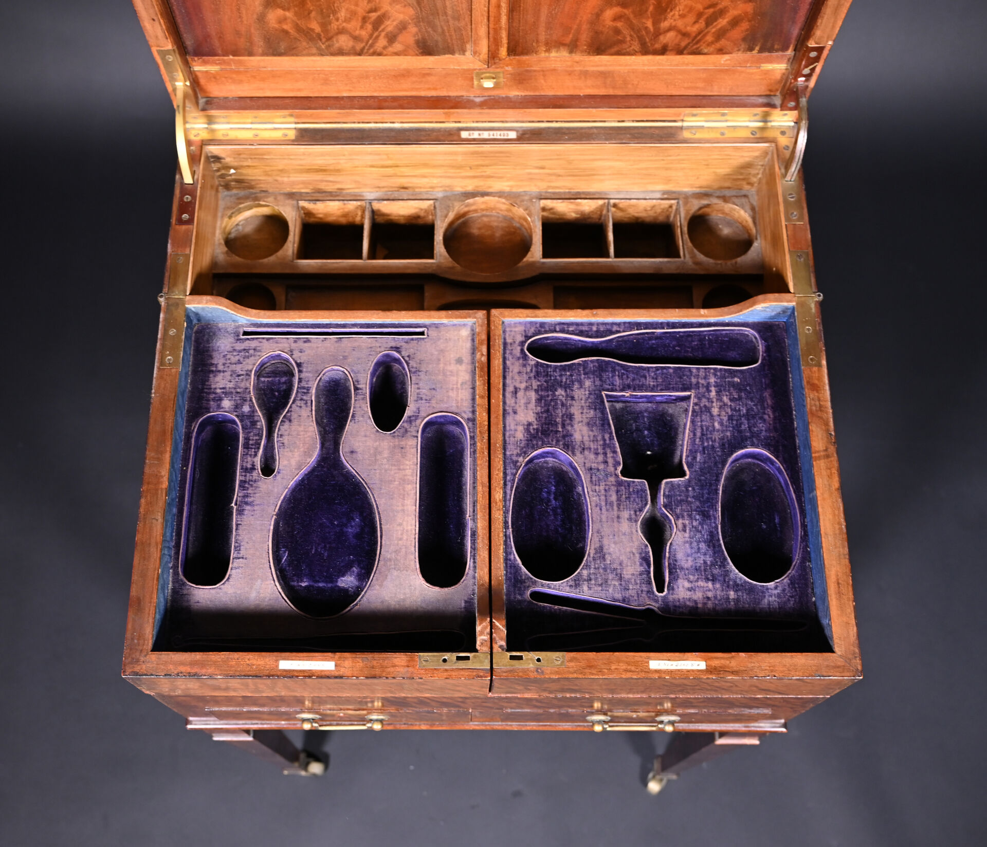 Meuble de toilette en acajou et placage d’acajou mouluré, le plateau brisé découvre un miroir tripartite et un intérieur aménagé à quatre plateaux pivotants, la ceinture ouvre par deux tiroirs, pieds en gaine munis de roulettes (usures d’usage, frottements, légers manques). Signé sur trois plaquettes d’ivoire : Finnigans. / 18 New Bond St. W. / Rd No 541493. Travail anglais d’époque Edwardienne. Poids brut : 30 kg. Totale : Haut. : 95,5 cm – Larg. : 61 cm – Prof. : 56 cm. Poids total brut des pièces contenant de l’ivoire : 30 kg. Créateur : Finnigans. Datation : début du XXe siècle. Nom scientifique de l’espèce CITES identifiée : Elephantidae spp. CIC : FR2608200003-K.
