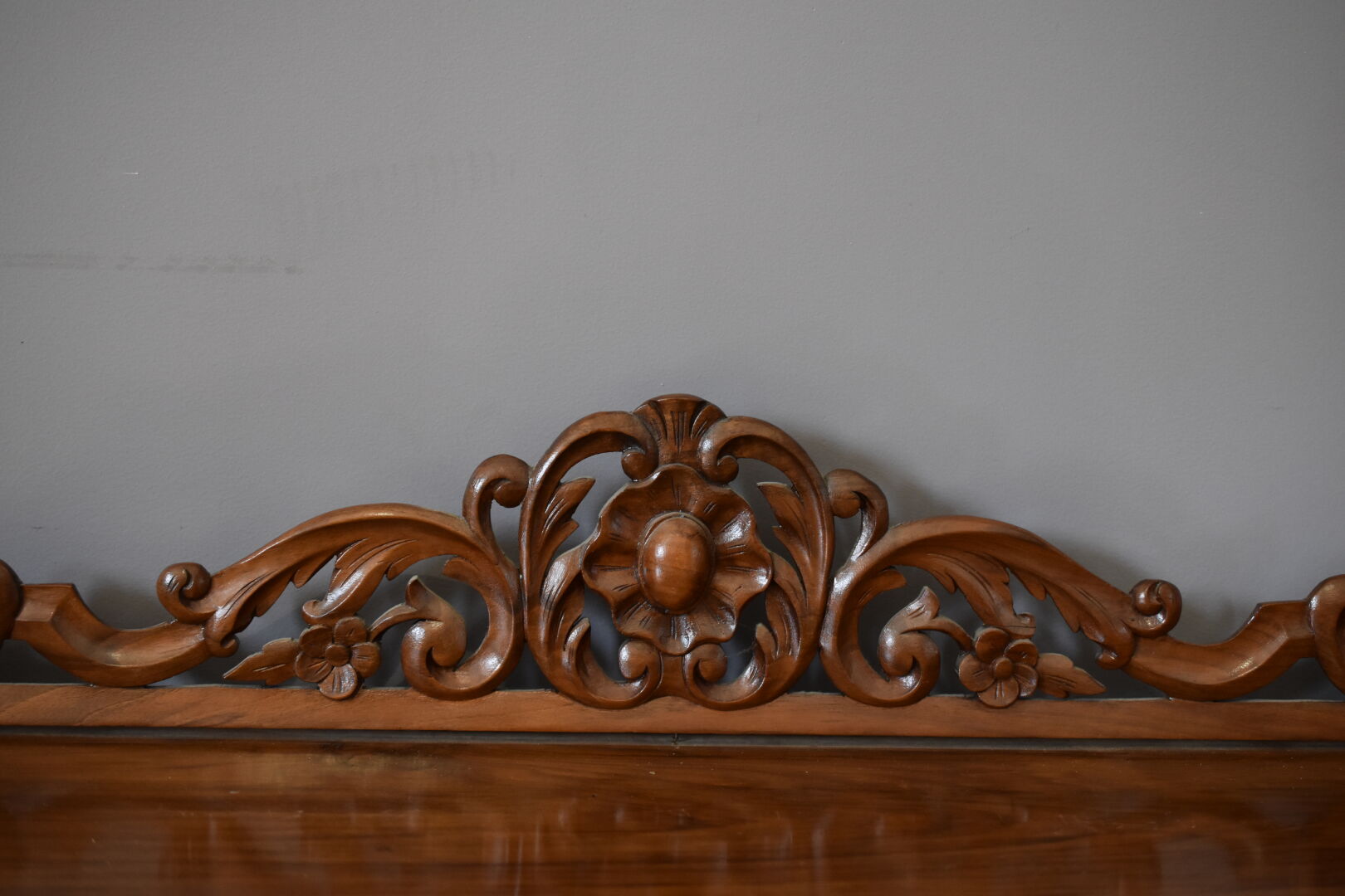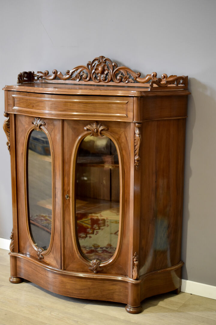 Meuble d’entre deux à façade galbée en placage de noyer. Il ouvre à deux pportes vitrées et repose sur des pieds de section cylindrique. Le plateau en partie orné d’une galerie d’acanthes. Epoque Napoléon III. Haut. : 110 cm – Larg. : 87 cm – Prof.: 38 cm.
