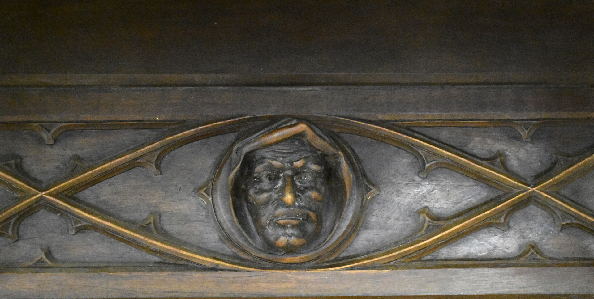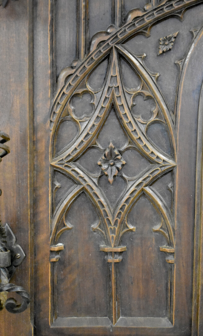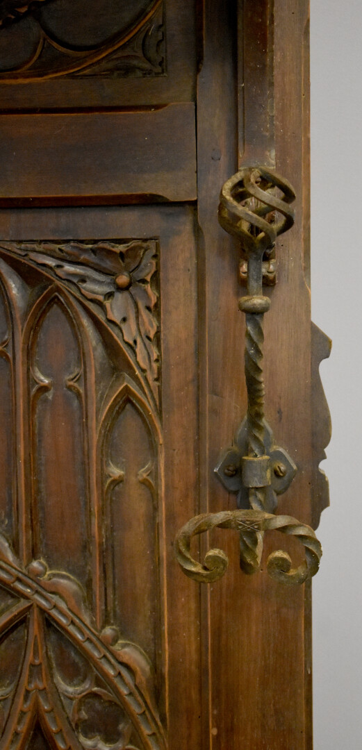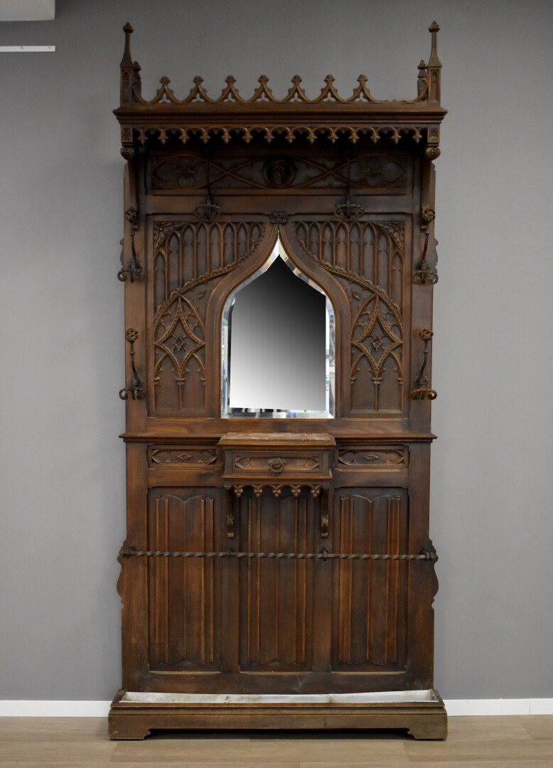 Meuble d’entrée porte-manteaux en noyer et hêtre sculpté teinté à décor dans le goût troubadour, arcades, plis de serviettes (un manque). Les patères en métal torsadé. Le centre ceint d’une glace biseautée. Il ouvre à un petit tiroir. La base porte-parapluie en zinc. Travail dans le goût troubadour, fin du XIXe ou début du XXe siècle. Haut. : 244 cm – Larg. : 119 cm – Prof. : 22 cm.