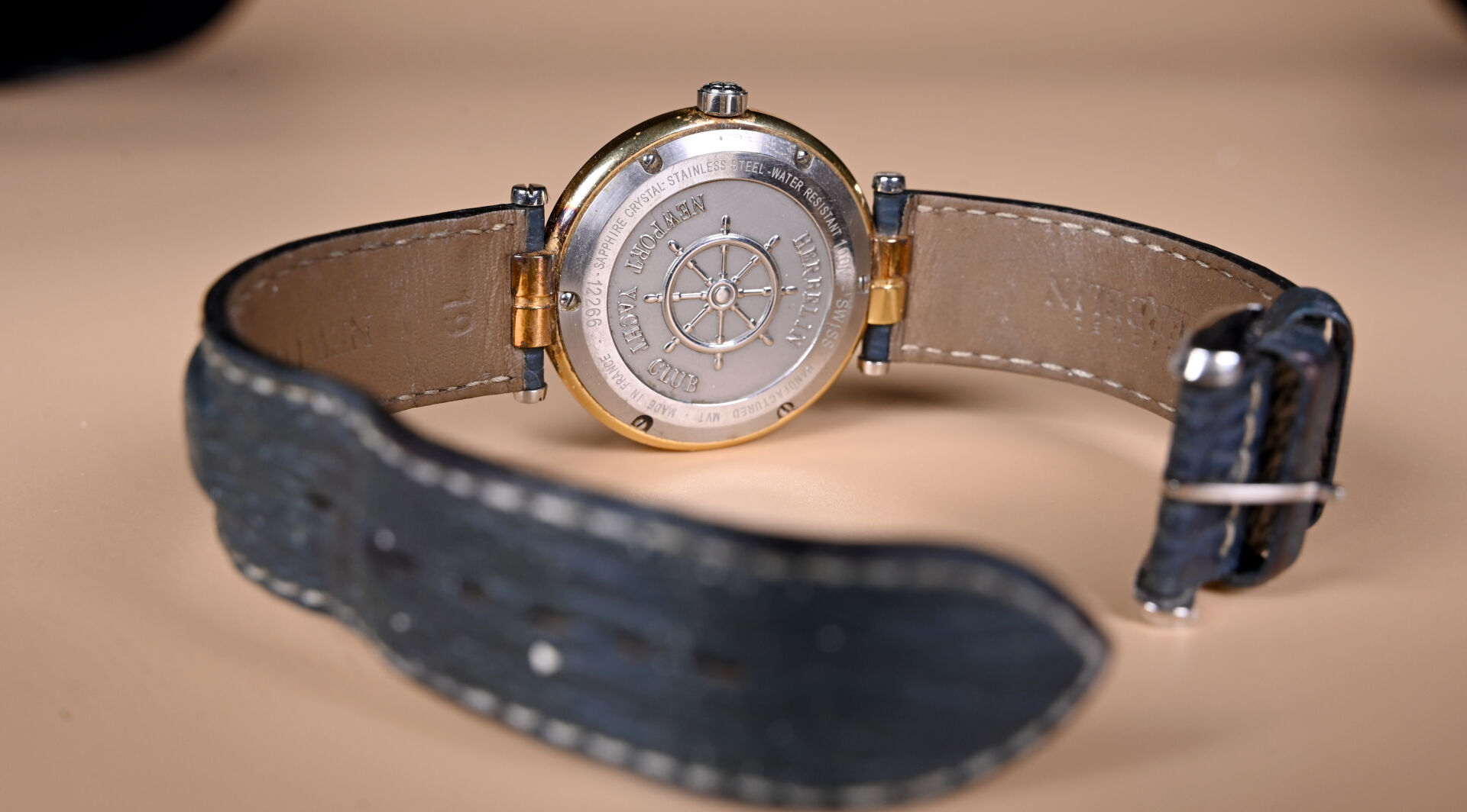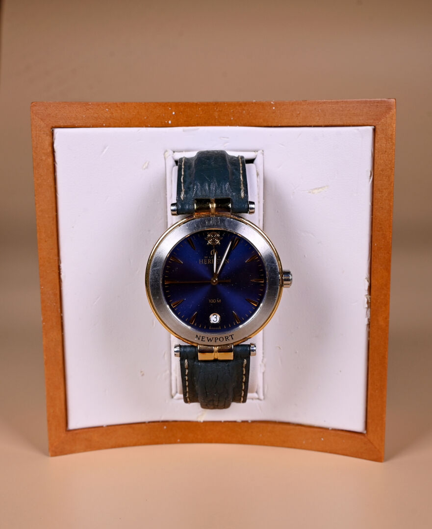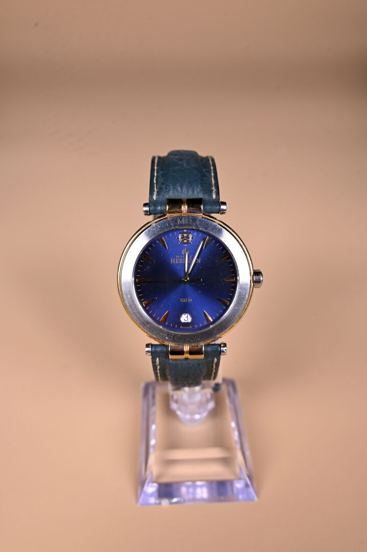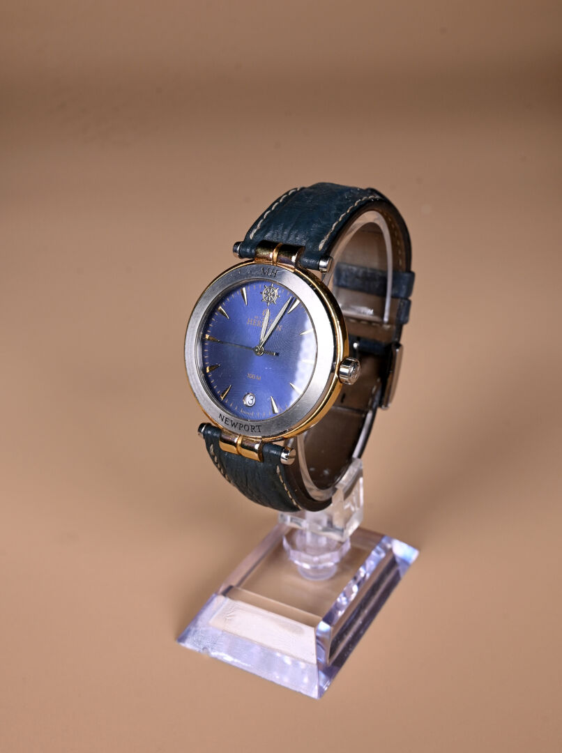 MICHEL HERBELIN. Montre bracelet d’homme modèle « Newport Yacht Club » à boitier rond bicolore. Cadran signé à fond bleu avec barre à midi et le guichet dateur à 6H. Mouvement quartz. Bracelet d’origine en cuir vert sur boucle ardillon. Boitier 35 mm. A reviser, bracelet usé. Avec boite, certificat et écrin (usures).