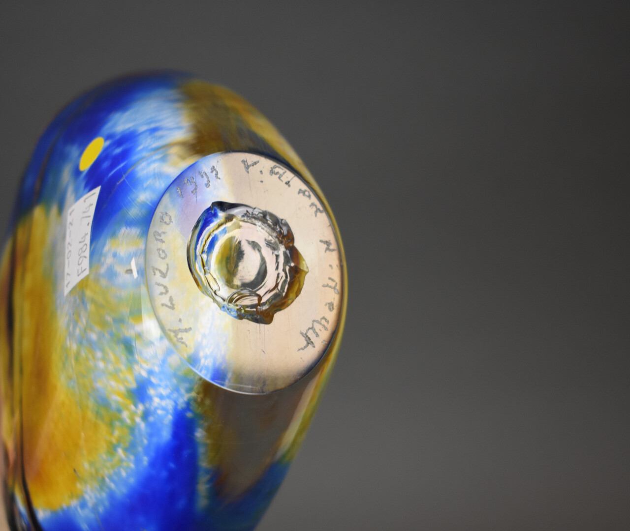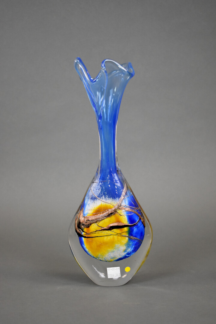 Michèle LUZORO (Née en 1949). Vase à haut col en verre somerso bleu jaune et or. Signé et daté 1999 sous la base. Haut. : 36 cm.
