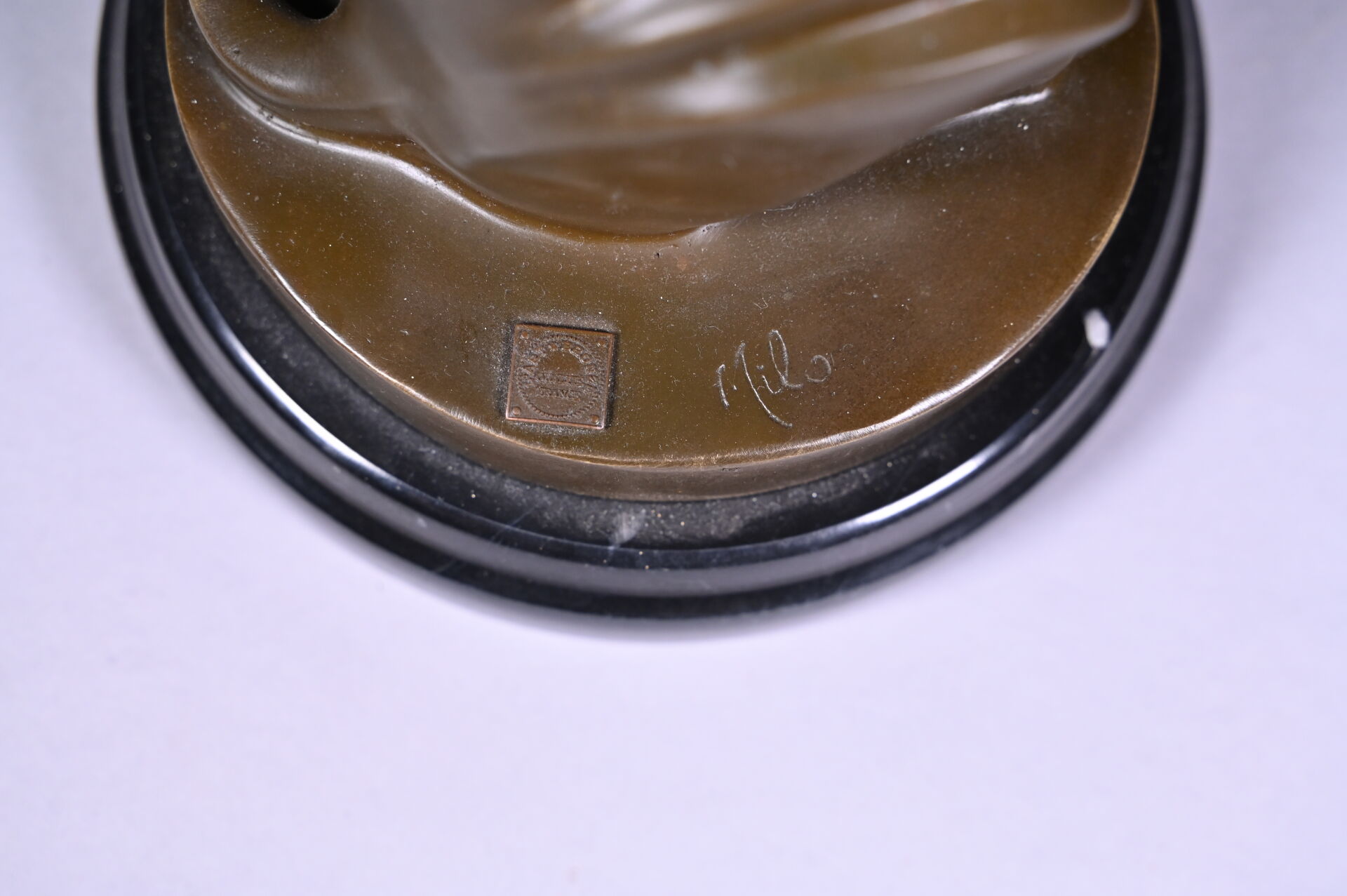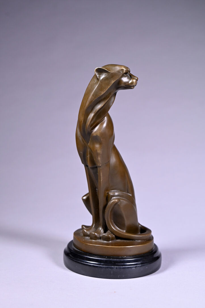 MILO (XXe siècle). Guépard en bronze patiné brun (légères usures). Signé sur la terrasse à la pointe avec un cachet moderne, la base à gradin en marbre noir. Travail moderne. Haut. : 31,5 cm.