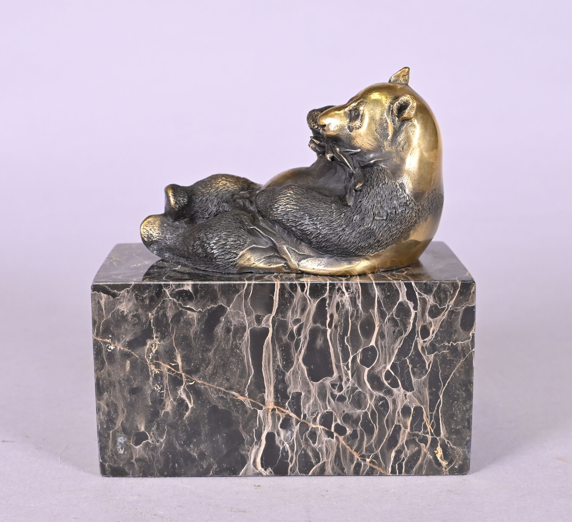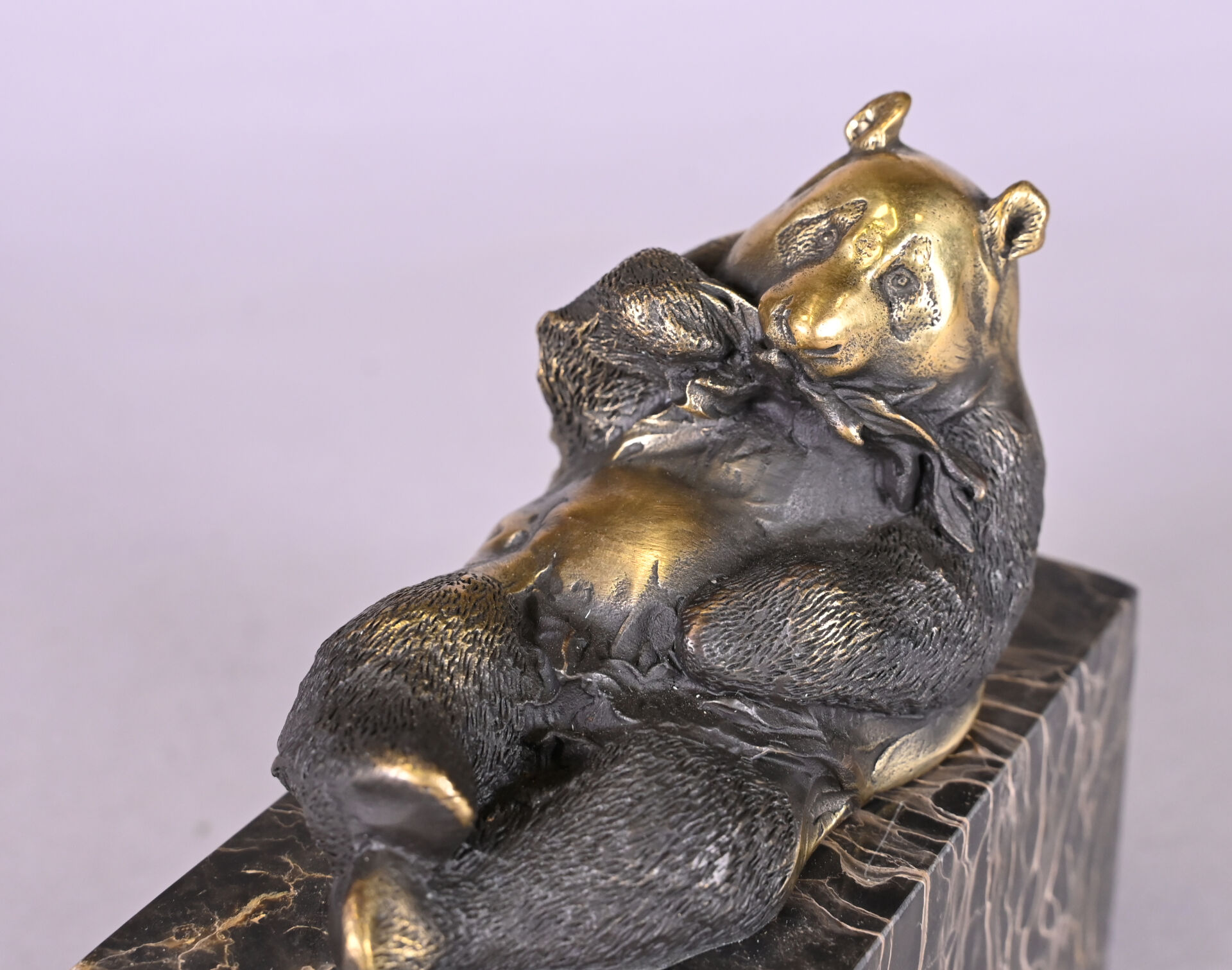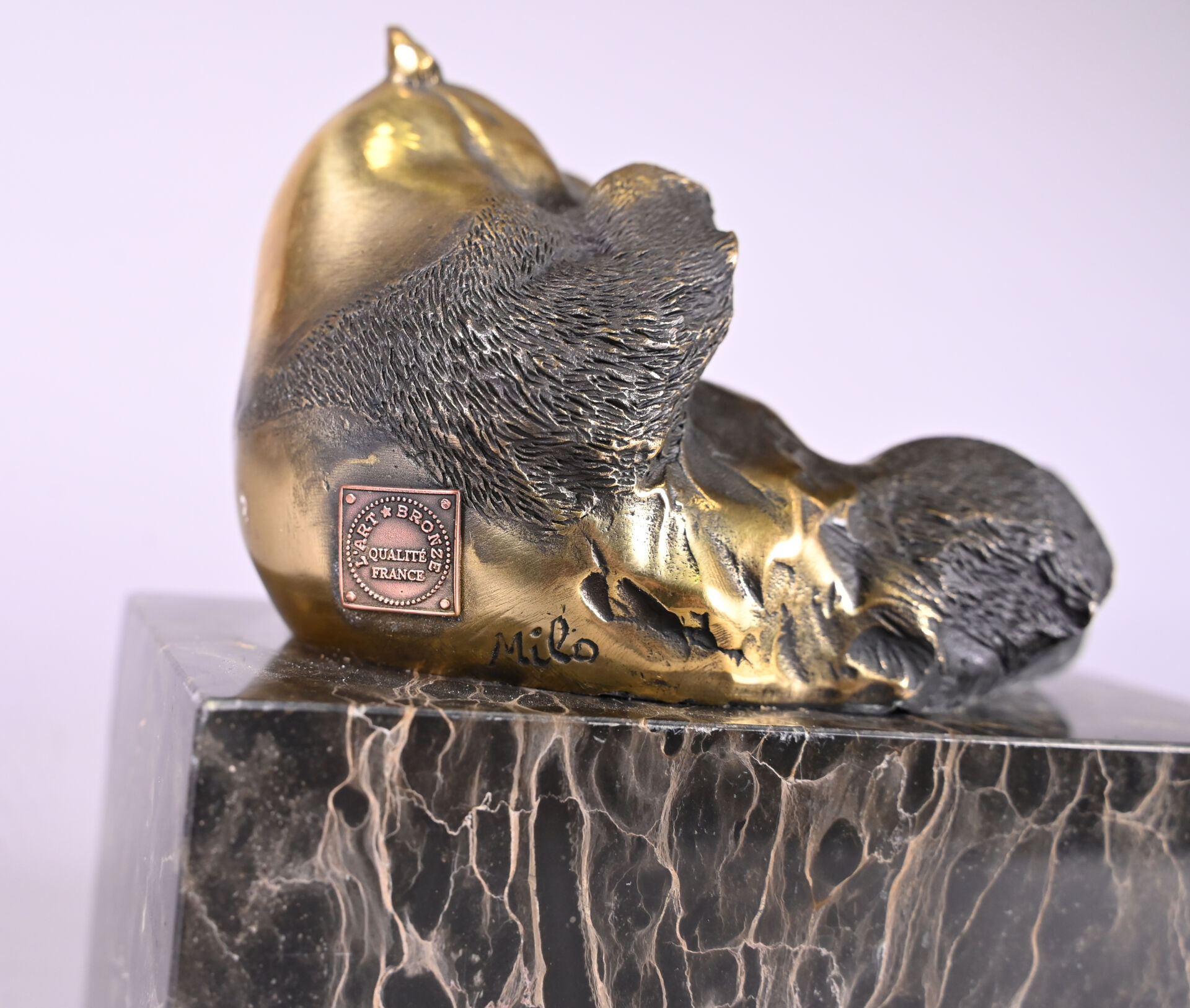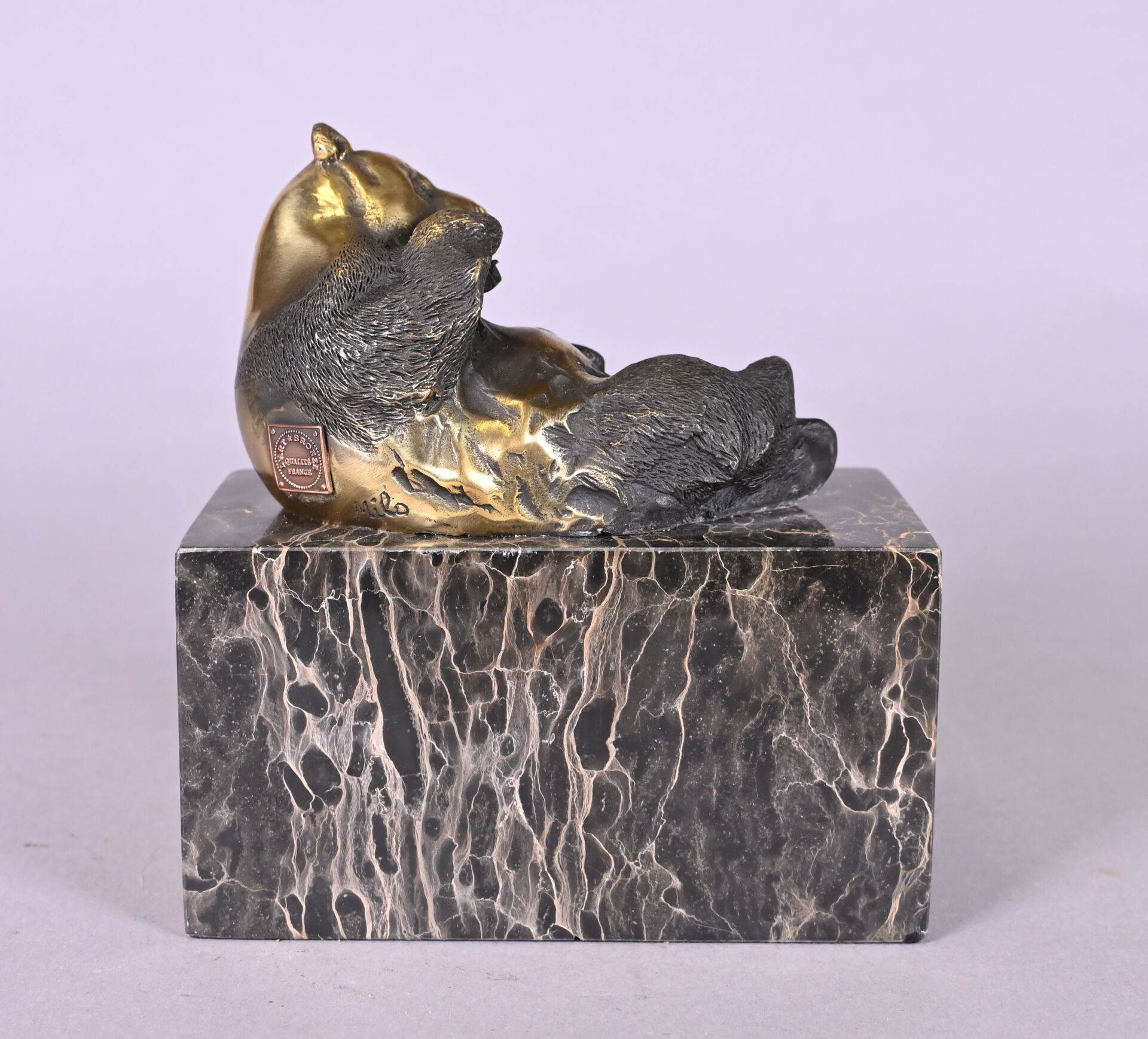MILO (XXe siècle). Panda en bronze patiné brun. Signé à la base et cachet. Socle de marbre portor. Haut. : 14 cm.