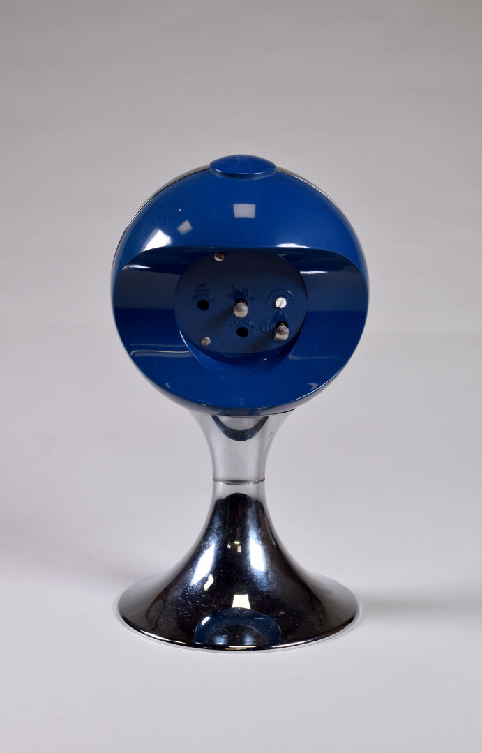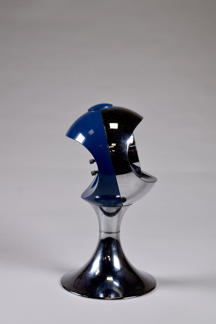 MIRAGE. Réveil sur pied en plastique chromé et bleu. Cadran signé sur fond bleu à chiffres arabes. Dans le goût des années 1970. Haut. : 21,5 cm.