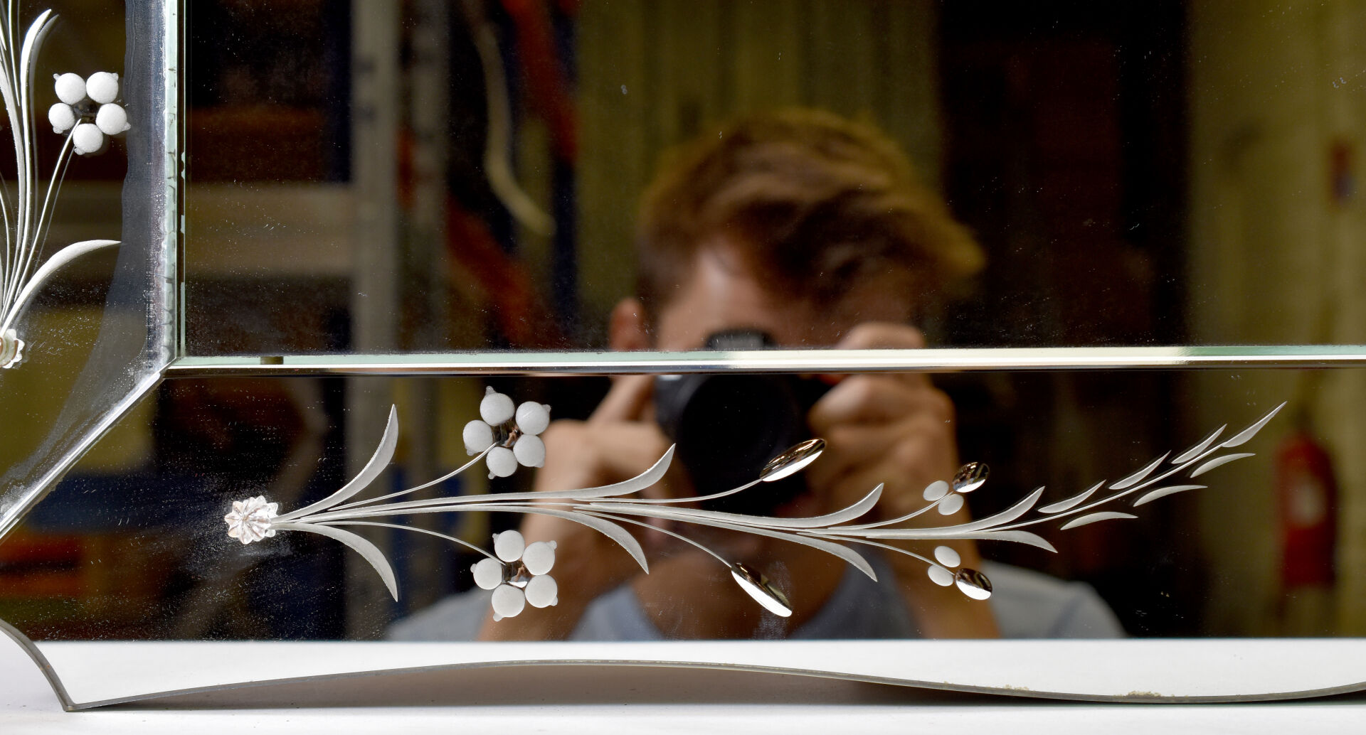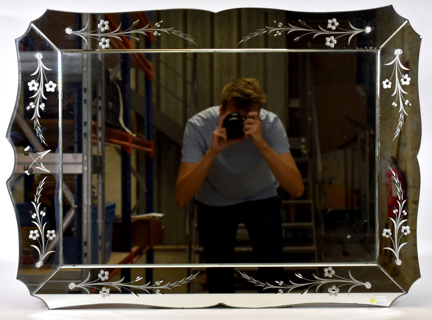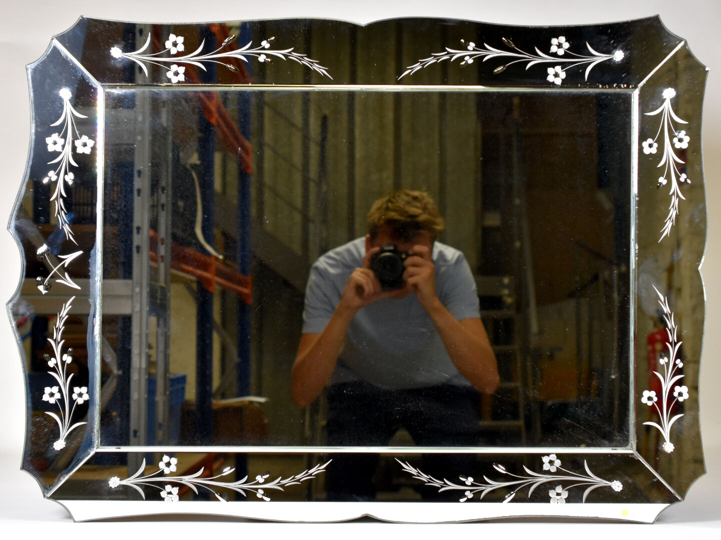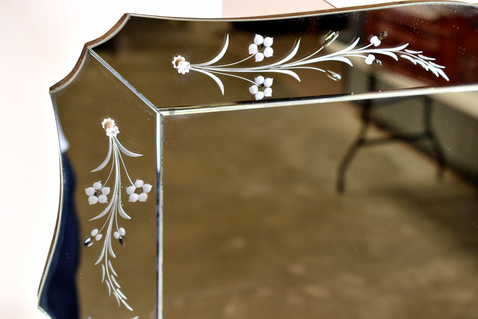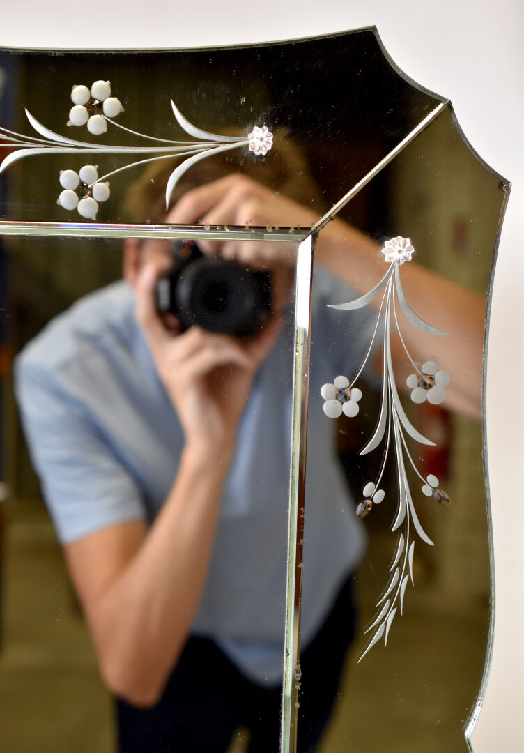 Miroir à parecloses, de forme violoné à décor gravé de fleurs. Travail moderne, dans le goût de Murano. 61 x 85 cm.