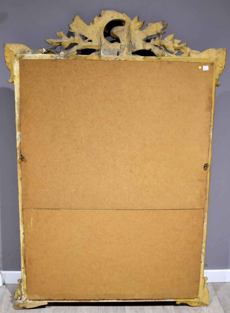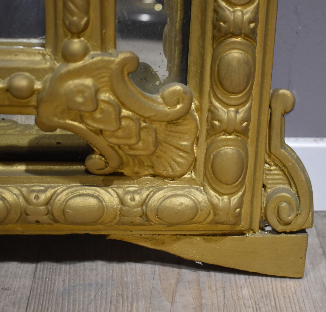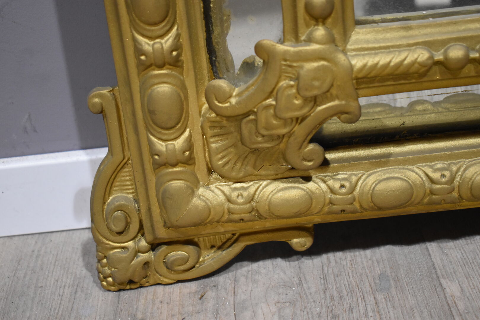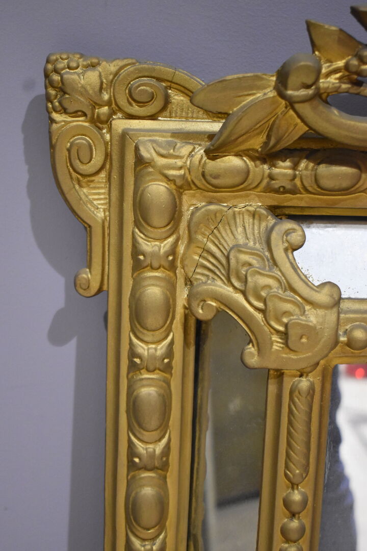 Miroir à parecloses en bois et composition dorés (éclats et manques, quelques restaurations). Vers 1900. 117 x 80 cm.