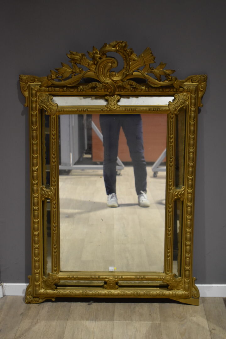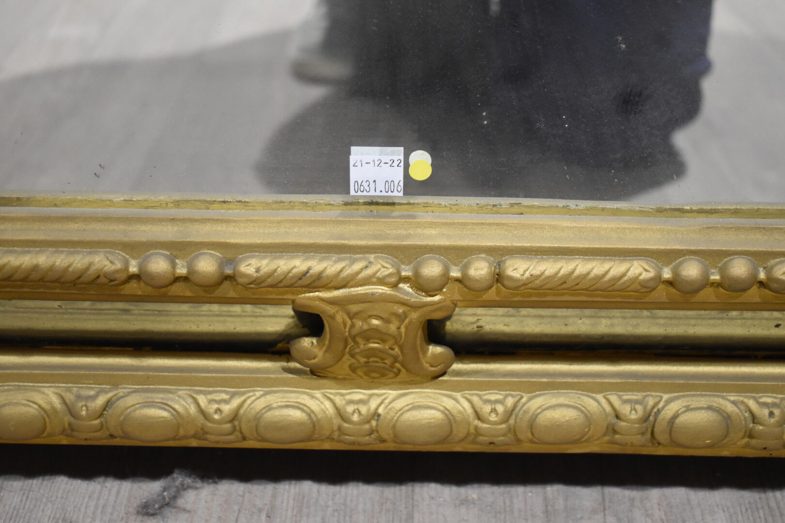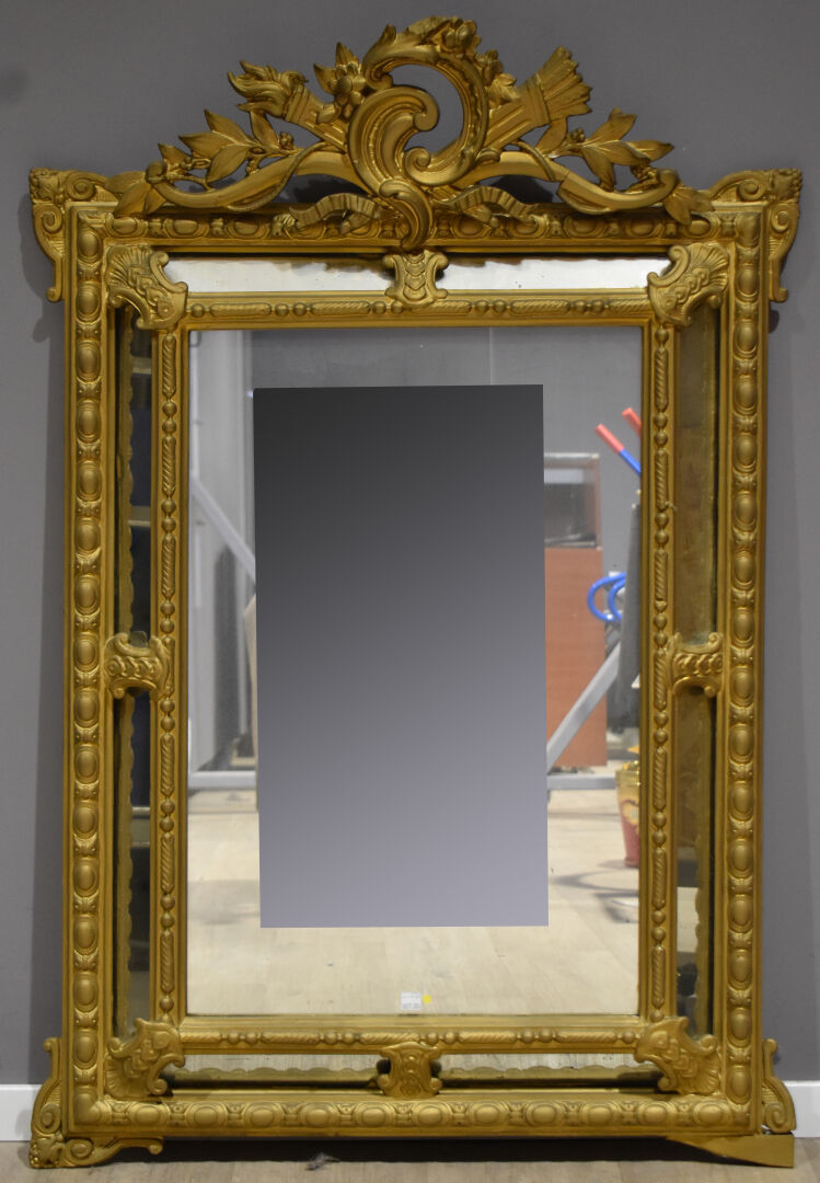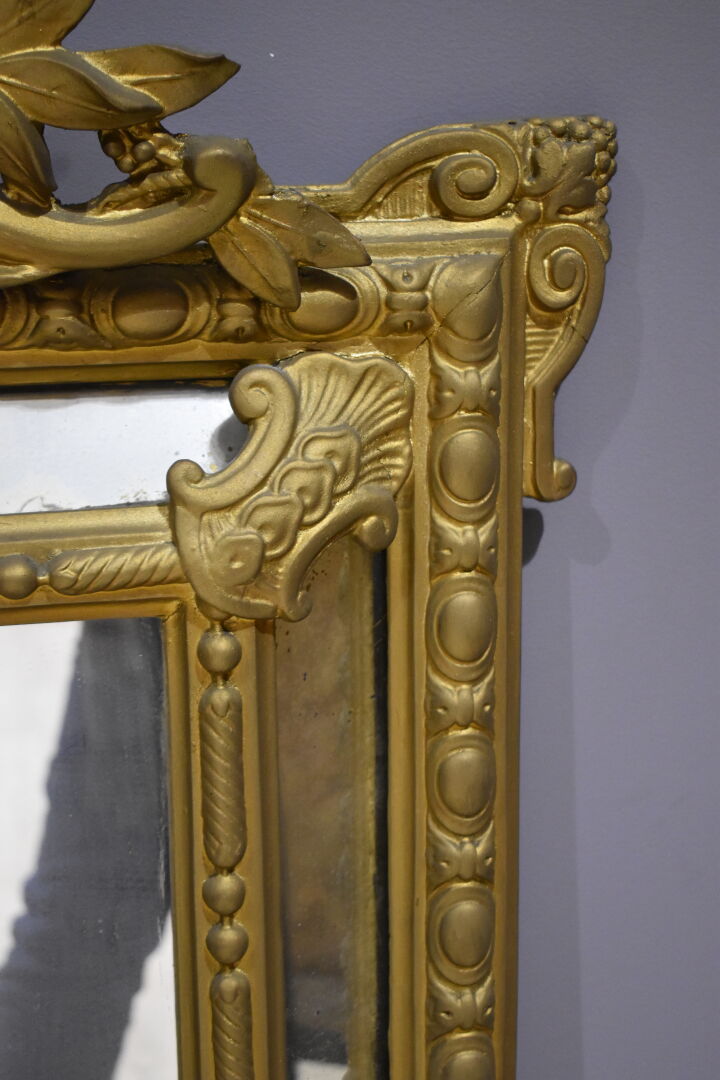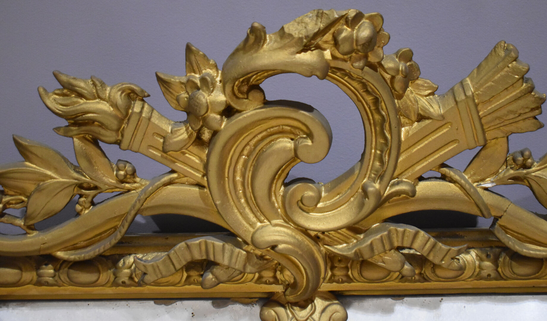 Miroir à parecloses en bois et composition dorés (éclats et manques, quelques restaurations). Vers 1900. 117 x 80 cm.