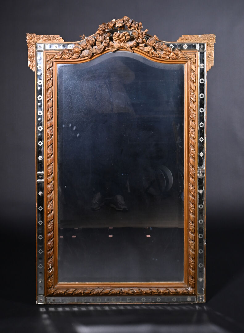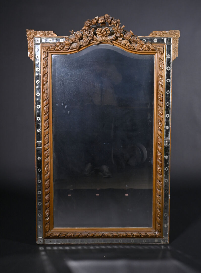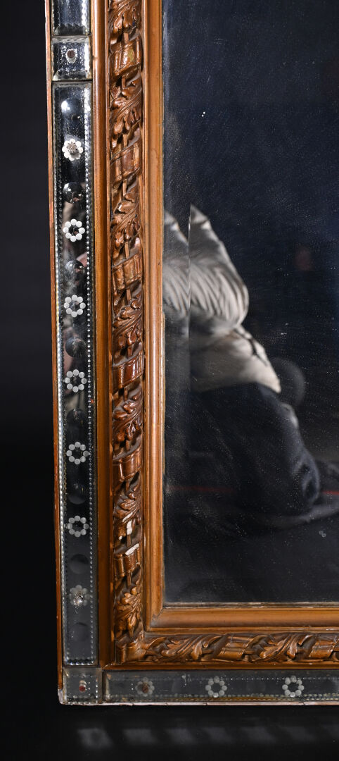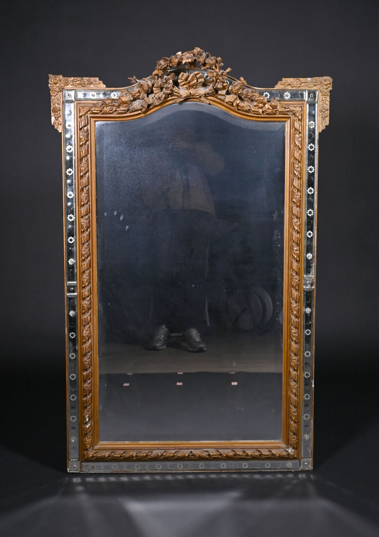 Miroir à parecloses en bois et stuc dorés, le fronton orné d’une couronne de fleurs et ruban (éclats et manques). Fin du XIXe siècle. 146 x 95 cm.