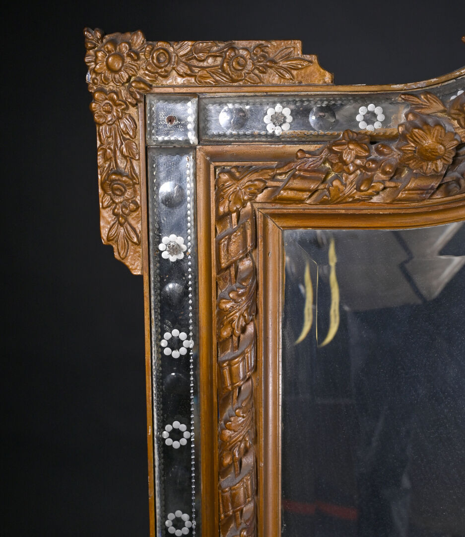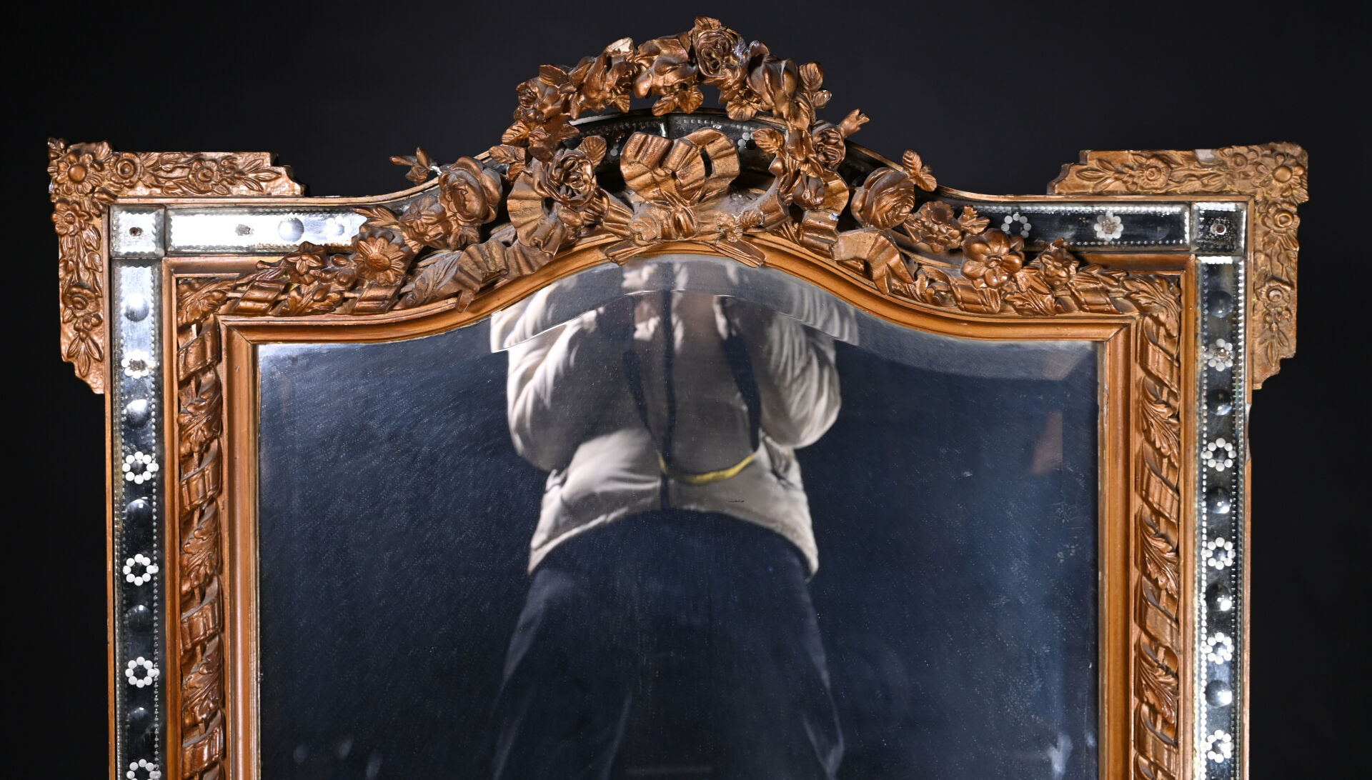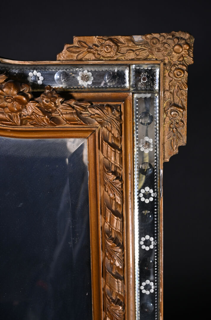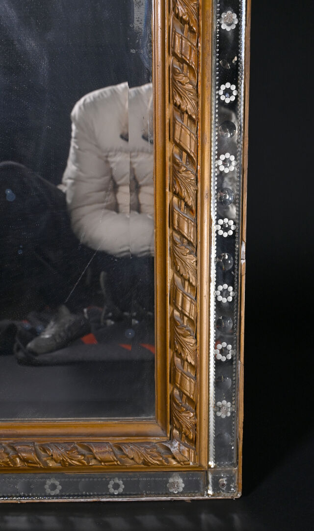 Miroir à parecloses en bois et stuc dorés, le fronton orné d’une couronne de fleurs et ruban (éclats et manques). Fin du XIXe siècle. 146 x 95 cm.