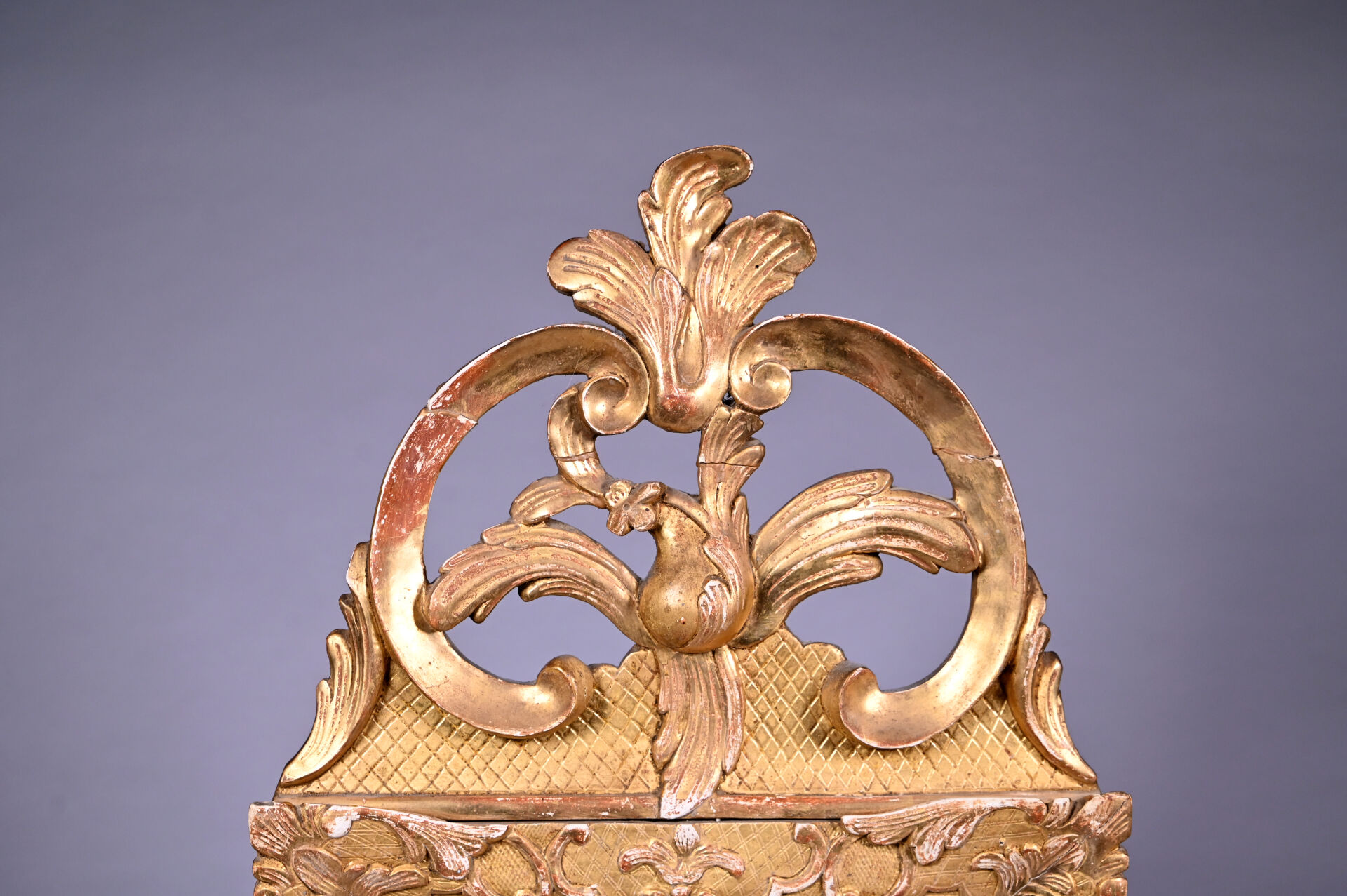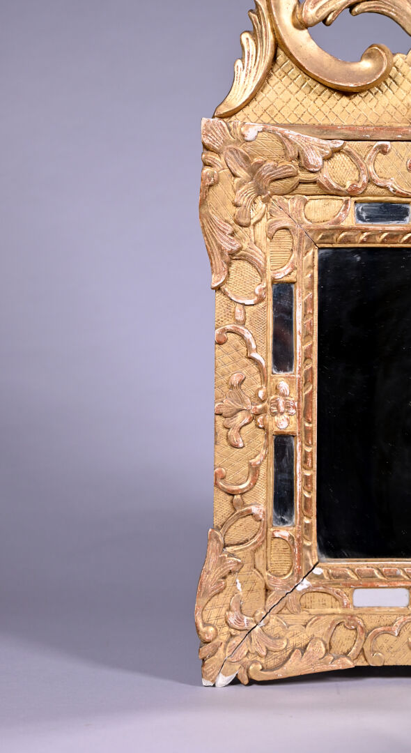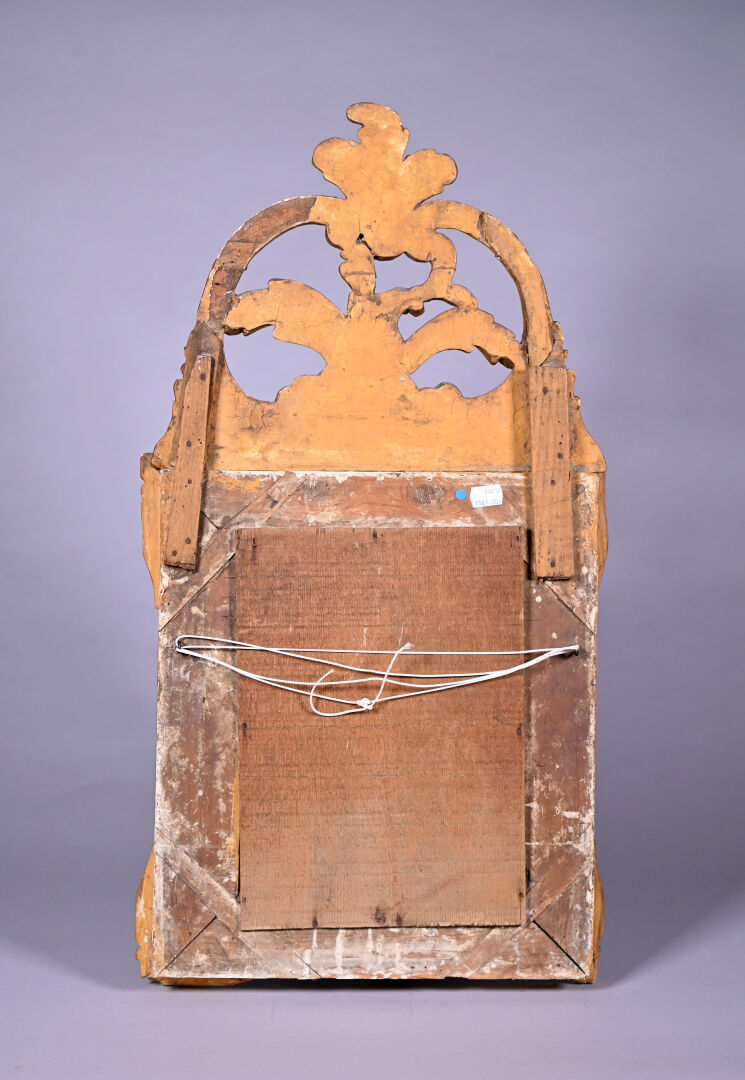 Miroir à parecloses en bois sculpté doré, le fronton ajouré d’une palmette (éclats,fentes et usures, restaurations). XVIIIe siècle. 70 X 38 cm.