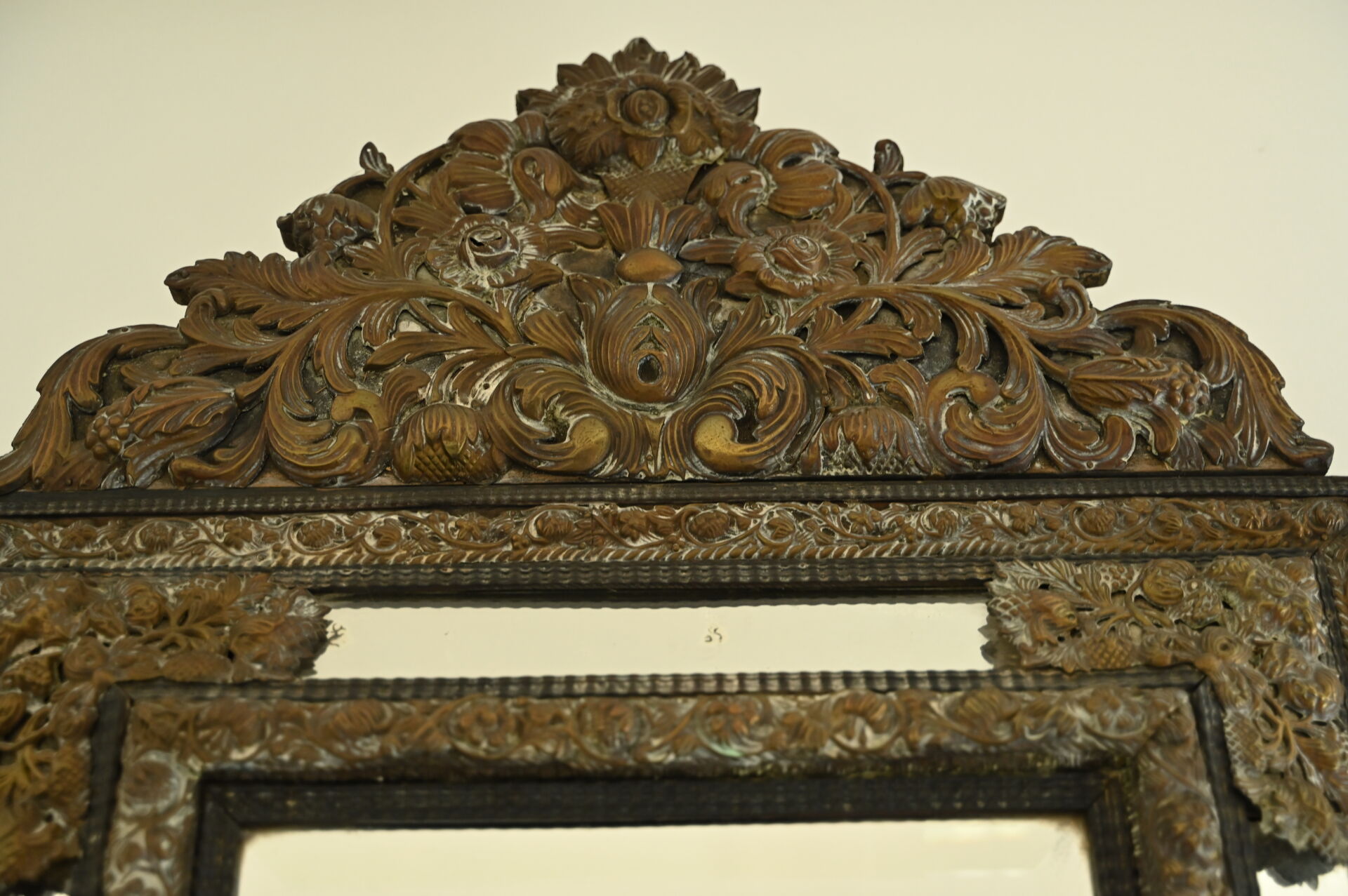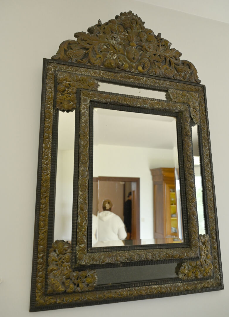 Miroir à parecloses en laiton estampé dans le goût hollandais. Usures d’usage. 121×78 cm.