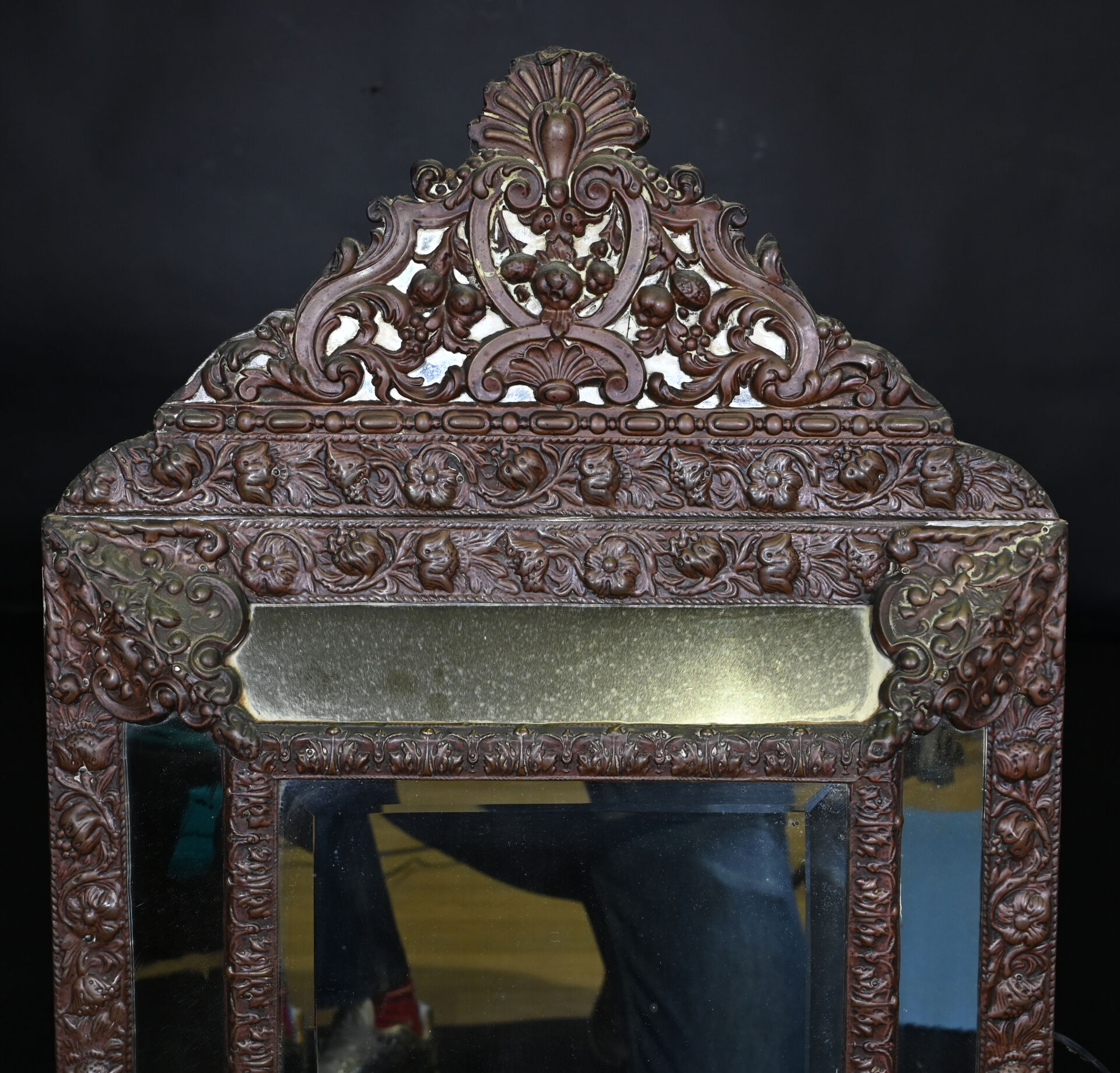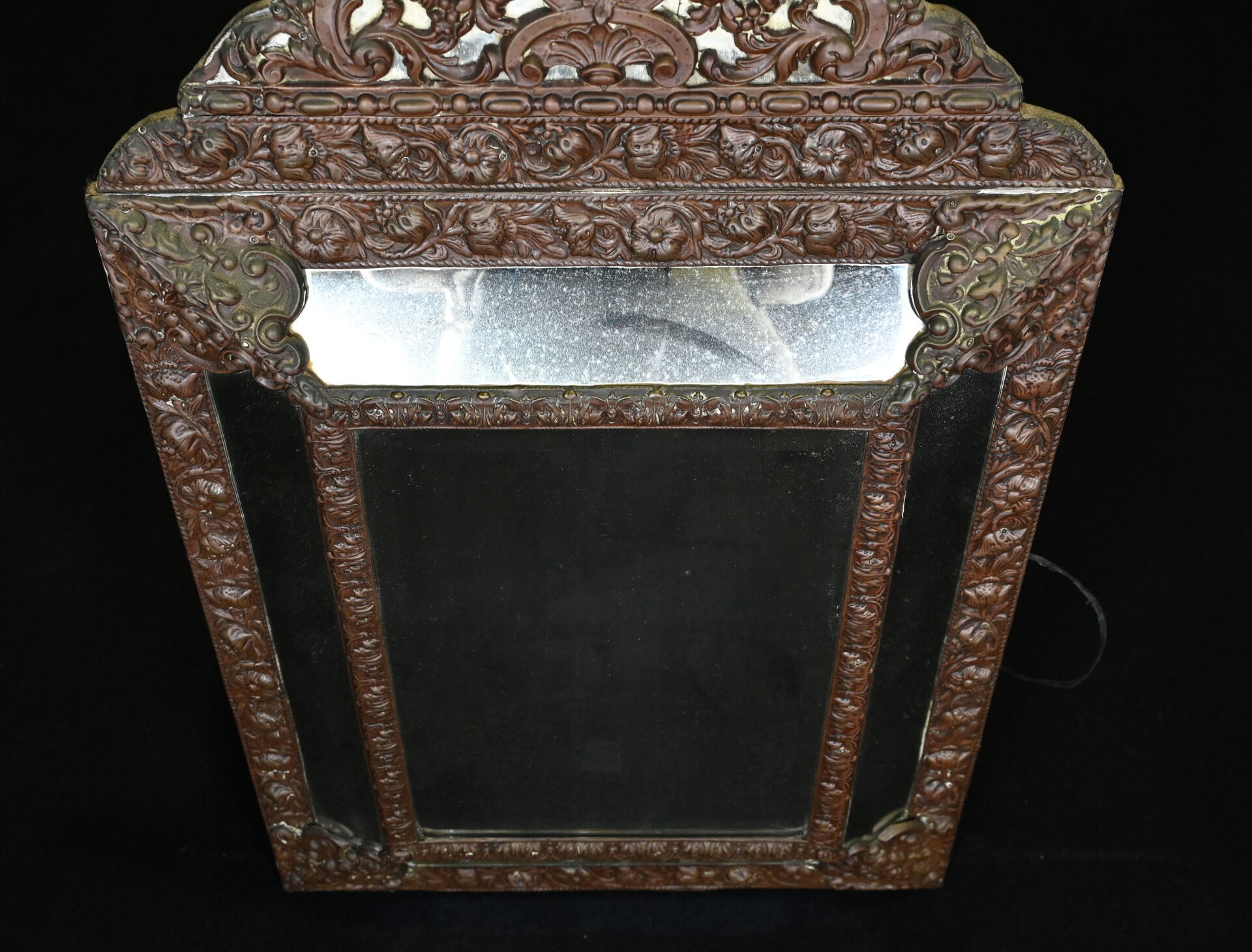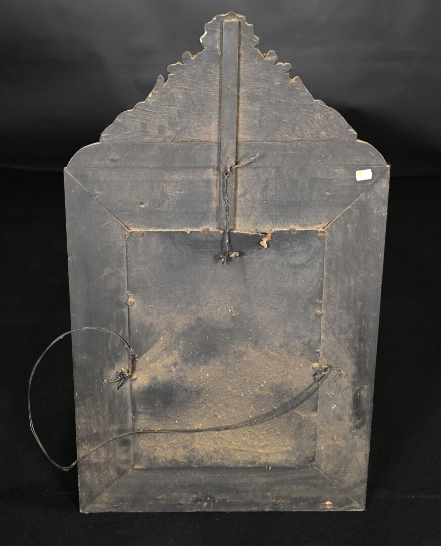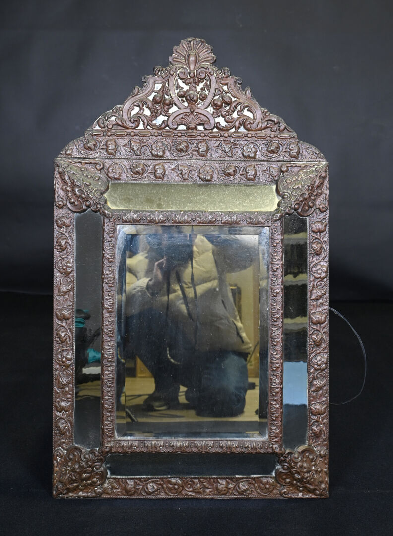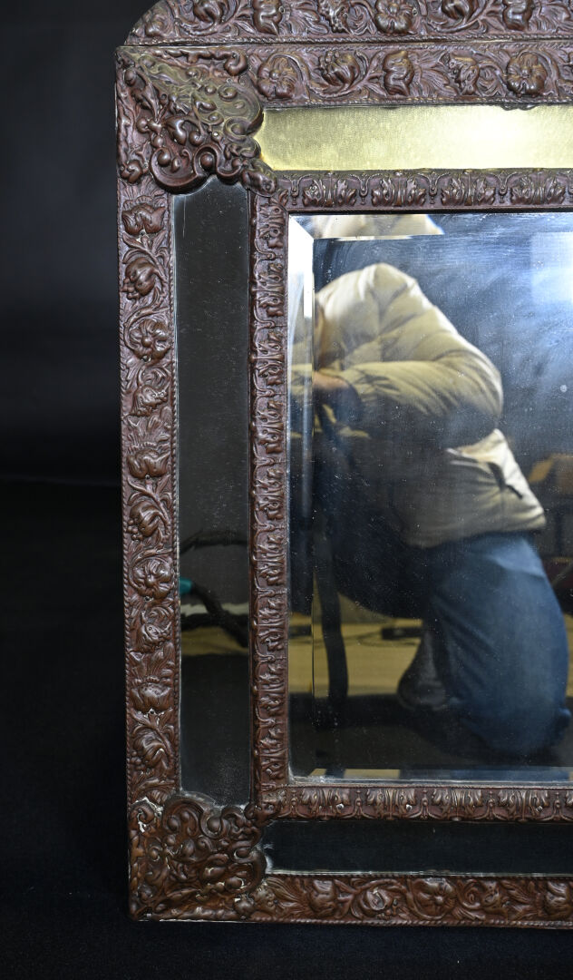 Miroir à parecloses en laiton estampé. Travail hollandais, XIXe siècle. 88 x 53 cm.