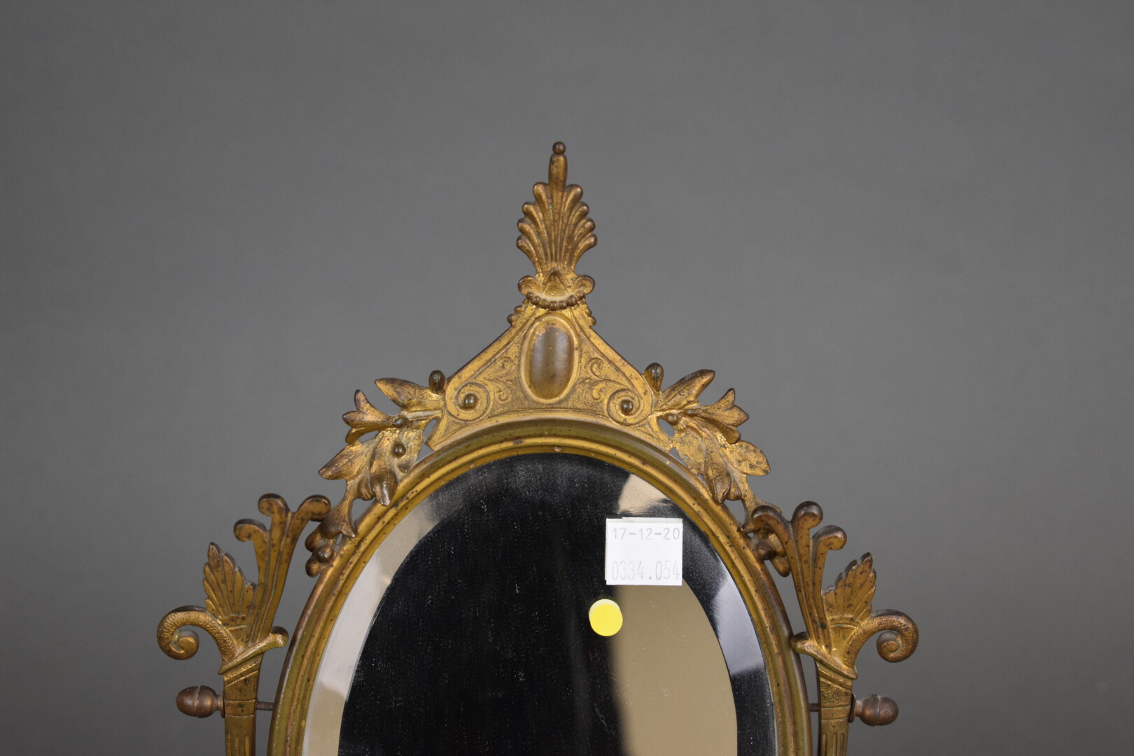 Miroir à poser en bronze doré et laiton à décor de palmettes et perles (usures). La glace ovale biseautée pivotante. Fin du XIXe siècle. Haut. : 37 cm.