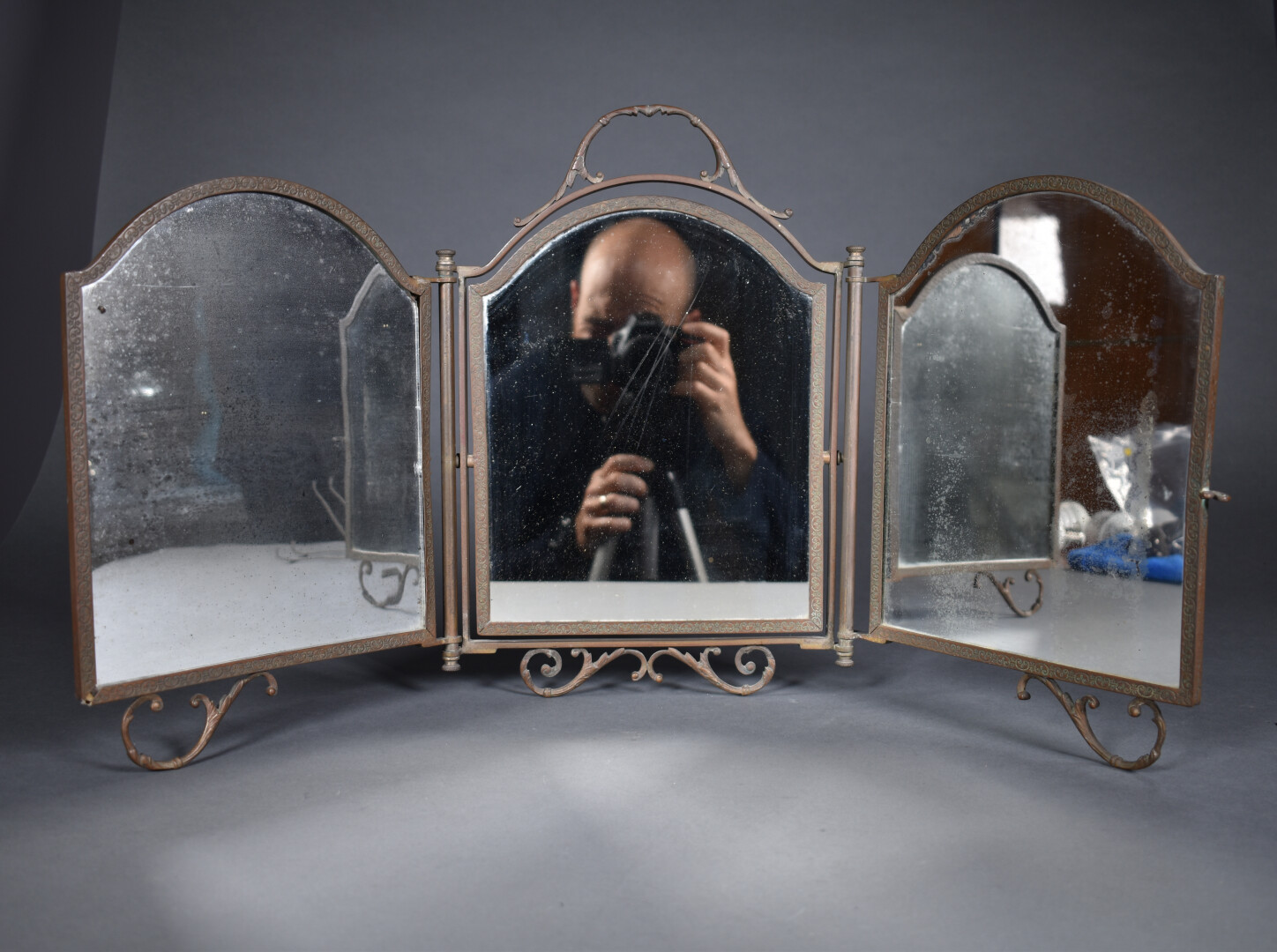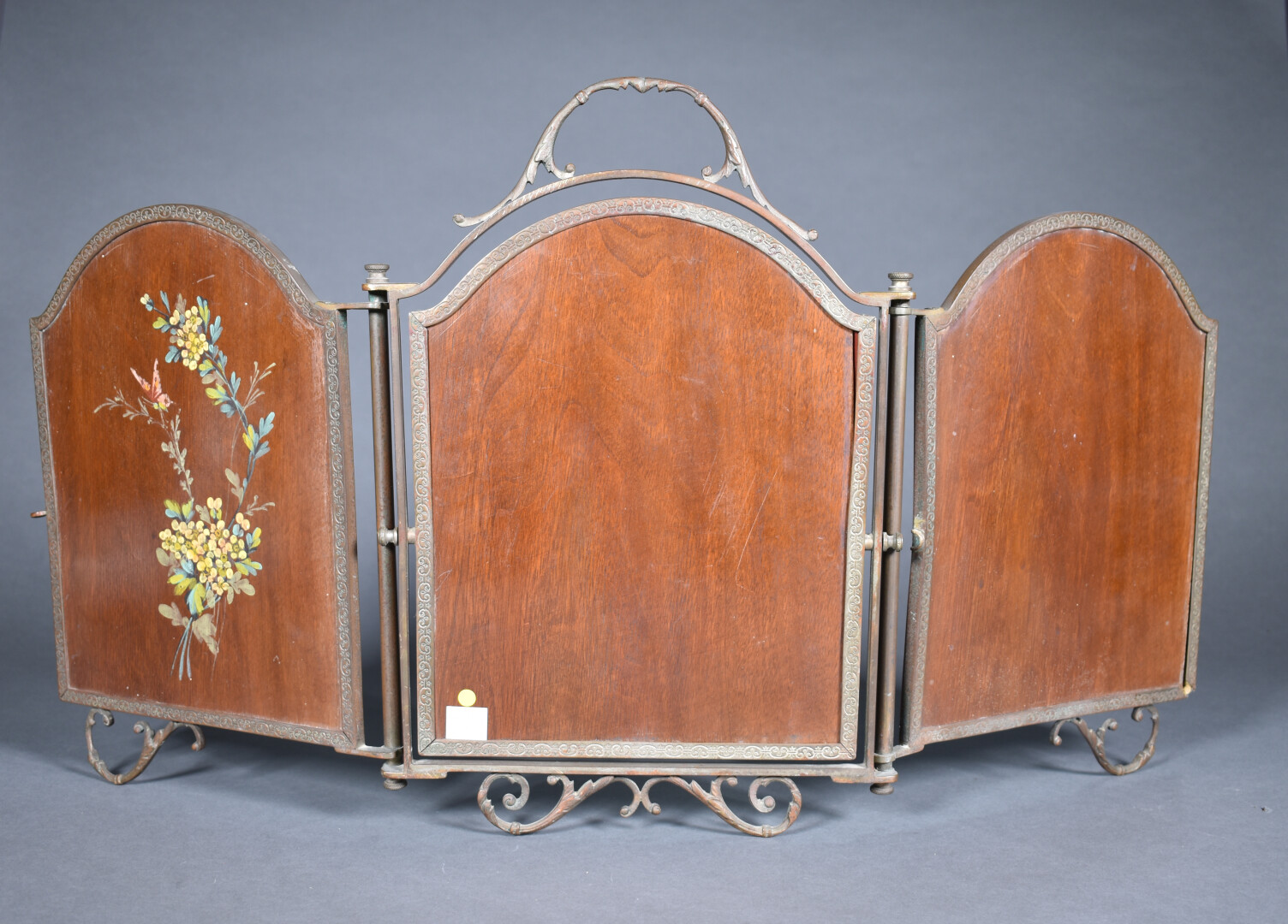 Miroir de barbier à 3 volets en laiton et bois de placage à décor peint de fleurs et papillons. Dim. fermé : Haut. : 37,5 cm – Larg. : 26 cm.