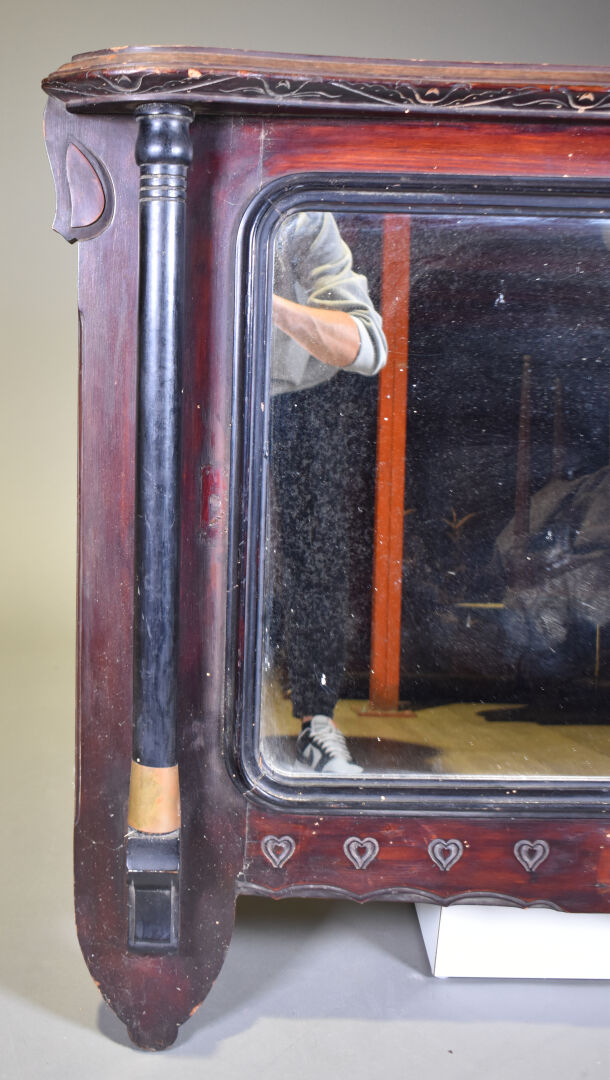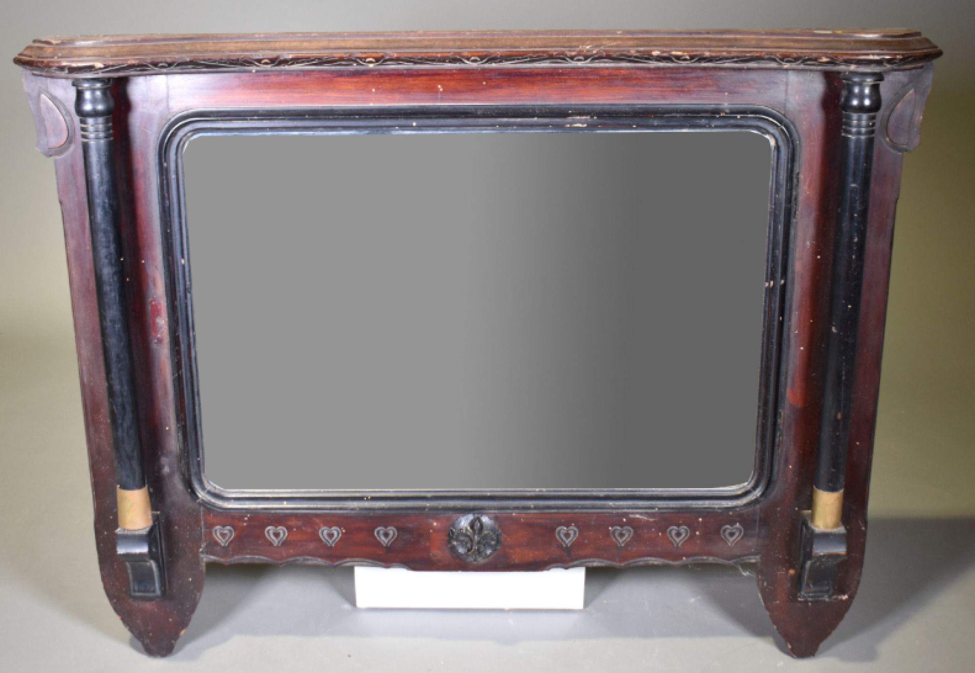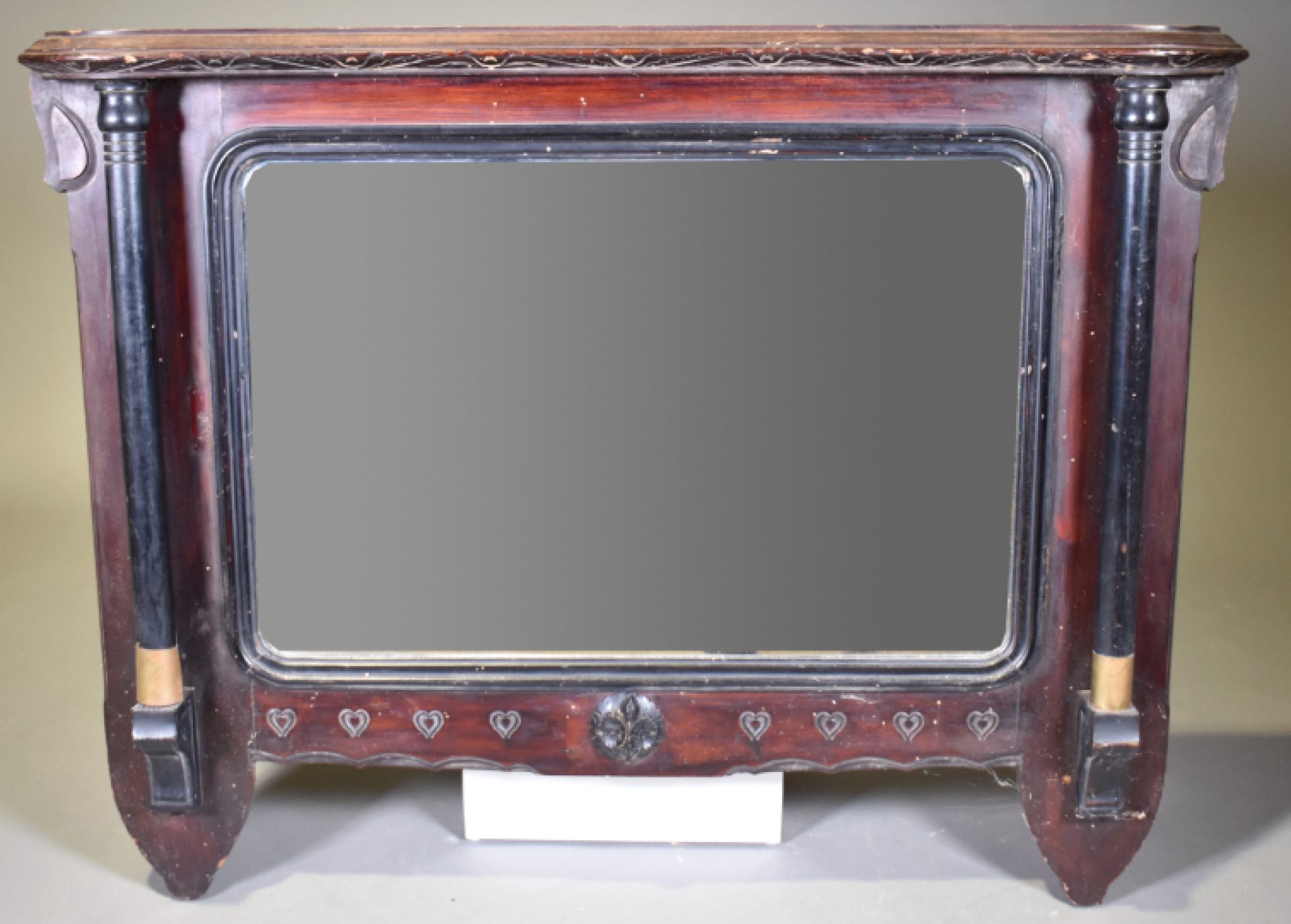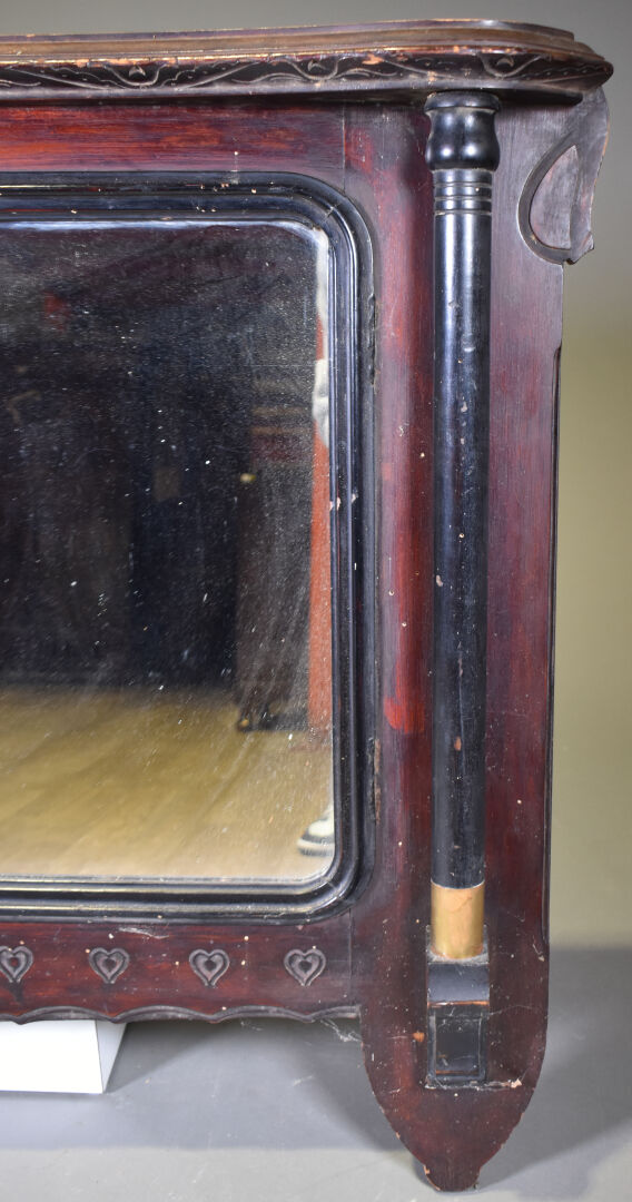 Miroir de cheminée au de coiffeuse ? en bois noirci et bois teinté gravé à deux colonnes dégagée et décor d’une frise de coeur (petits éclats et manques). Probablement vers 1900. 90 x 114 cm.