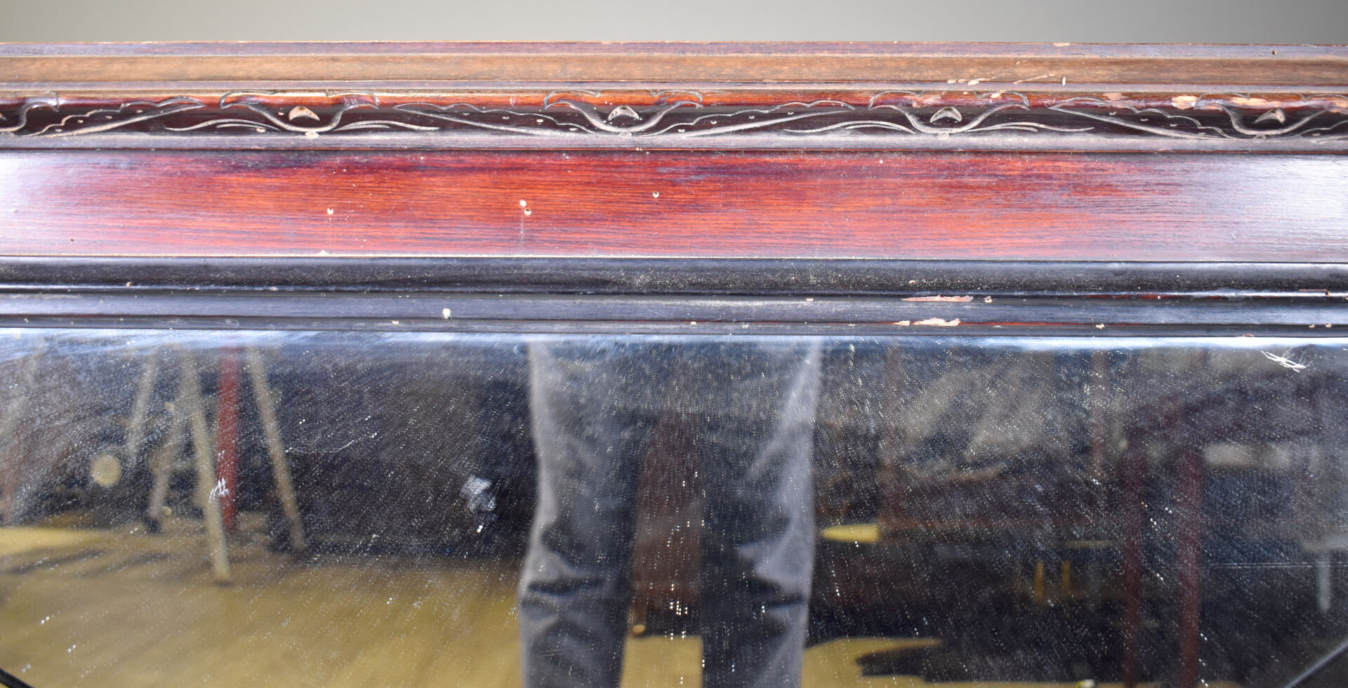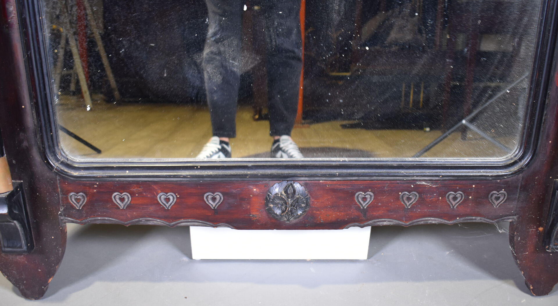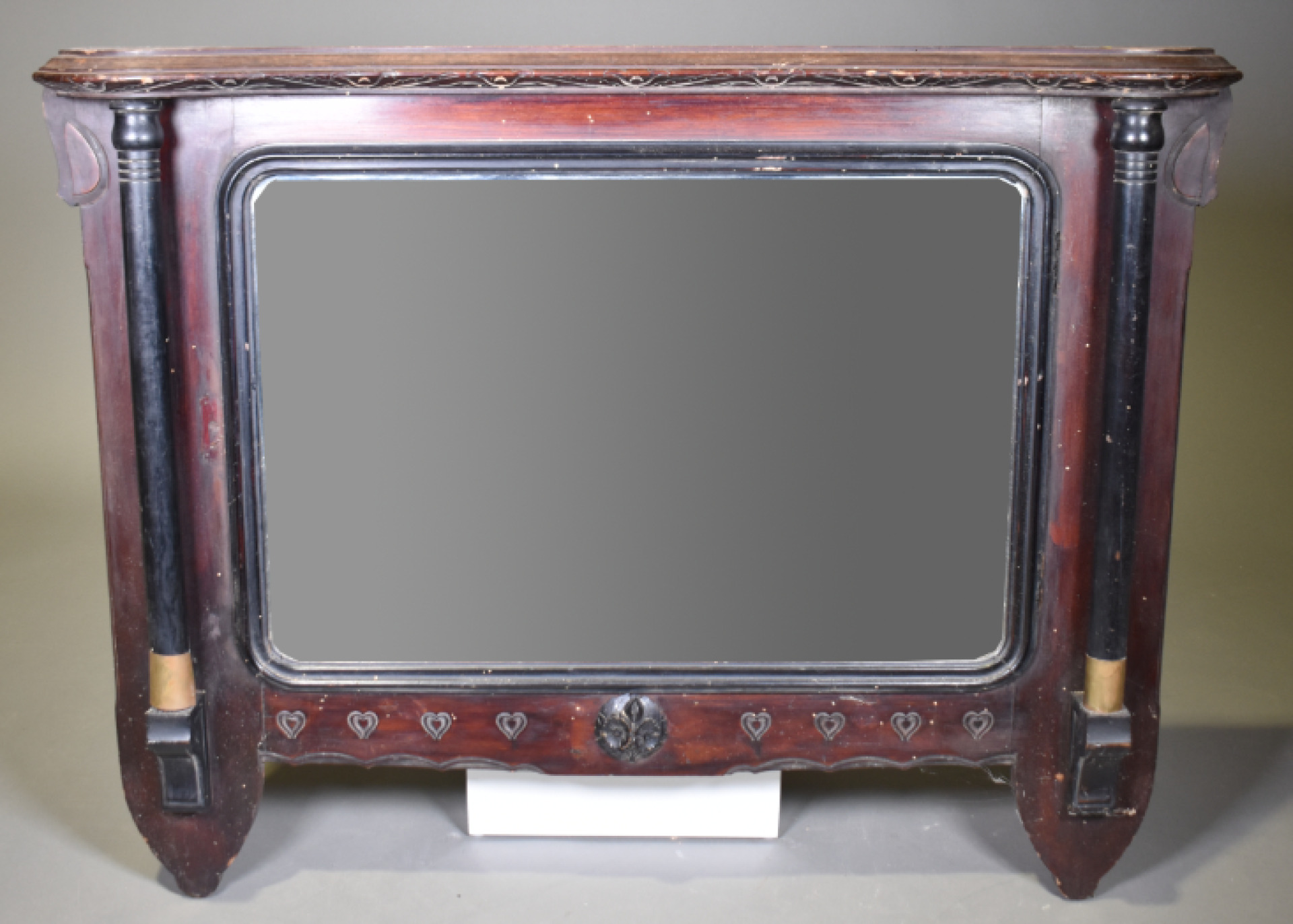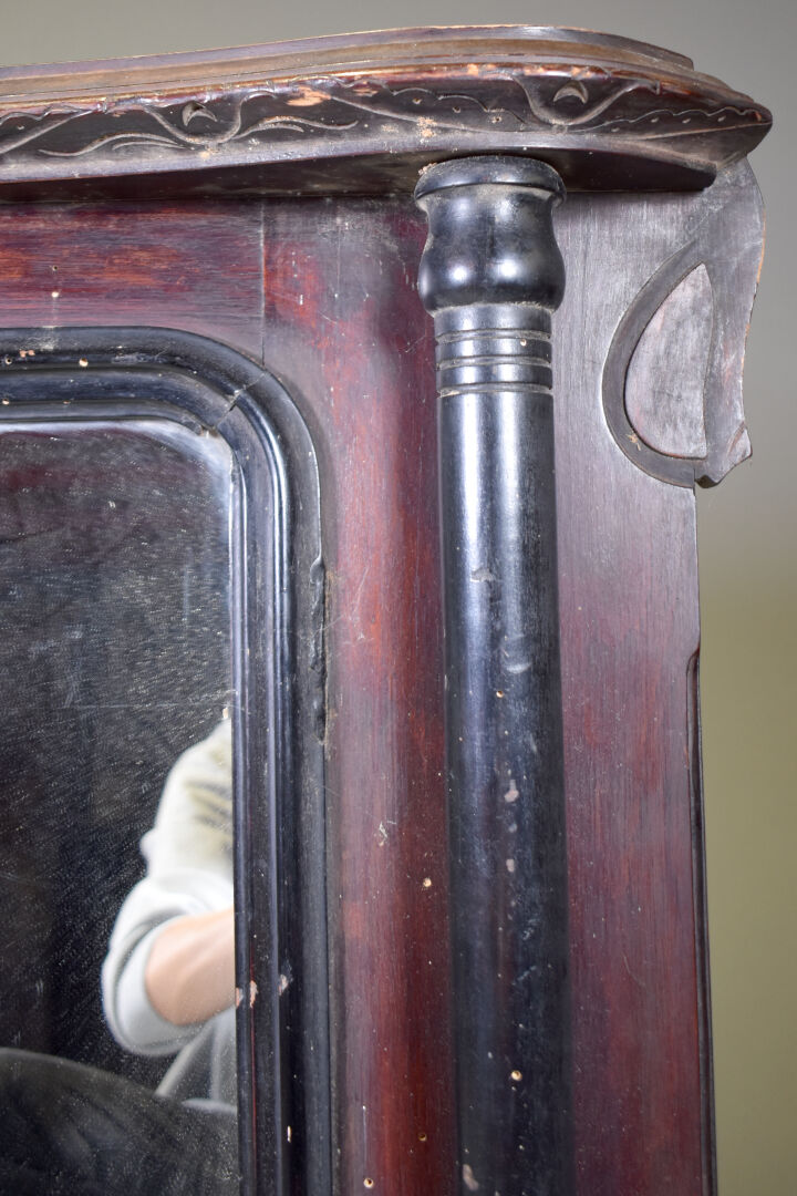 Miroir de cheminée au de coiffeuse ? en bois noirci et bois teinté gravé à deux colonnes dégagée et décor d’une frise de coeur (petits éclats et manques). Probablement vers 1900. 90 x 114 cm.