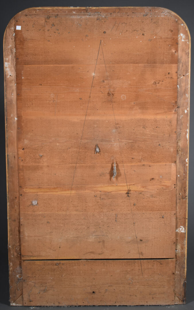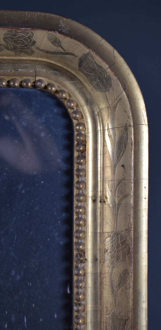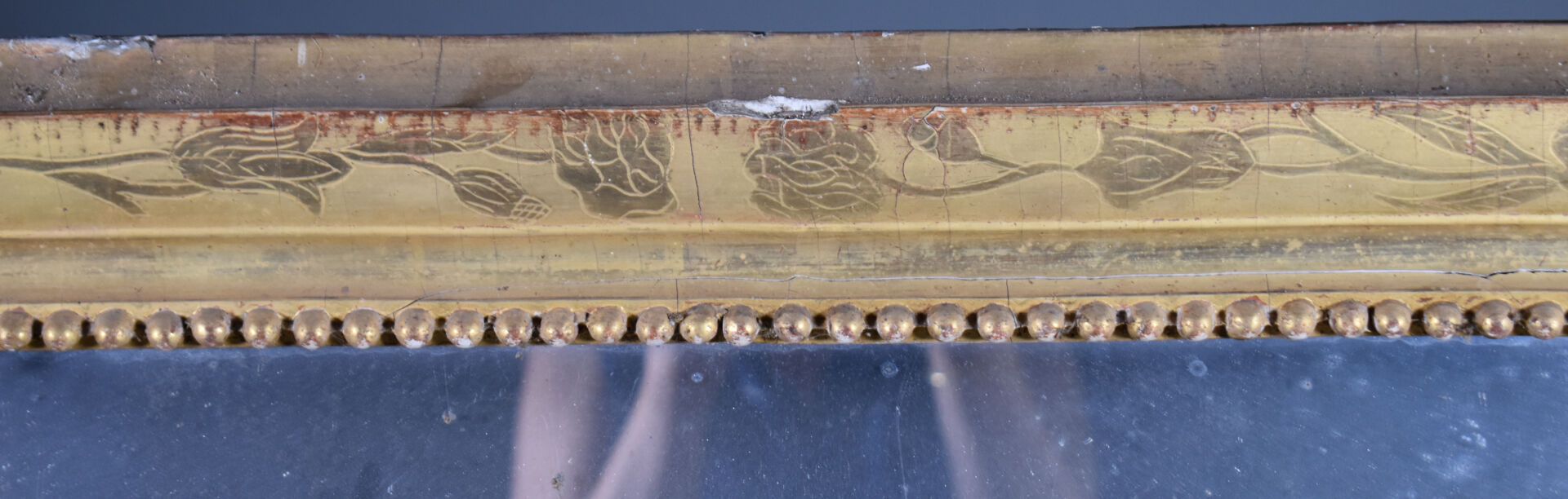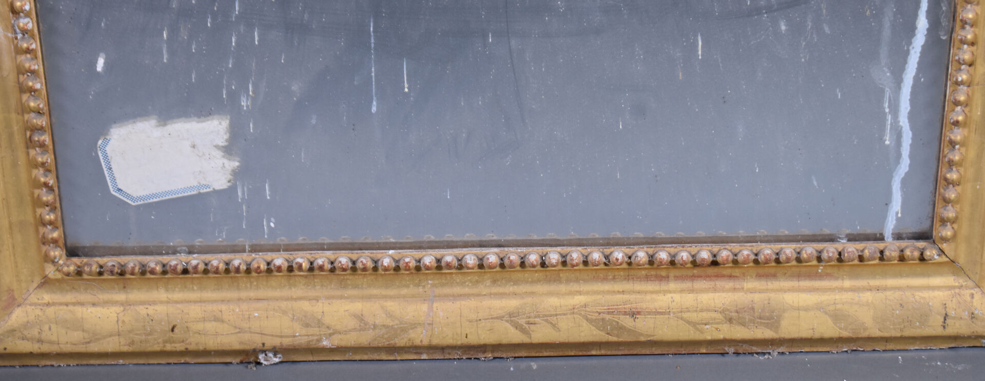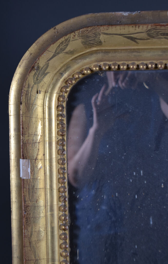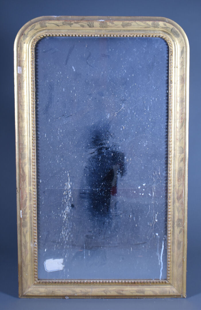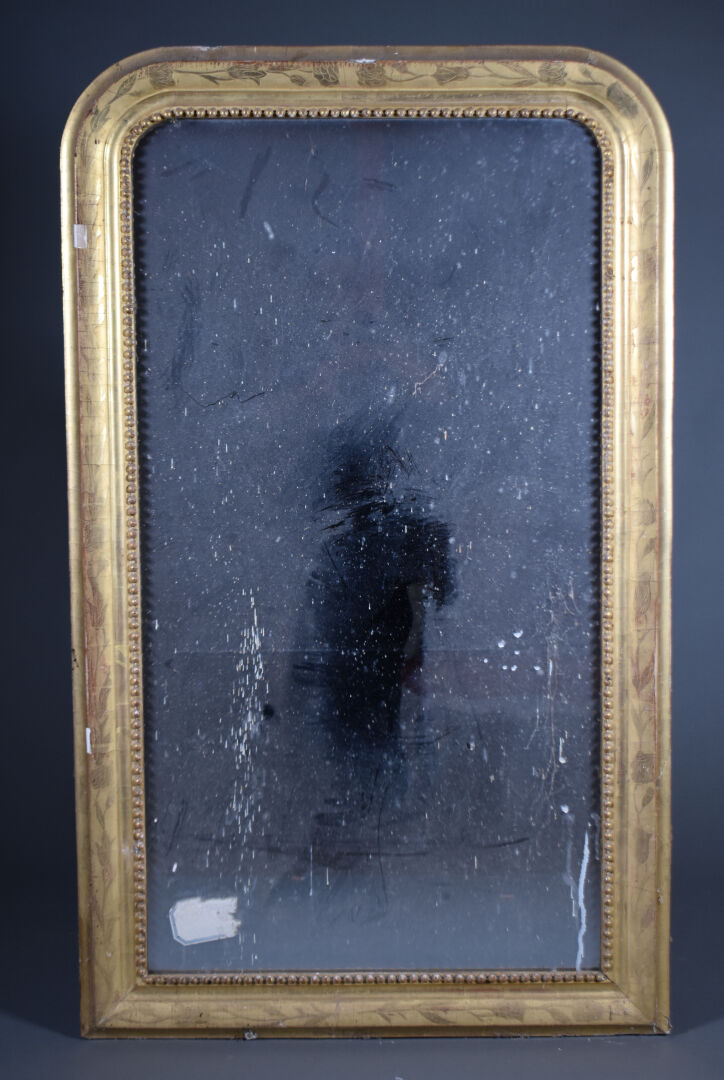 Miroir de cheminée en bois mouluré stuqué doré à décor de fleurs et frises de perles (éclats et manques). Début du XXe siècle. 137 x 83 cm.