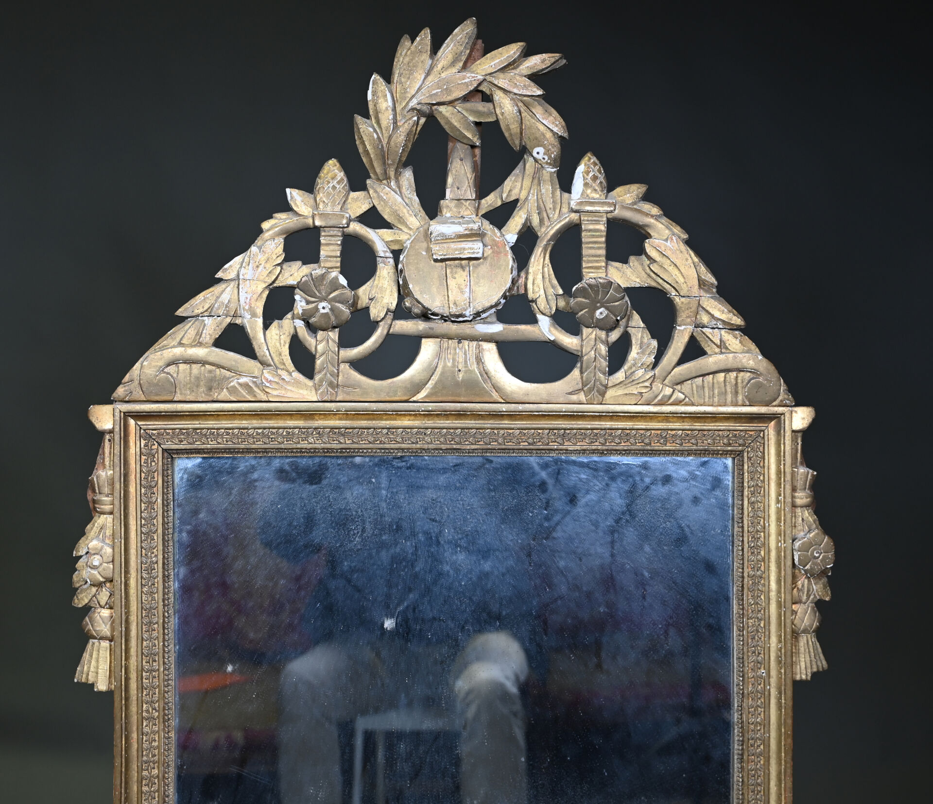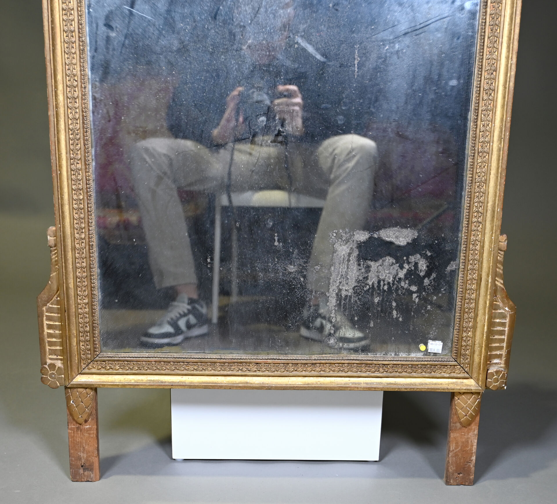 Miroir de cheminée en bois sculpté doré, le fronton orné de feuilles de laurier, fleurs et pommes de pin (éclats). Fin du XIXe ou début du XXe siècle. 142 x 73 cm.