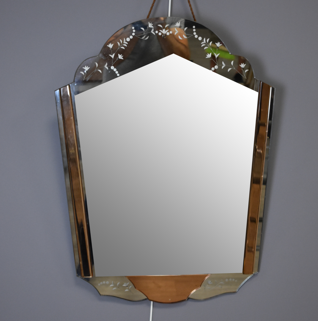 Miroir de forme libre à décor gravé de fleurs et plaques de verre rose. Travail des années 1940. 71,5 x 53,5 cm.