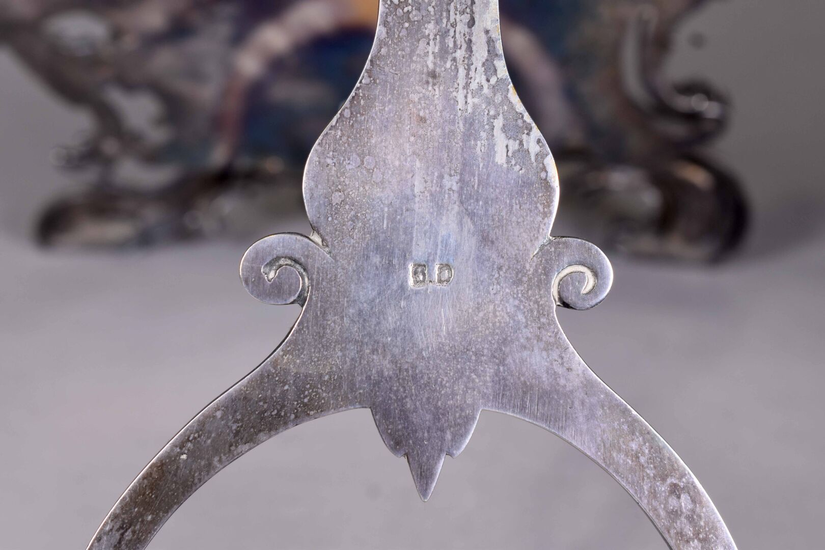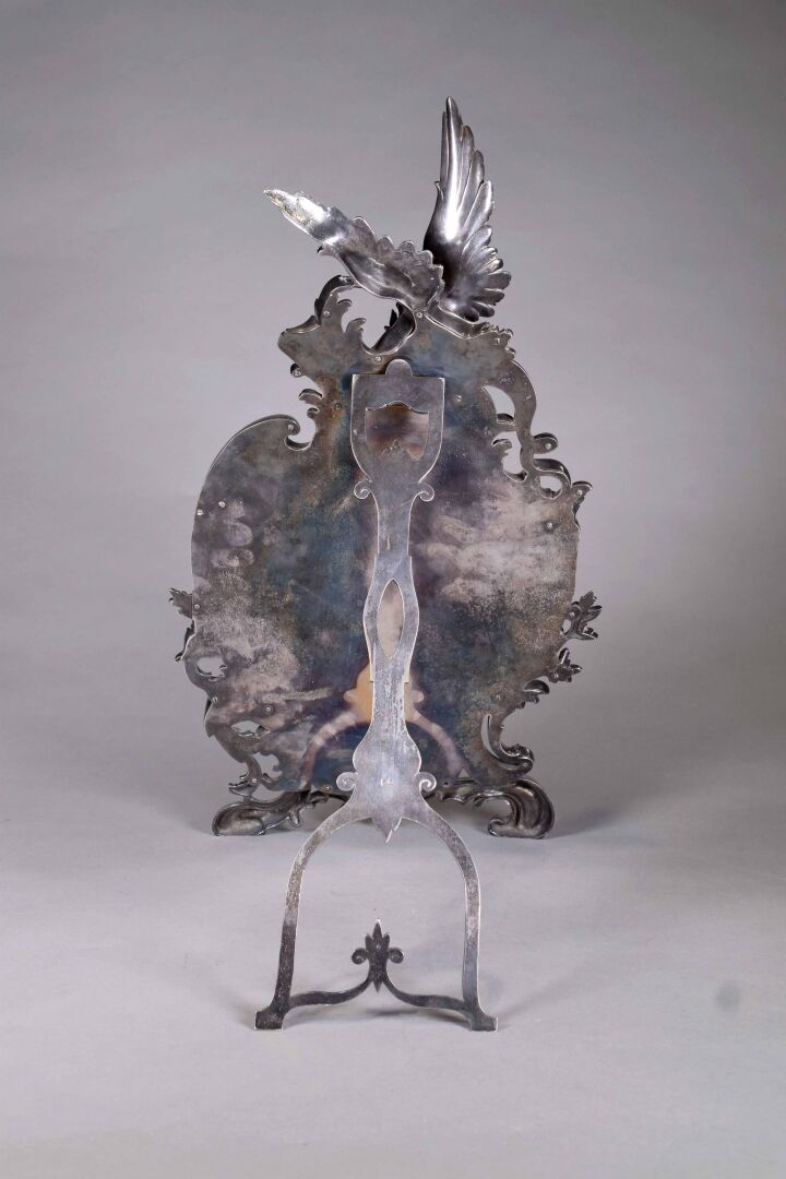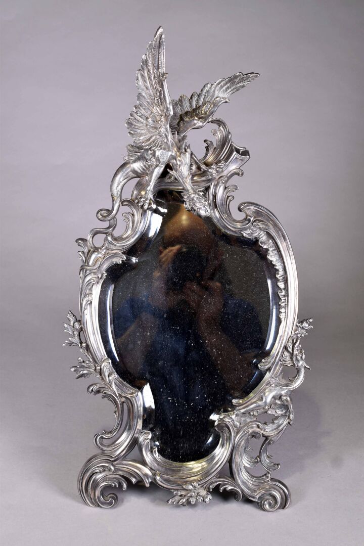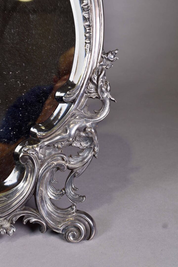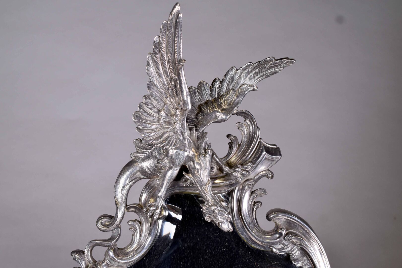 Miroir de table en bronze argenté ciselé à décor de griffons, acanthes et entrelacs. Glace biseautée piqures. Style Louis XV. Haut. : 65 cm.