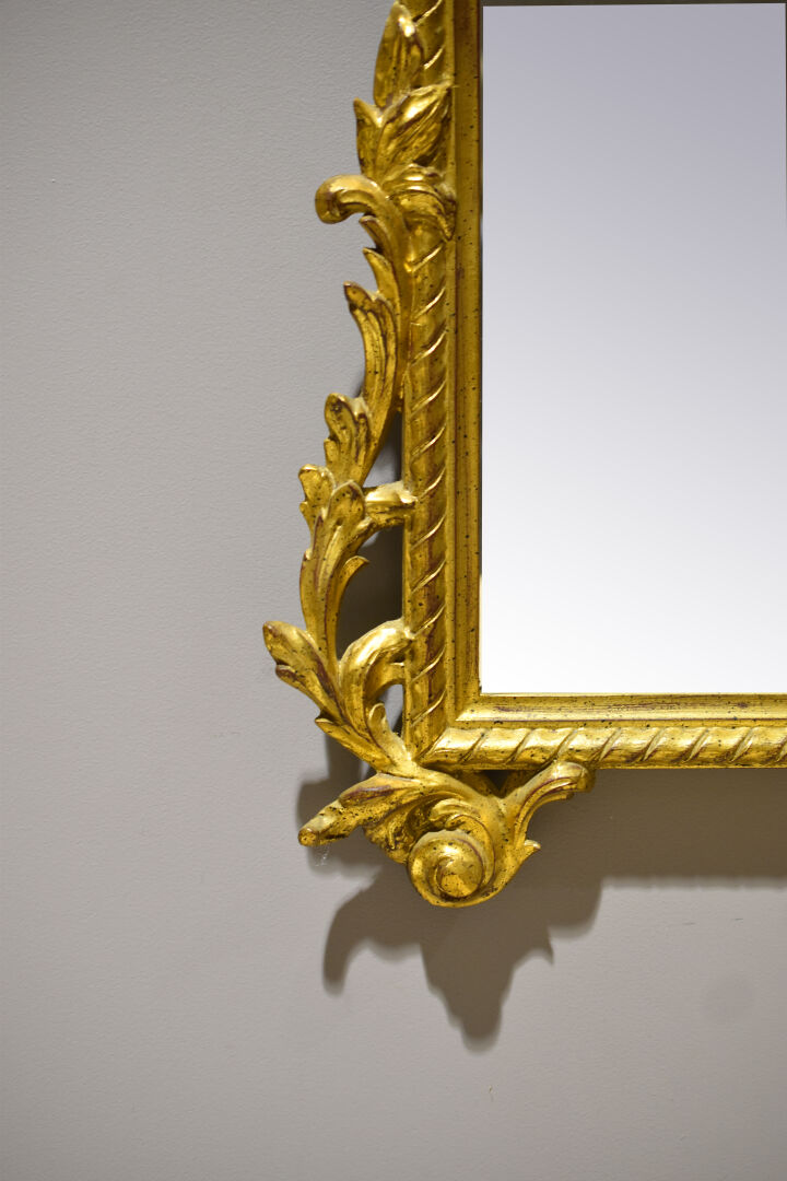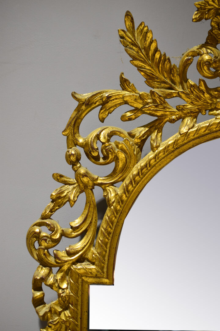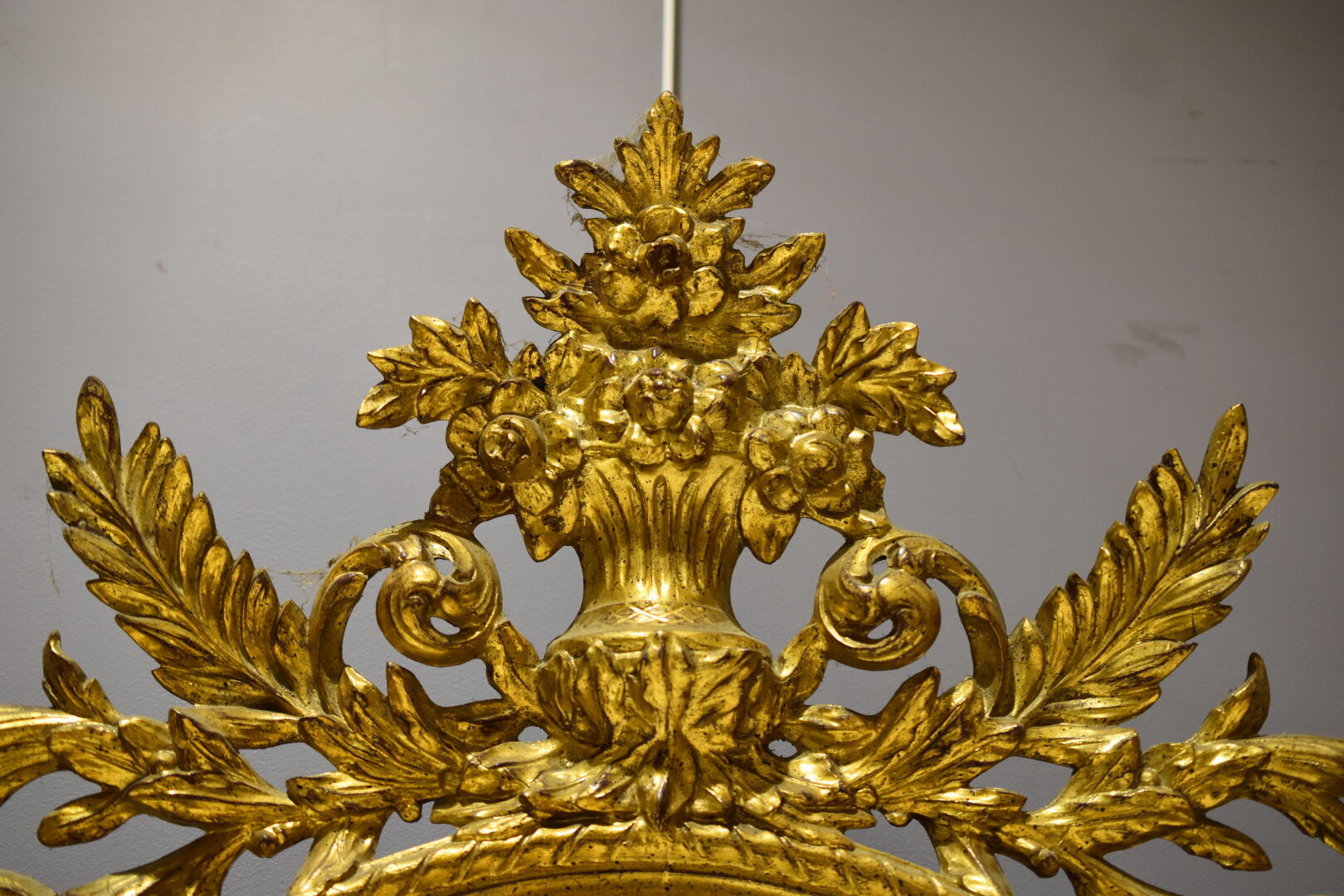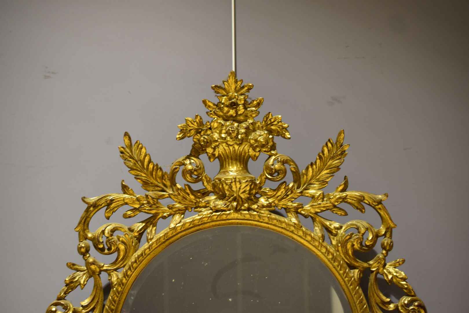 Miroir en bois et composition dorés, le fronton orné d’un vase fleuri. Glace biseautée. Style Napoléon III, XXe siècle. 142 x 79 cm.