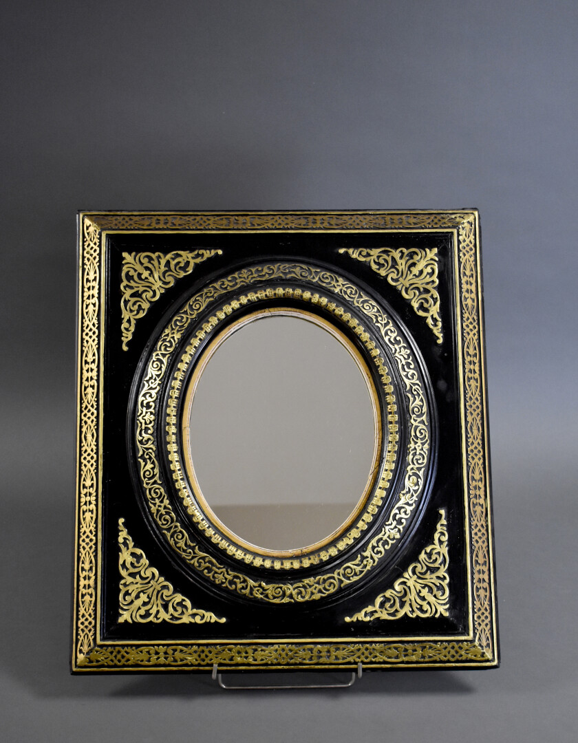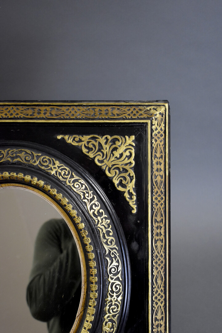 Miroir en bois noirci et bois doré, la glace ovale. Époque Napoléon III. 53,5 x 47,5 cm.