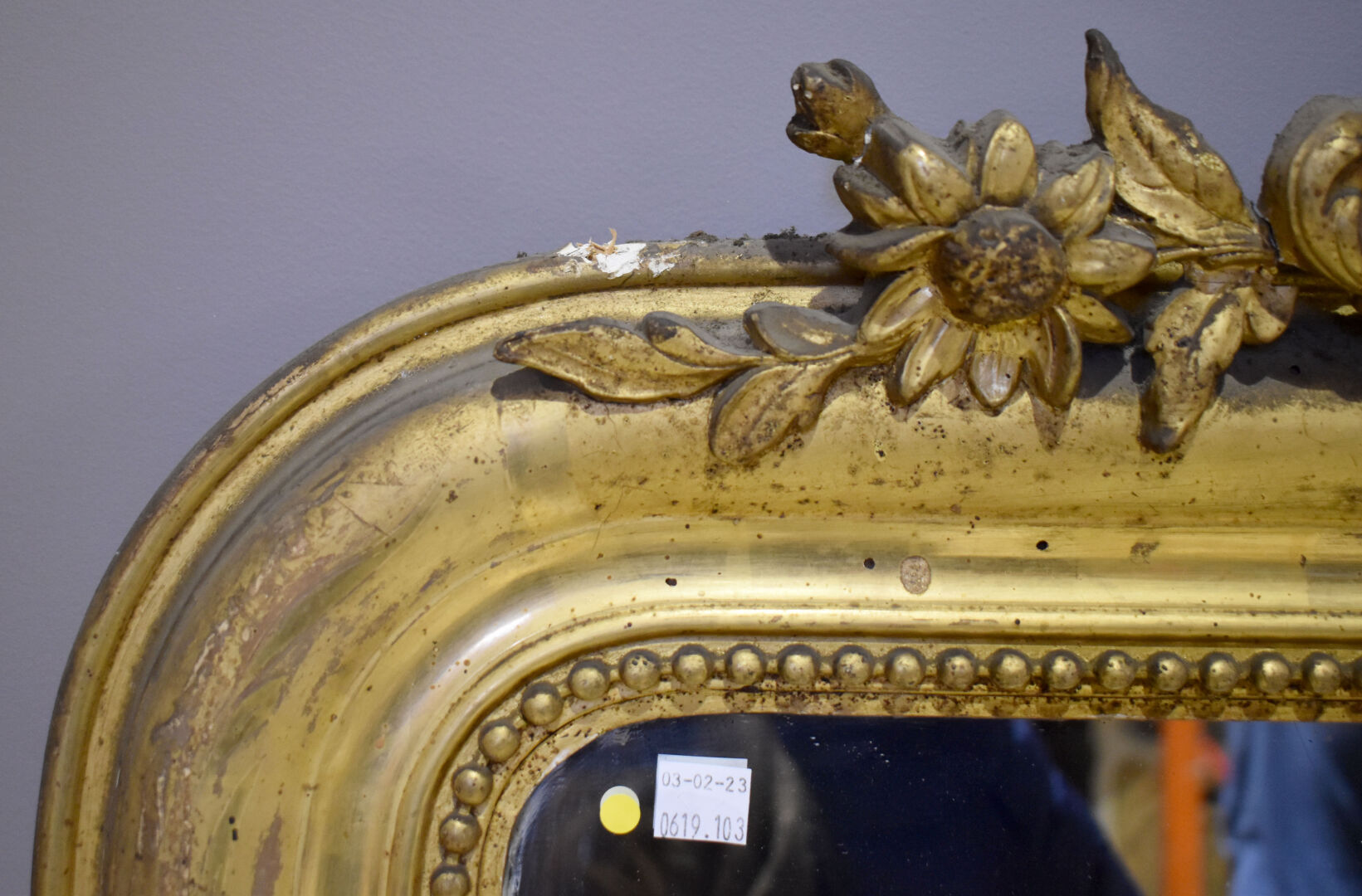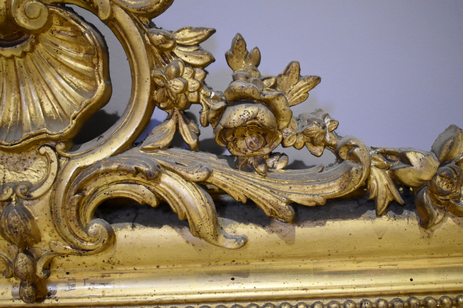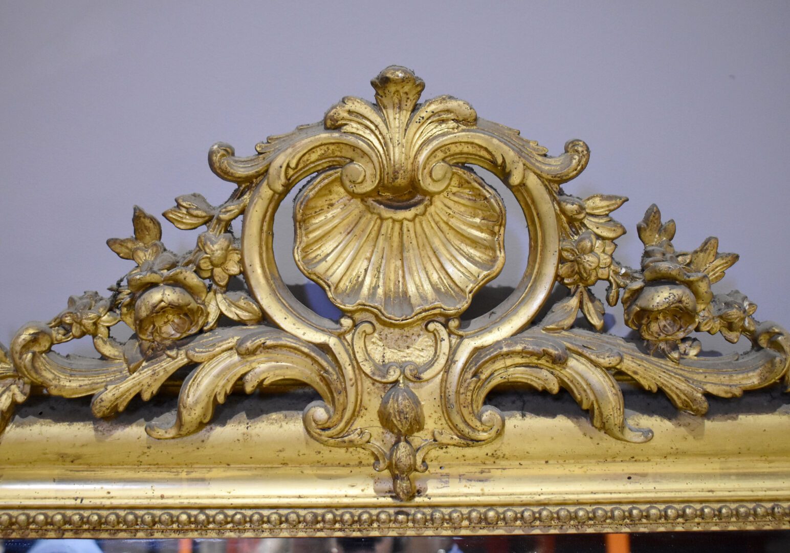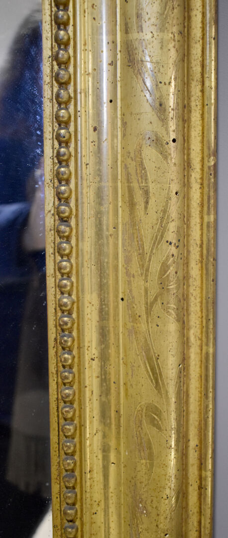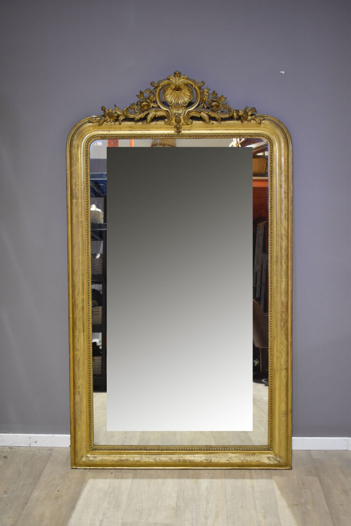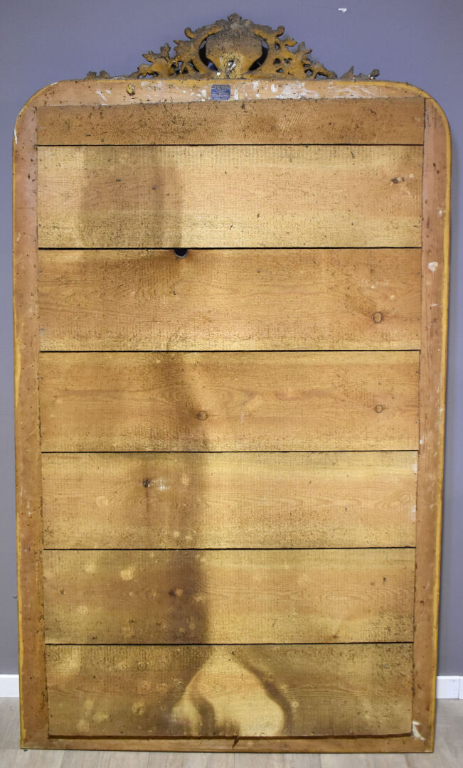 Miroir en bois sctuqué et doré, le fronton à décor ajouré d’une coquille et acanthes (quelques usures d’usage et petits manques. Début du XXe siècle. 172 x 97 cm.