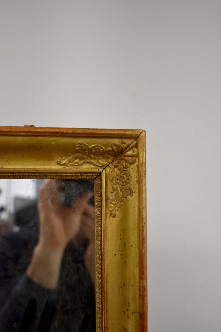 Miroir en bois sculpté doré à décor de fleurs et palmettes (petites égrenures et légères usures). Epoque Restauration. 80 x 60,5 cm.