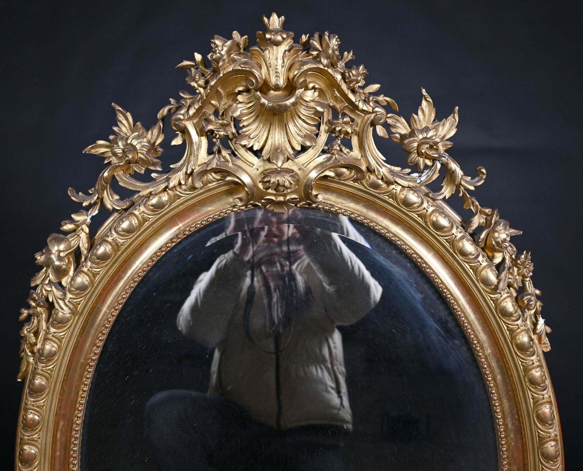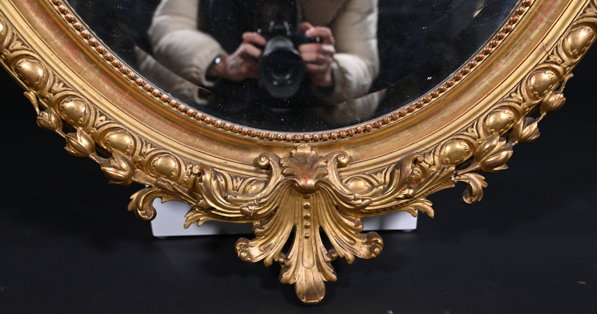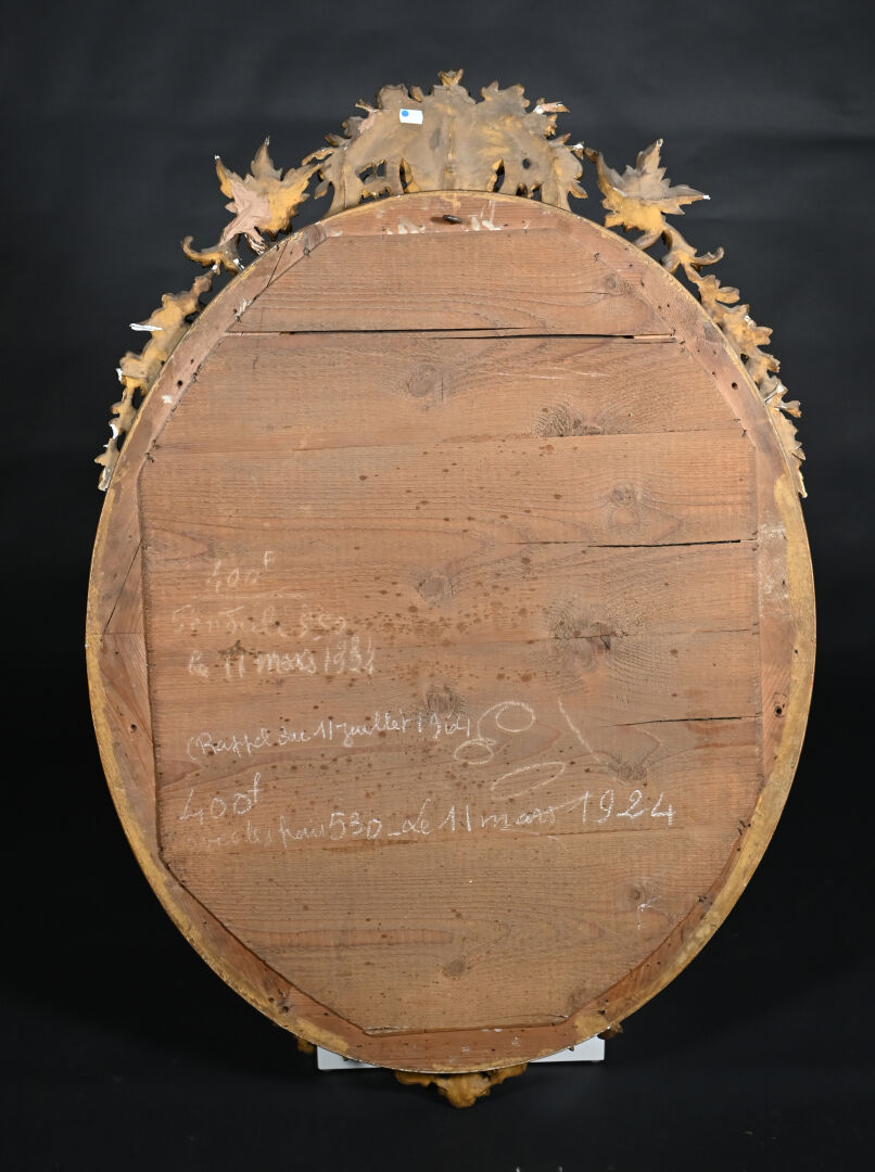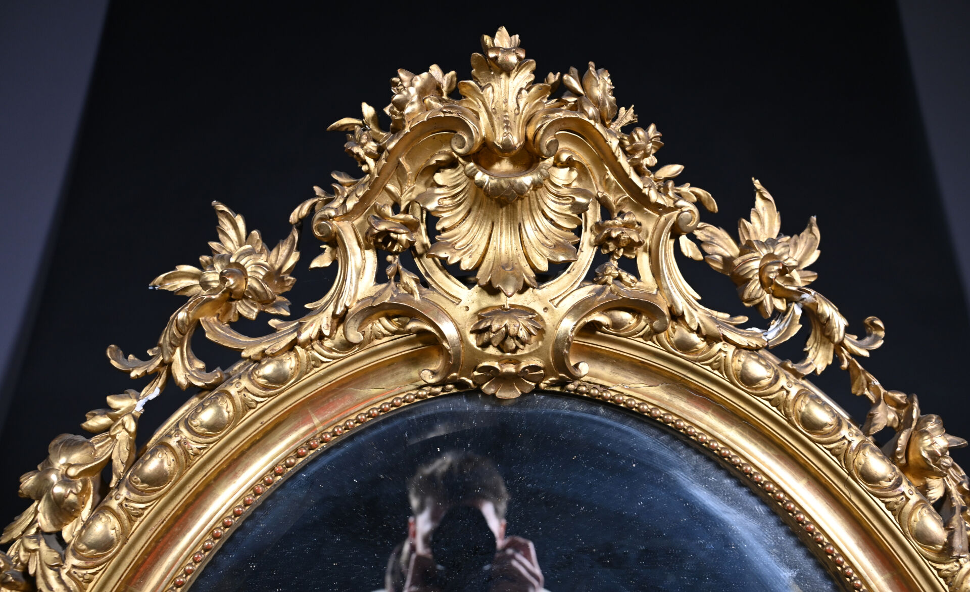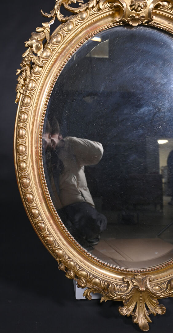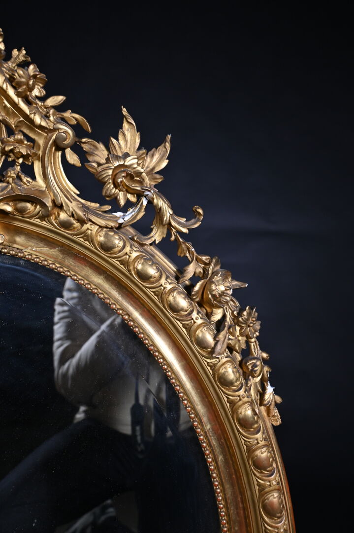 Miroir en bois sculpté doré, le fronton orné d’une palmette dans un entourage fleuri (éclats). XIXe siècle. Glace biseautée. 120 x 80 cm.
