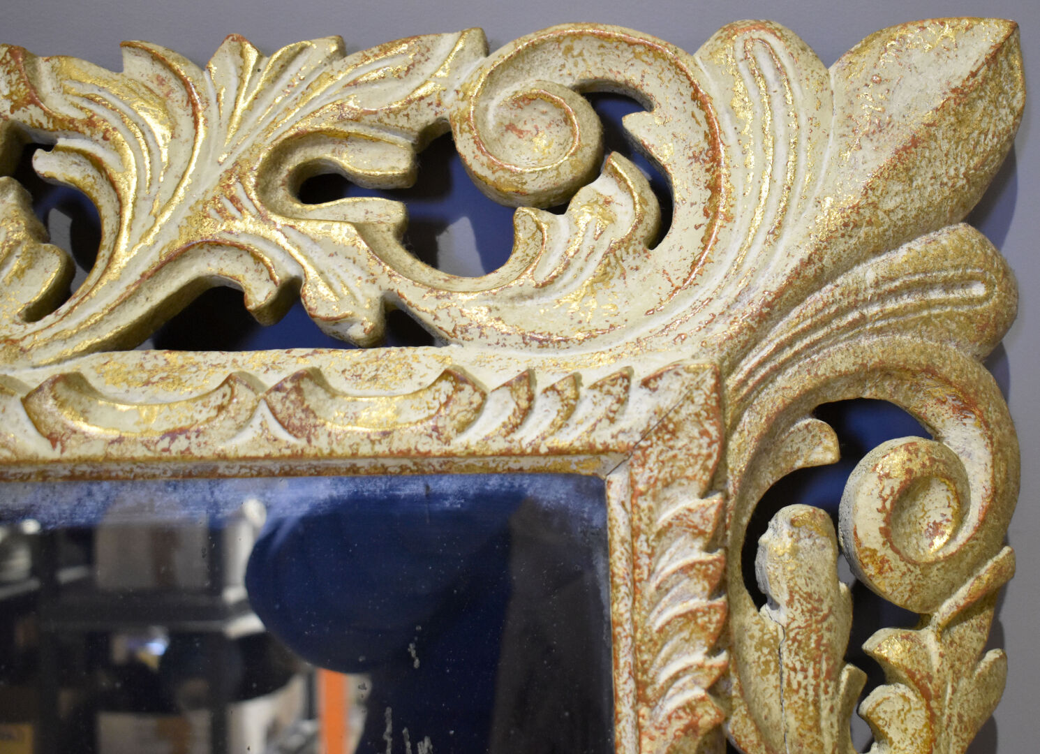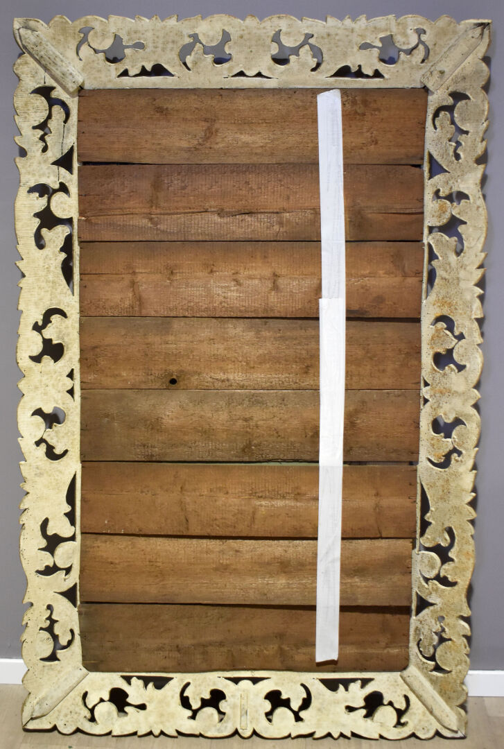 Miroir en bois sculpté laqué crème et or à décor d’acanthes. Style Louis XV. 151 x 95 cm.