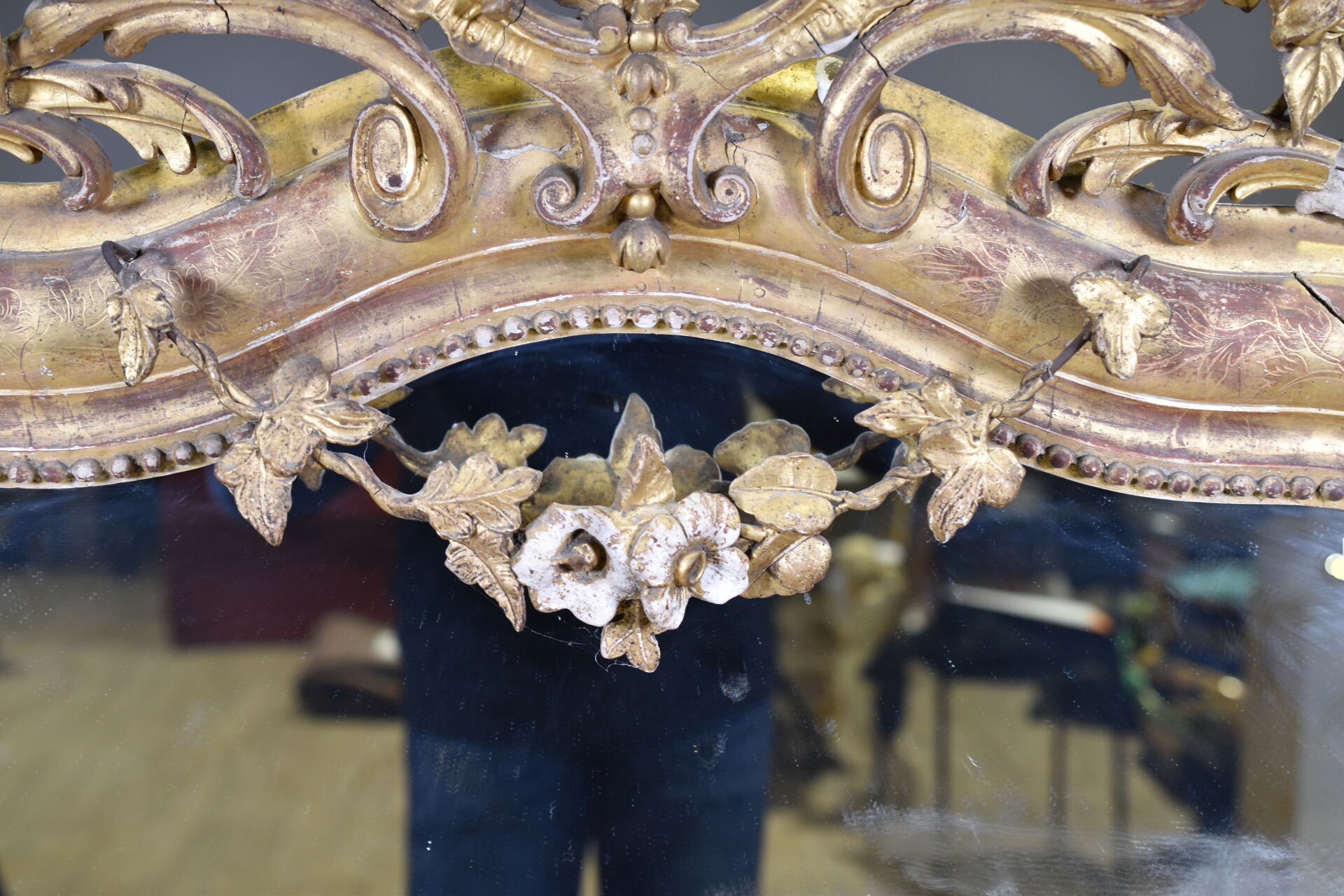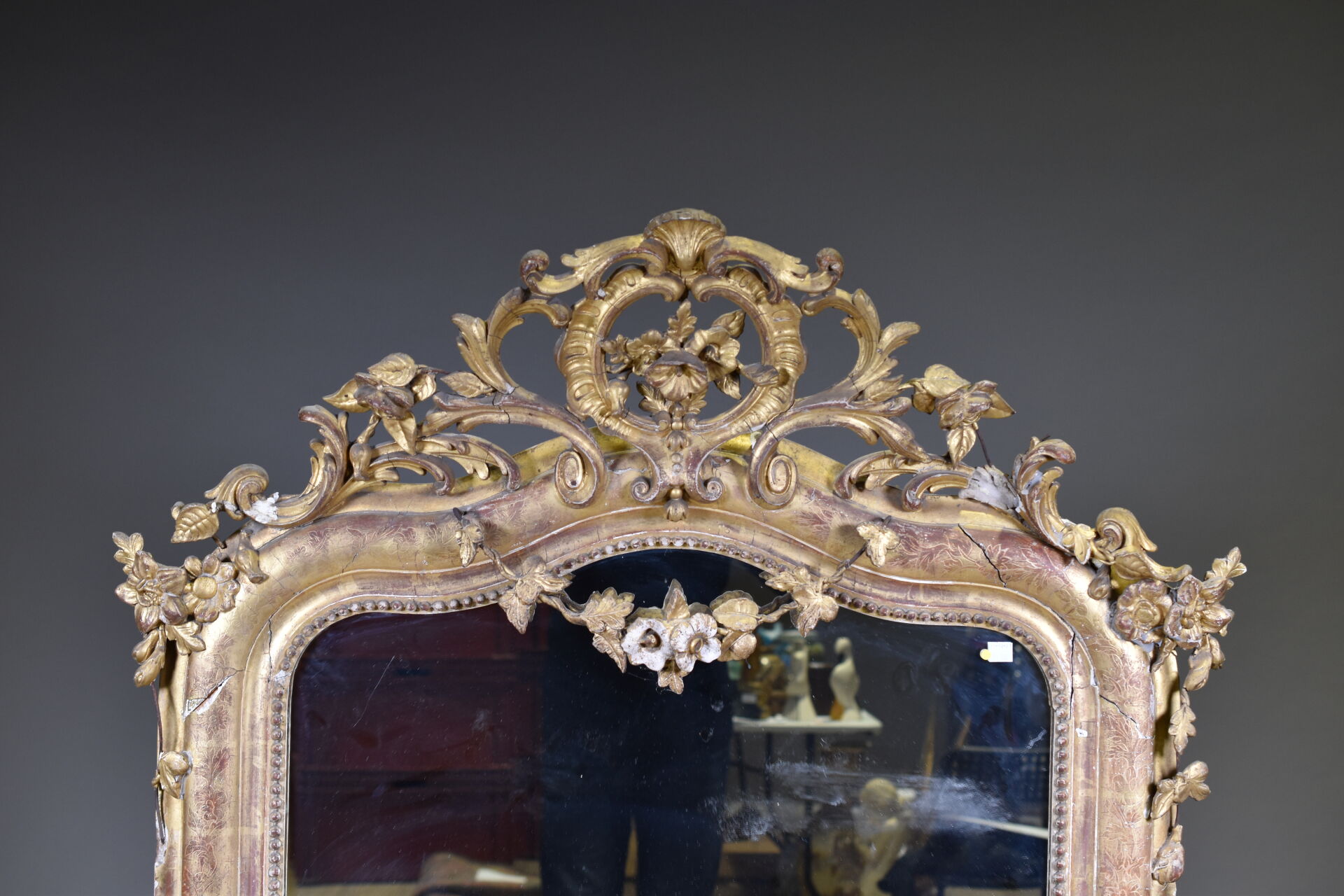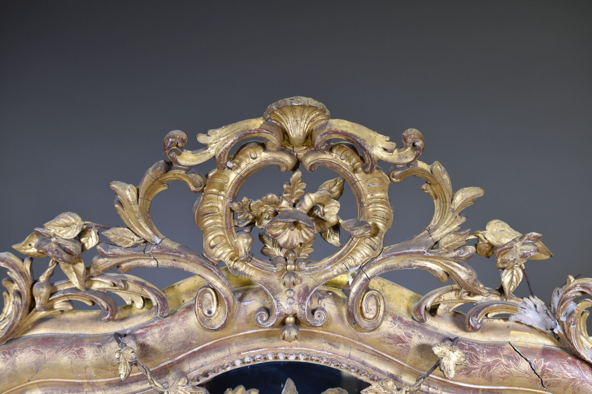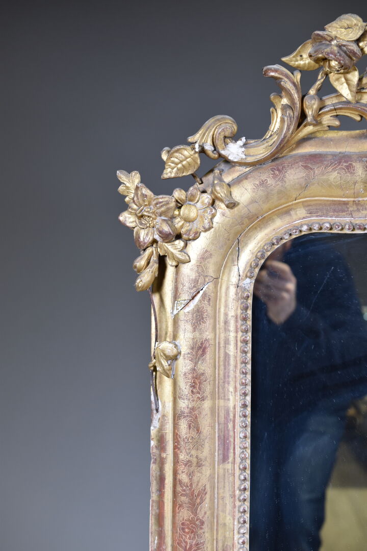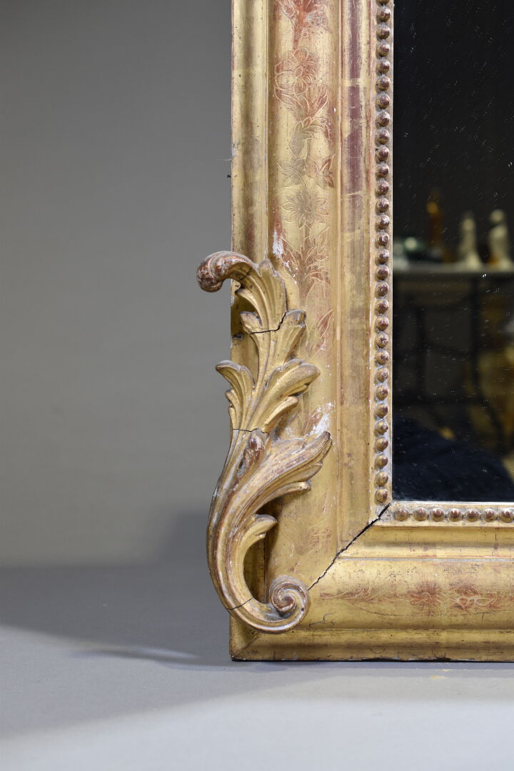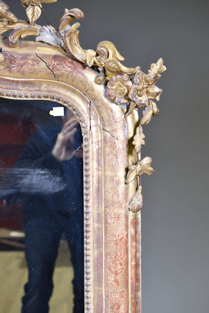 Miroir en bois sculpté, stuqué et doré, le fronton ajouré orné de fleurs et acanthes (fentes, éclats, manques, usures). XIXe siècle. 161 x 97 cm.