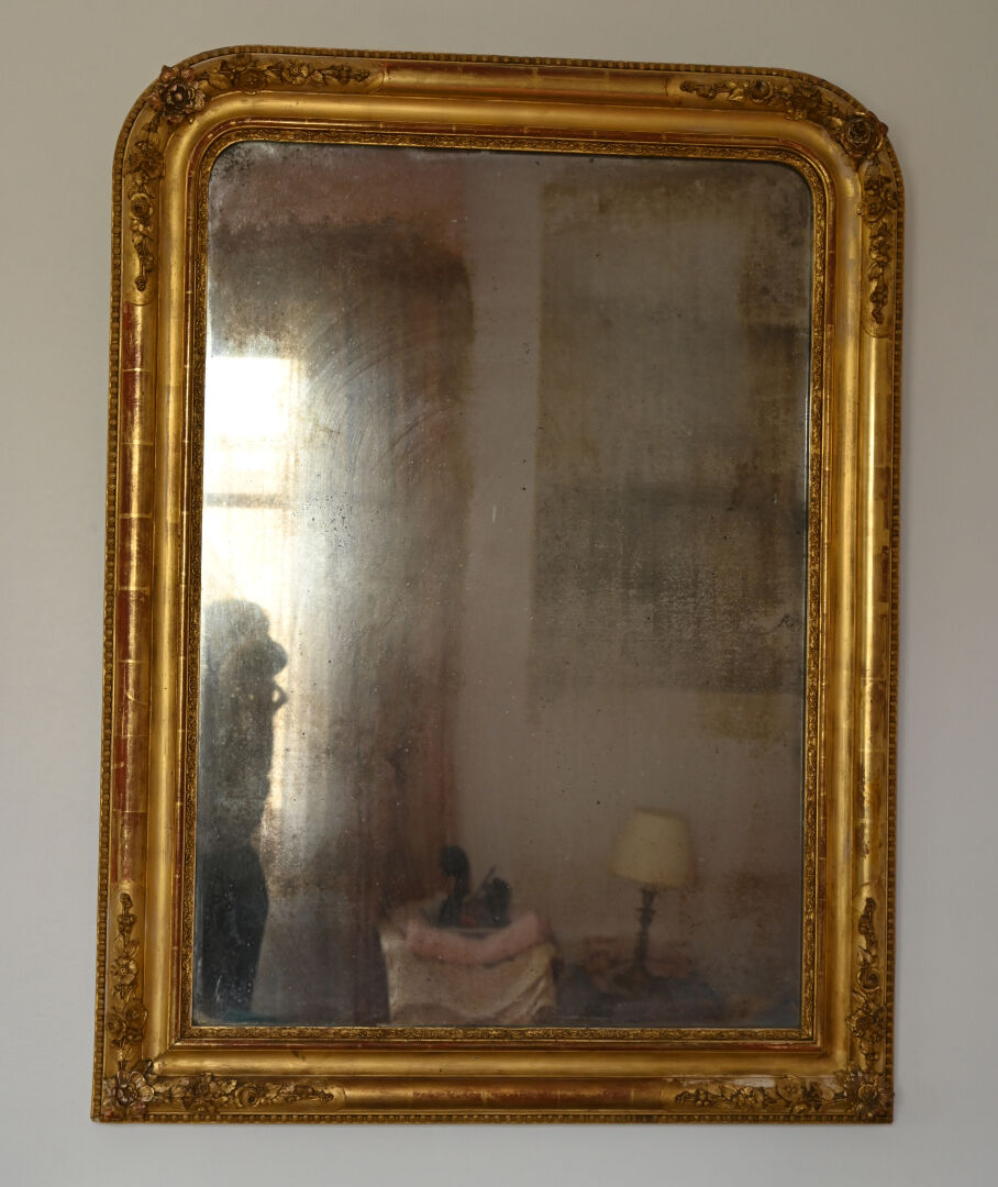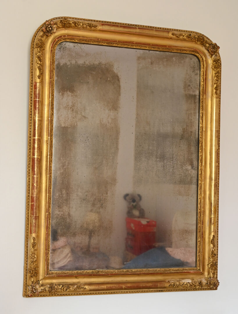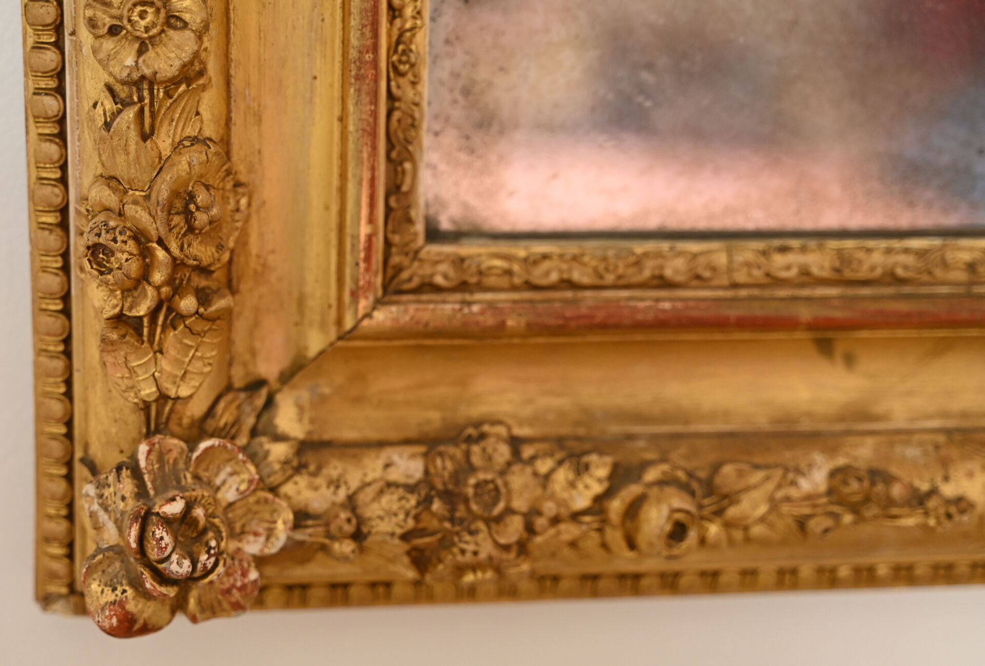 Miroir en bois stuqué doré. Vers 1900. Usures d’usage. 120 x 88 cm.