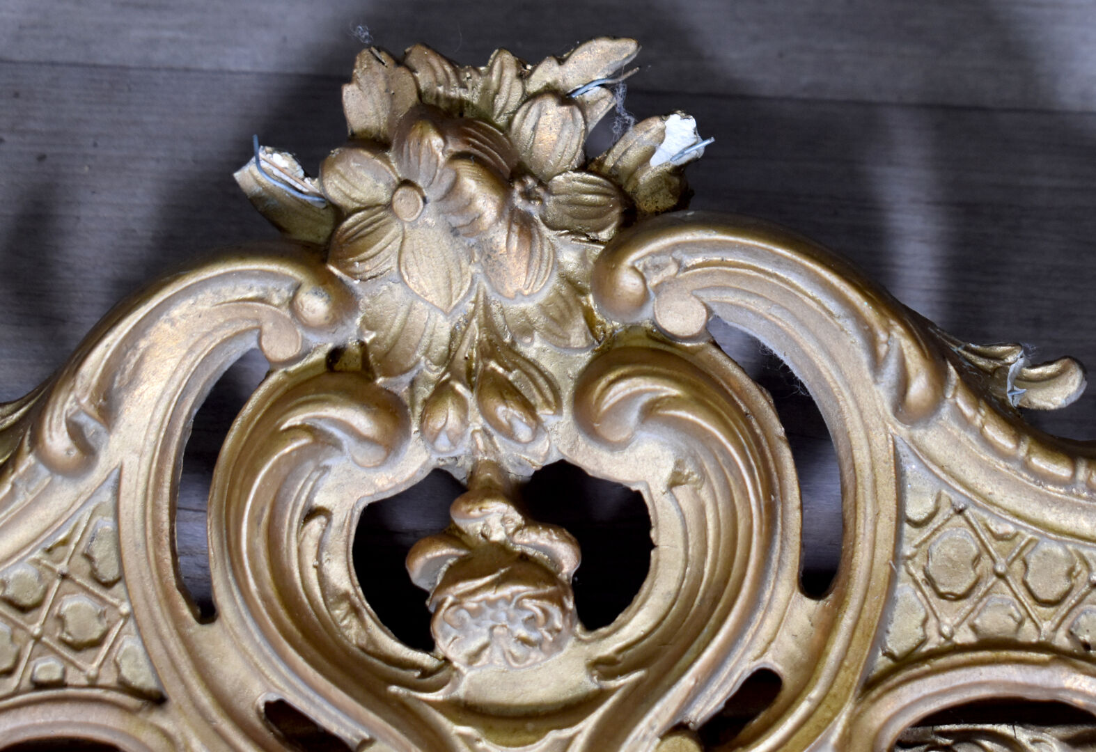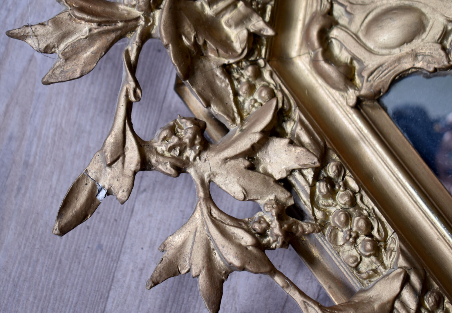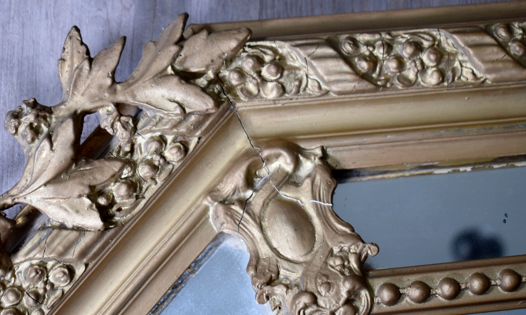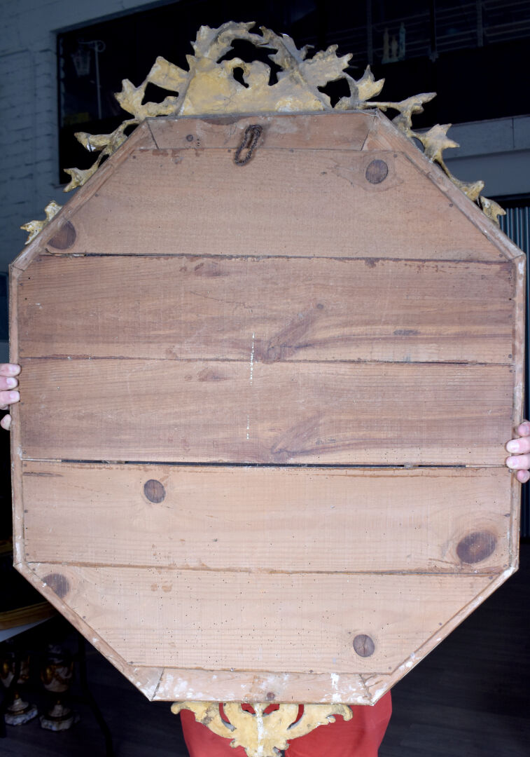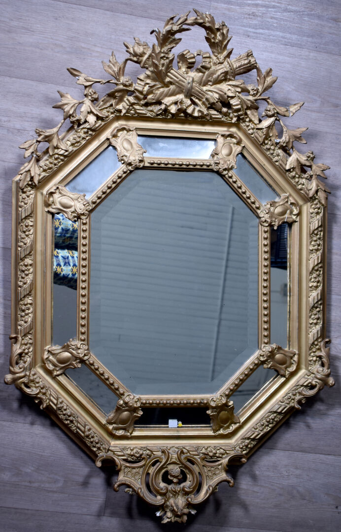 Miroir hexagonal à parecloses en bois stuqué re-doré (éclats, fèles et manques), le fronton orné de carquois, torche, et couronne de laurier. Vers 1900. 118 x 80 cm.