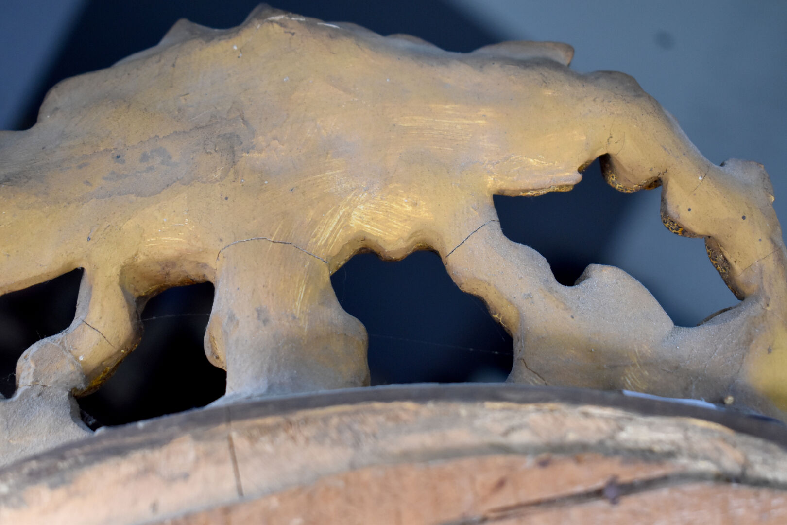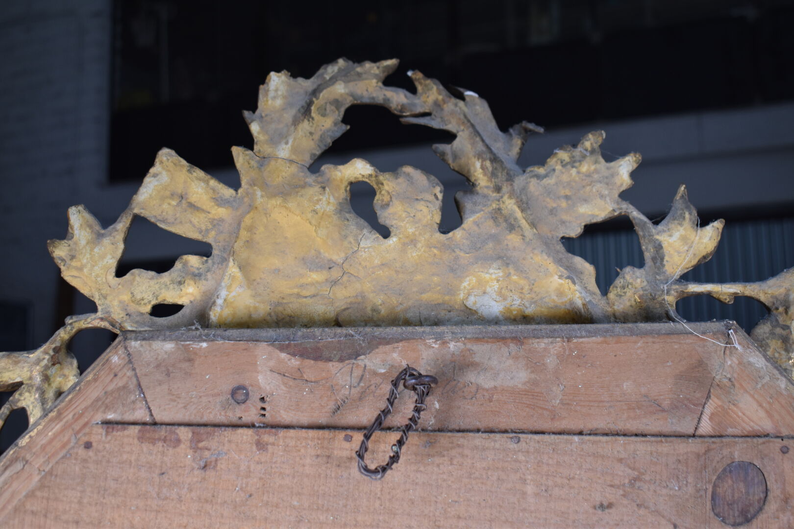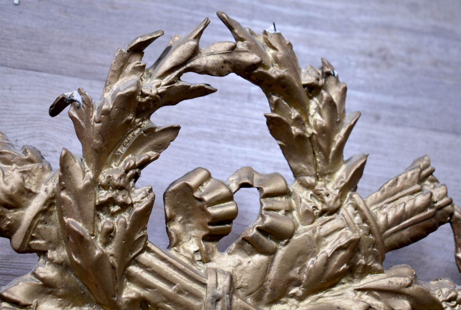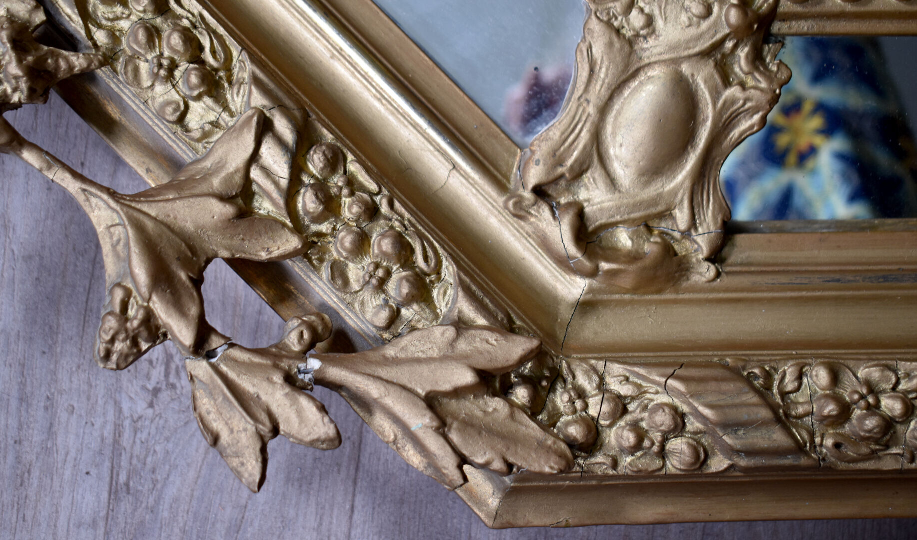 Miroir hexagonal à parecloses en bois stuqué re-doré (éclats, fèles et manques), le fronton orné de carquois, torche, et couronne de laurier. Vers 1900. 118 x 80 cm.