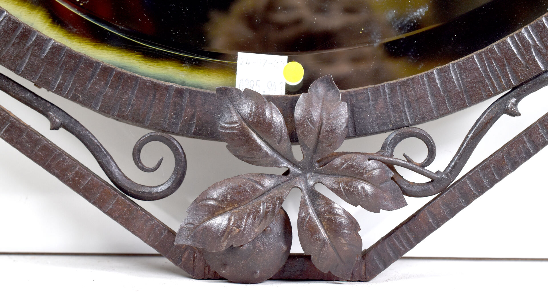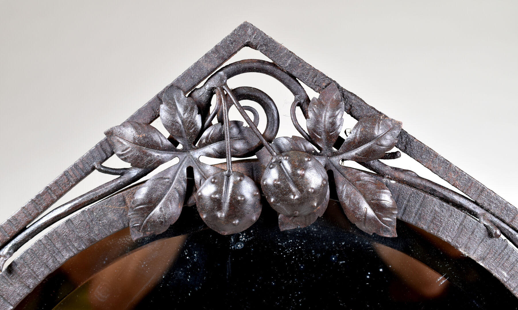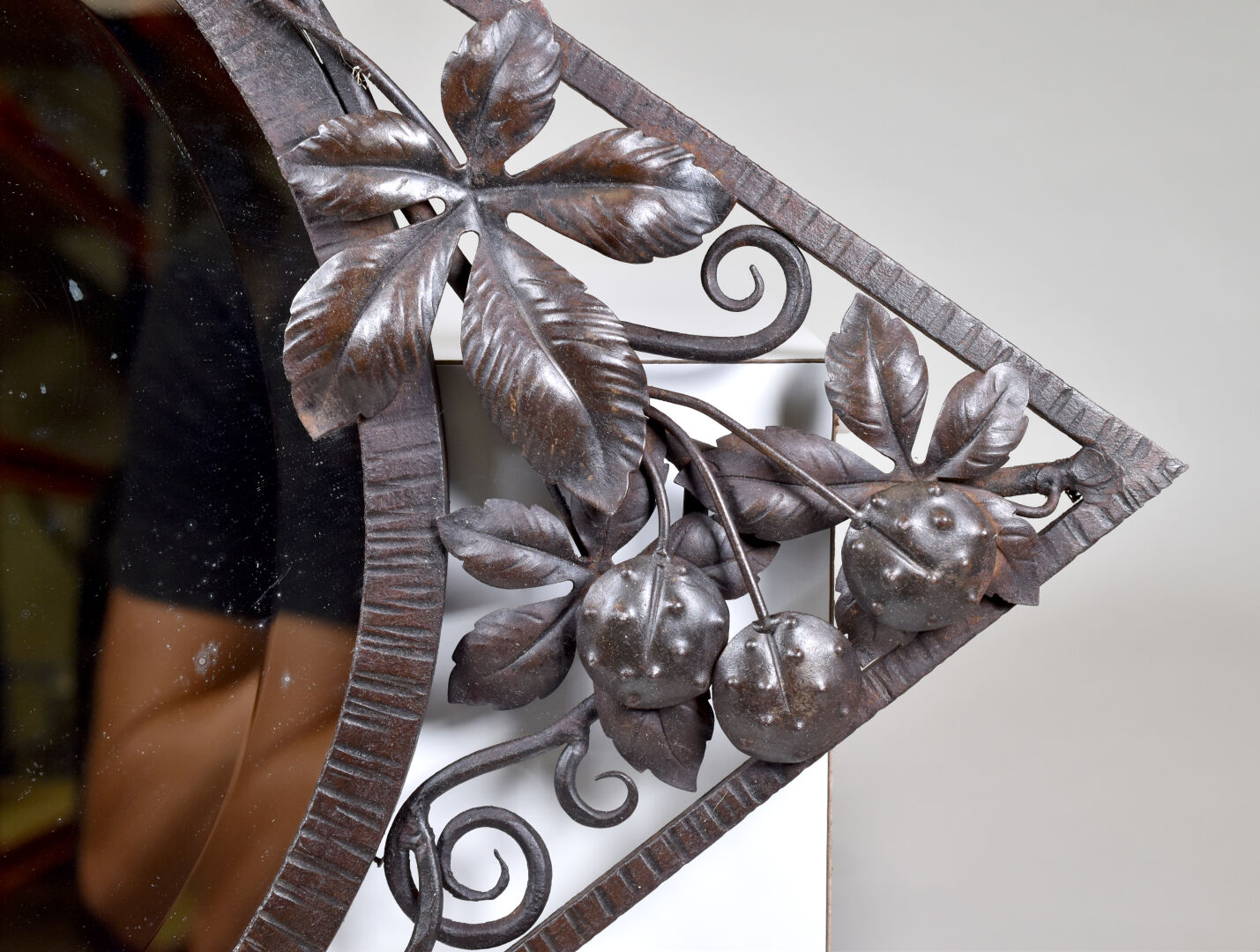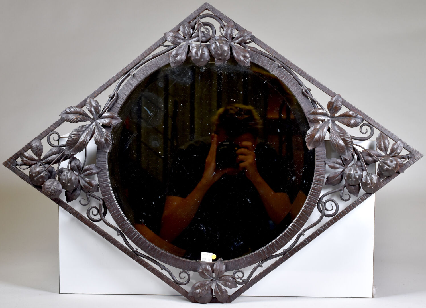 Miroir losangique en fer et métal forgé patiné brun à décor de branches de marronniers. Glace circulaire biseautée. Première moitié du XXe siècle. 56 x 79 cm.