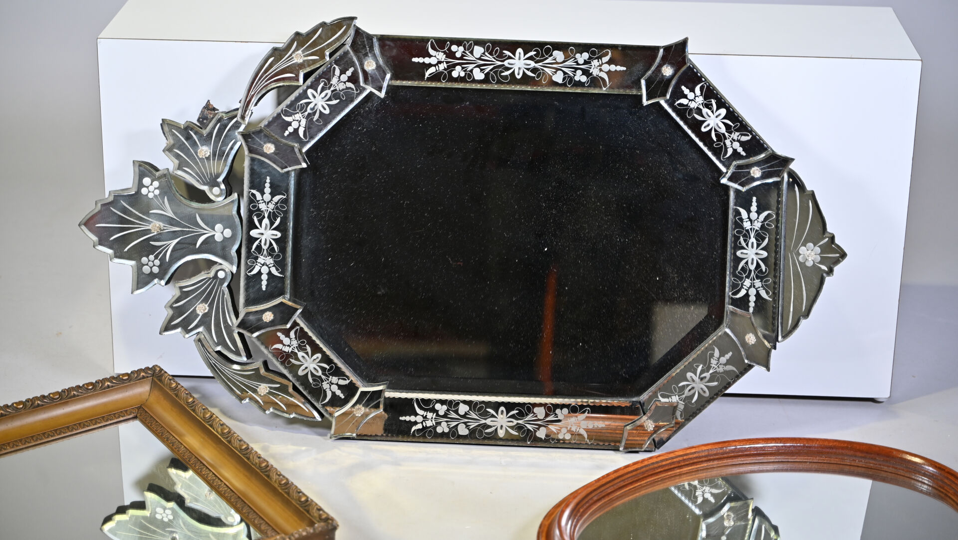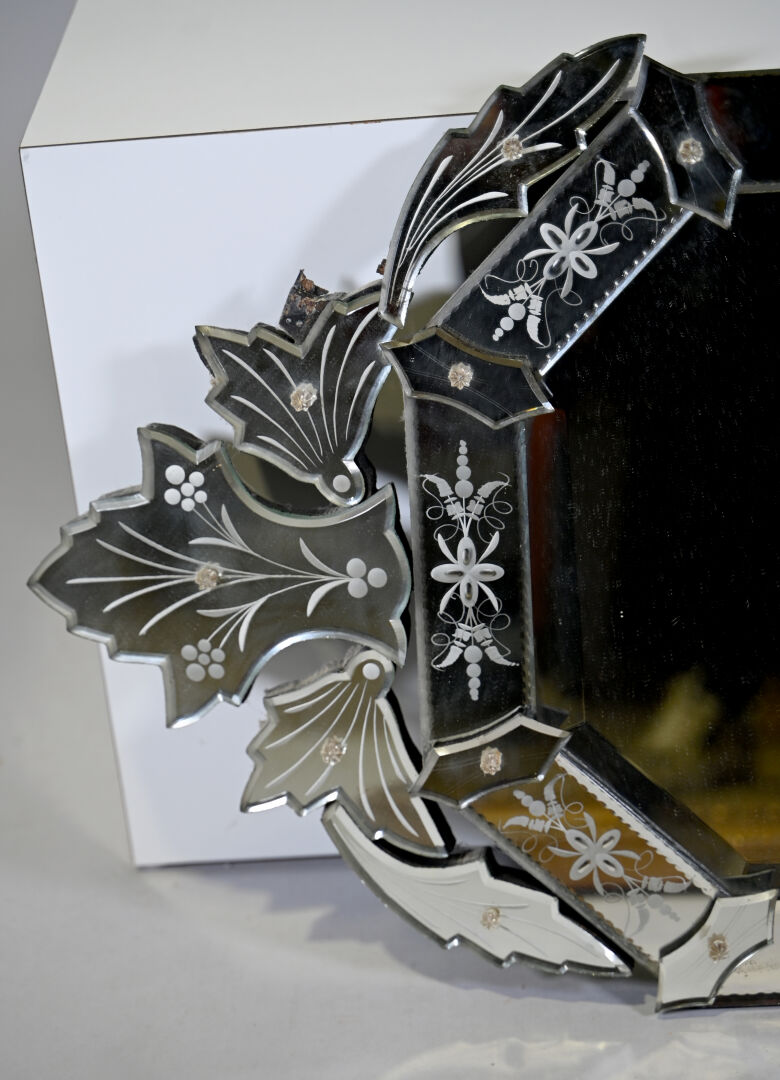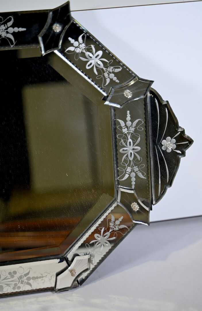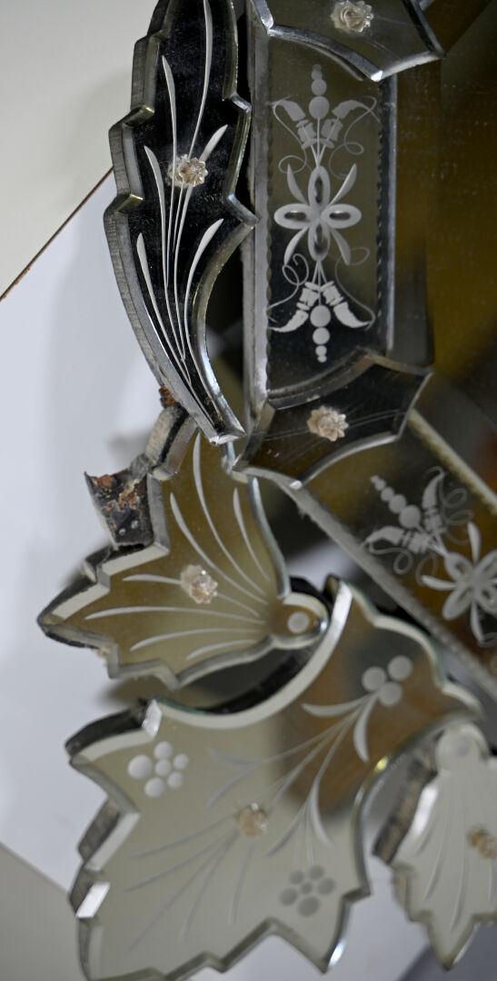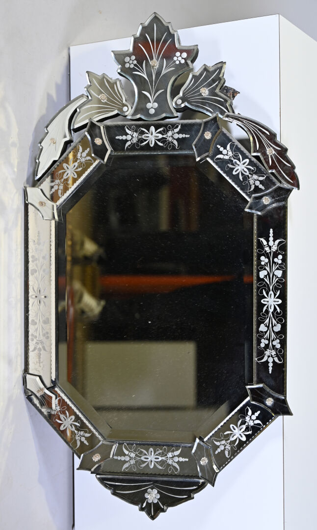 Miroir octogonal vénitien à décor gravé de fleurs et végétaux, le fronton à palmettes (égrenures, un élément à refixer au dos). XXe siècle. 94 x 53 cm. On joint deux miroirs en bois dont un doré.