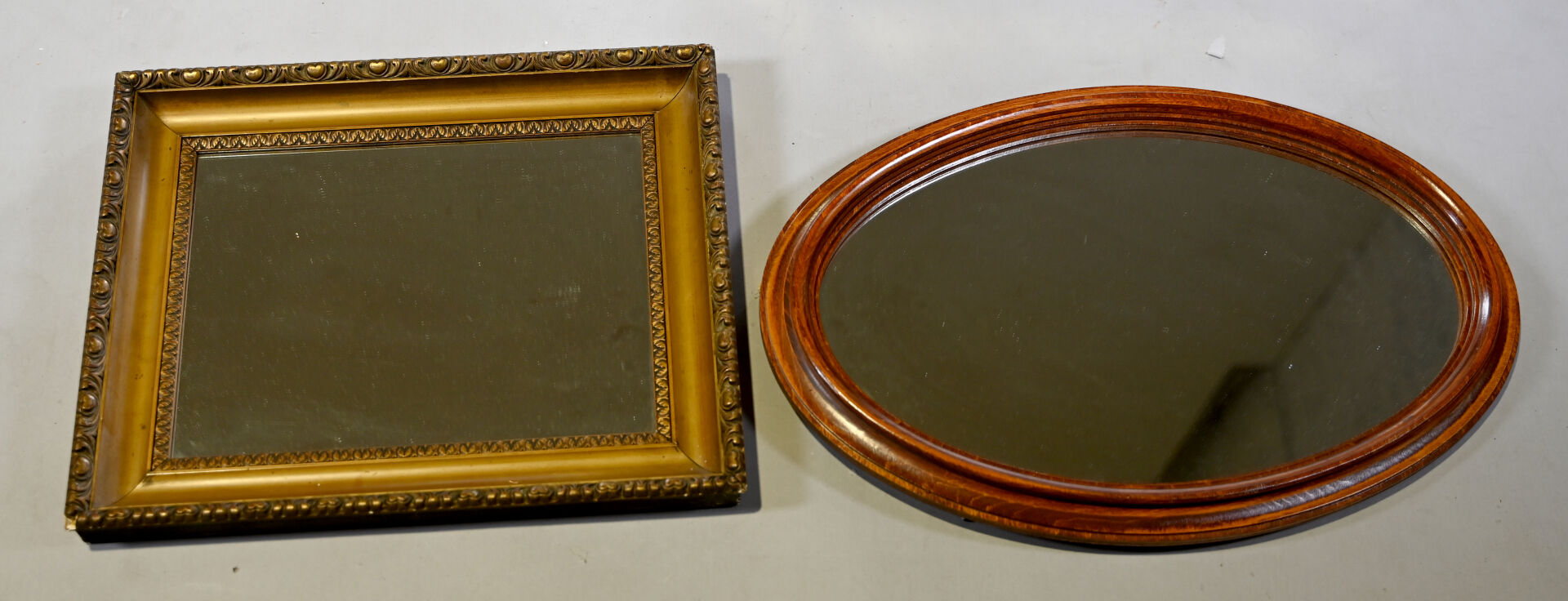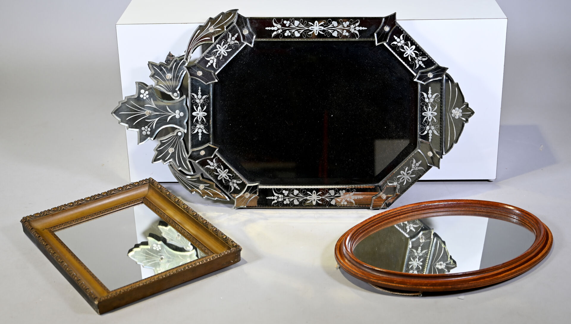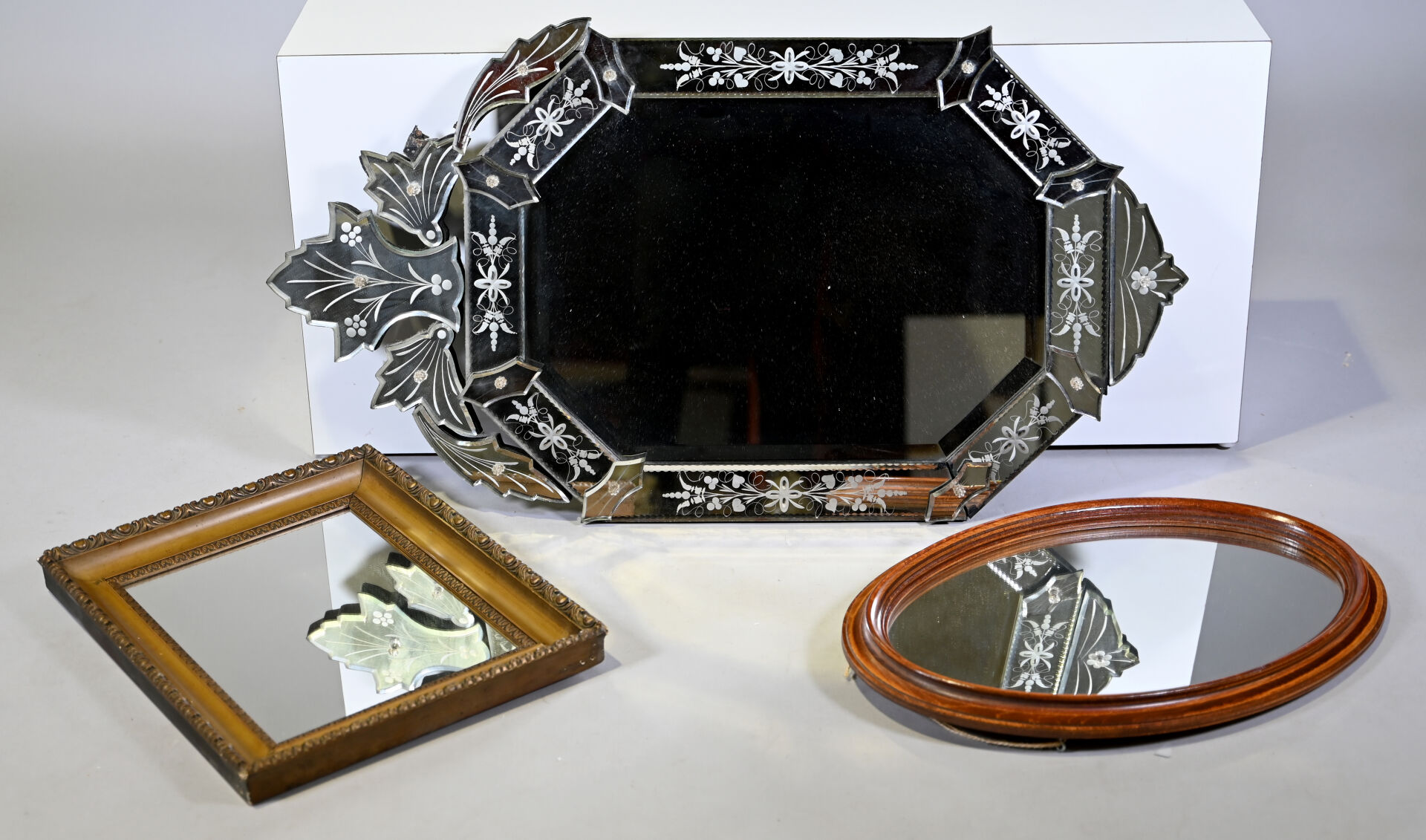 Miroir octogonal vénitien à décor gravé de fleurs et végétaux, le fronton à palmettes (égrenures, un élément à refixer au dos). XXe siècle. 94 x 53 cm. On joint deux miroirs en bois dont un doré.
