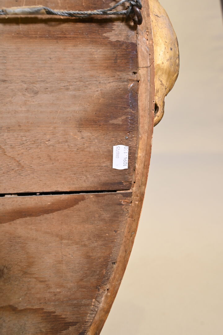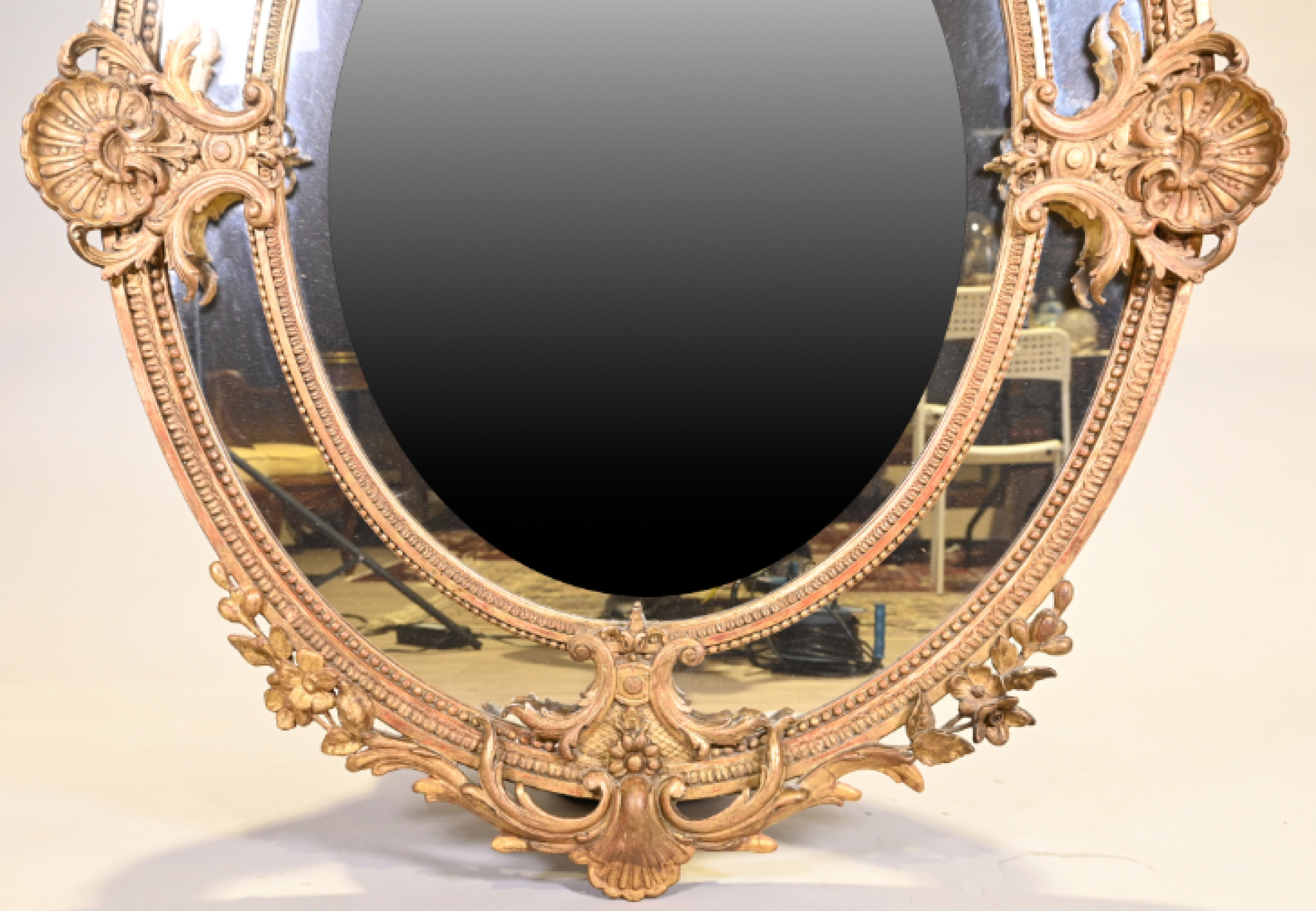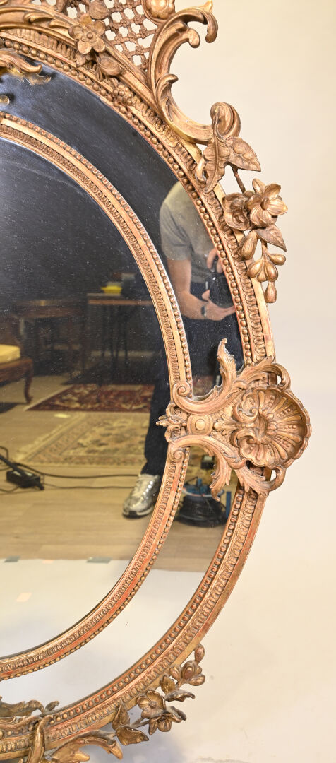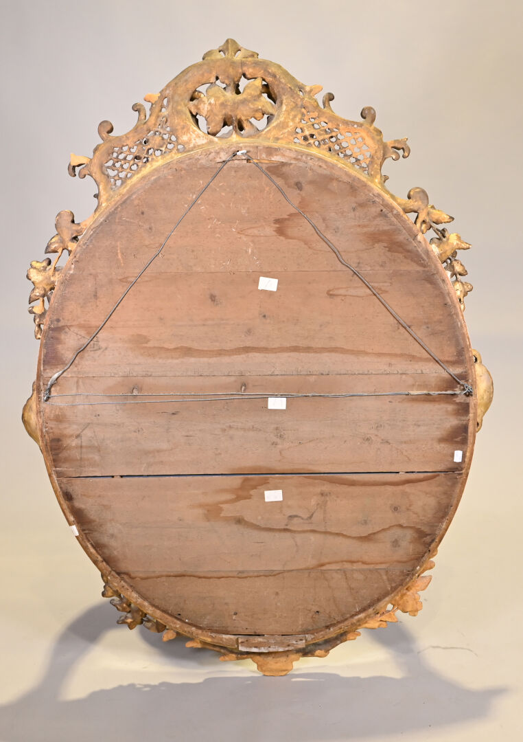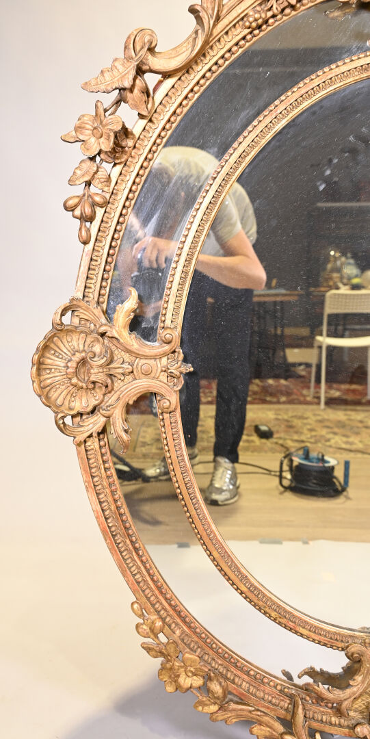 Miroir ovale à parecloses en bois sculpté doré. Le fronton à décor de fleurs, croisillons ajourés et acanthes. Le pourtour à deux coquilles, frises de perles et rais-de-coeur (petits manques et fentes). Style Louis XV, XIXe siècle. 145×104.