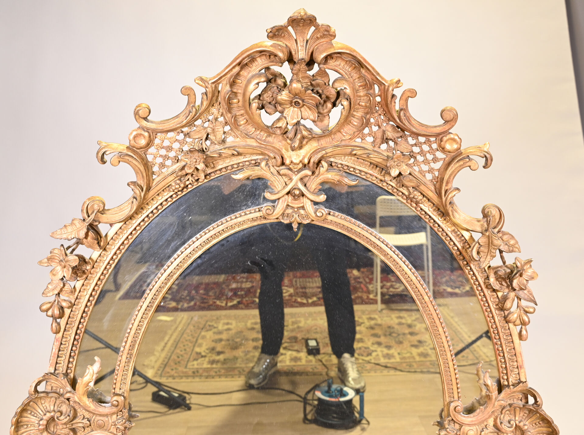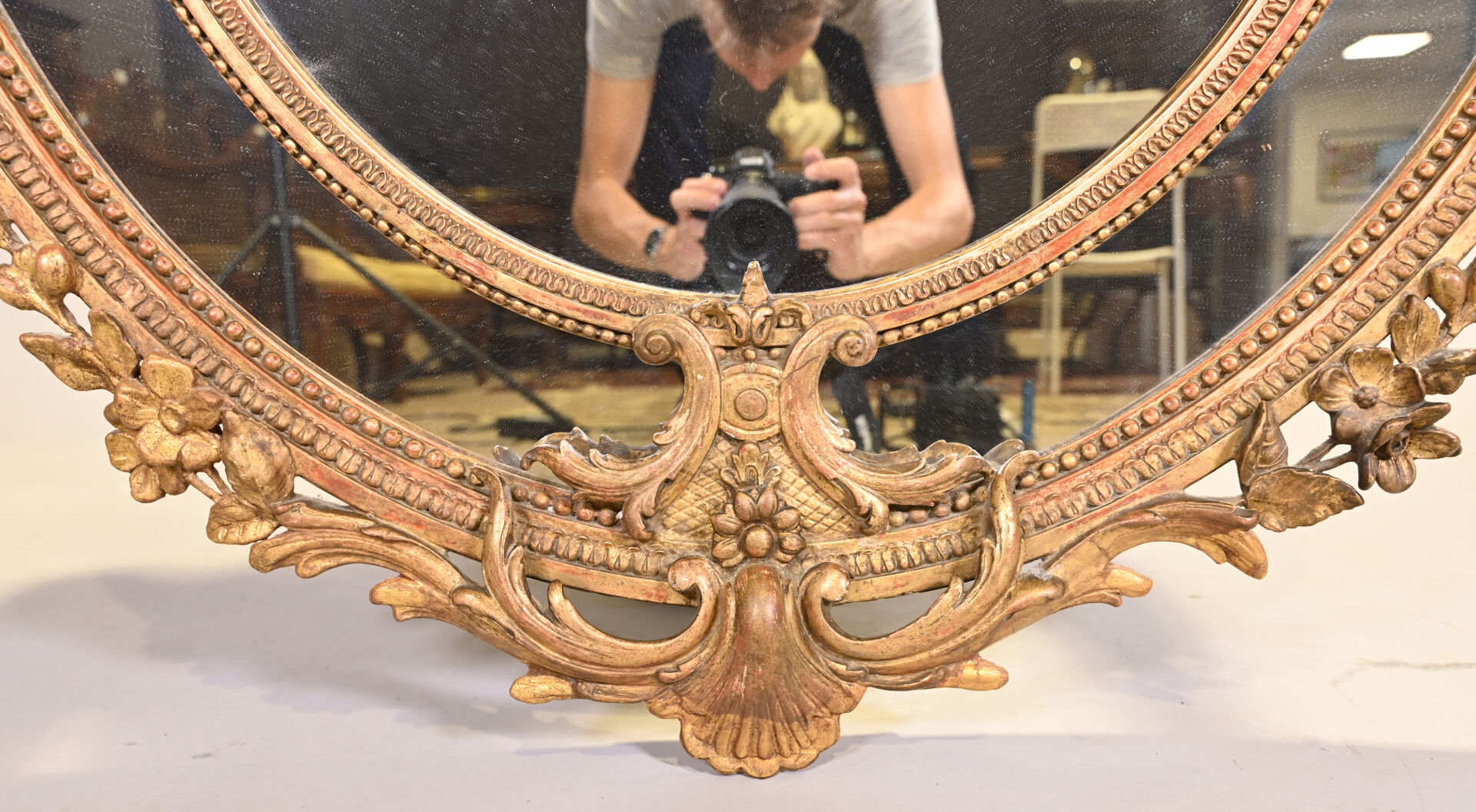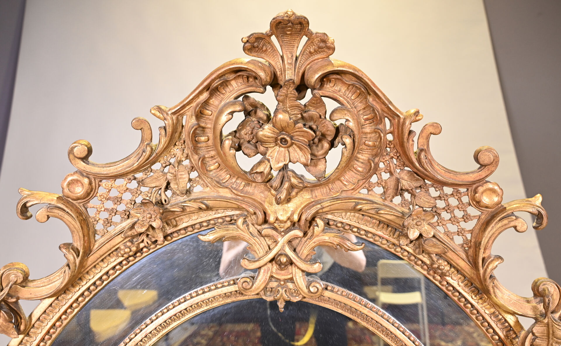 Miroir ovale à parecloses en bois sculpté doré. Le fronton à décor de fleurs, croisillons ajourés et acanthes. Le pourtour à deux coquilles, frises de perles et rais-de-coeur (petits manques et fentes). Style Louis XV, XIXe siècle. 145×104.