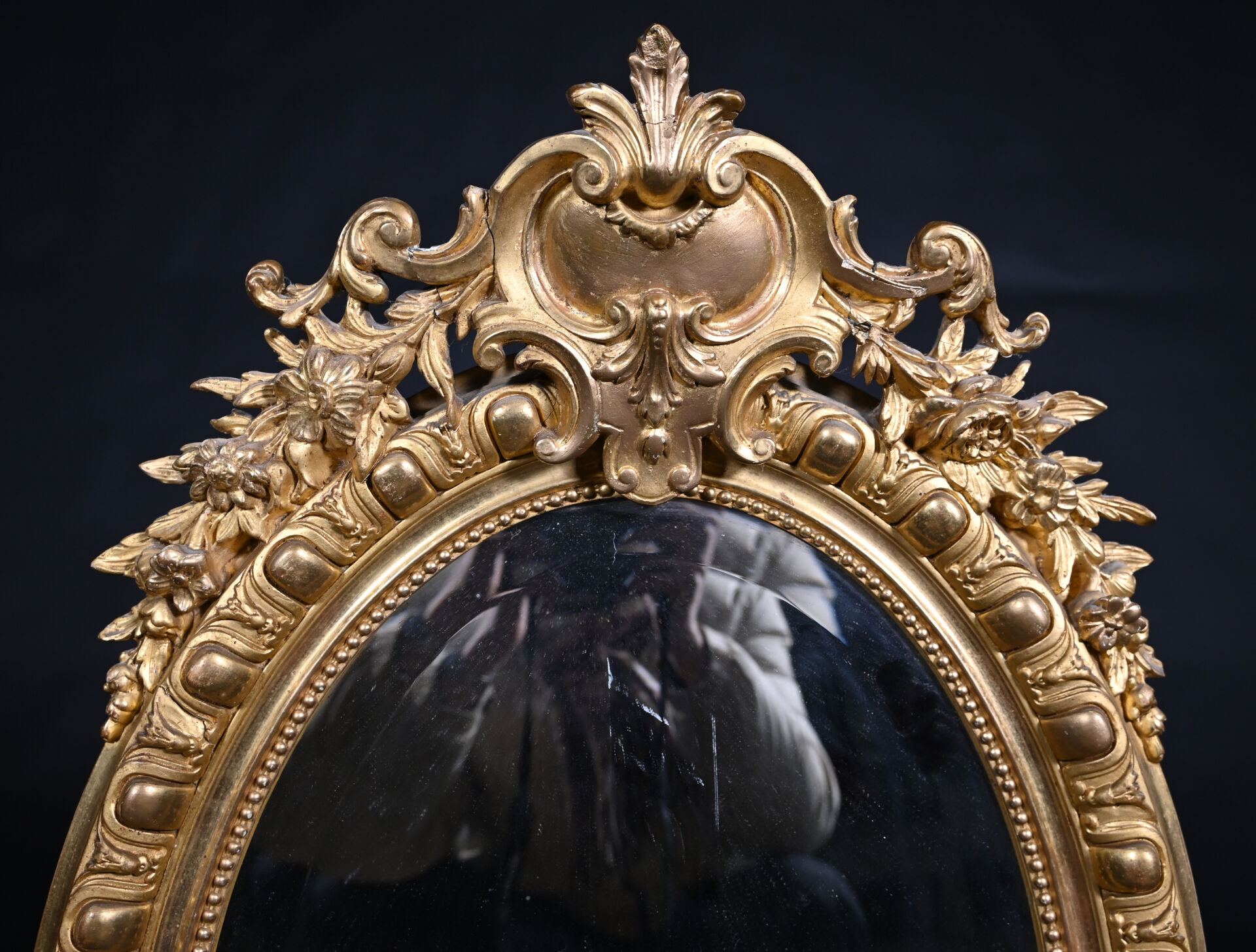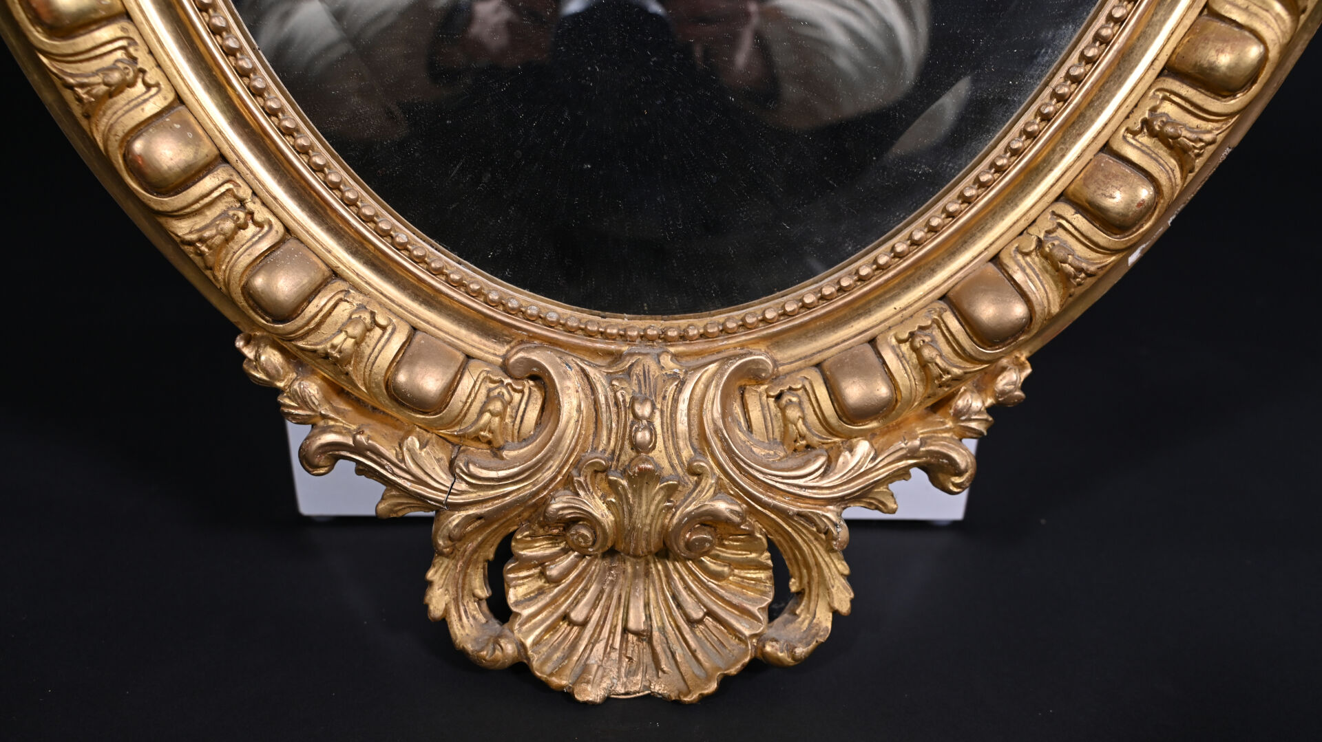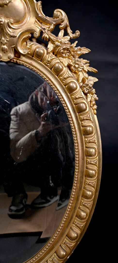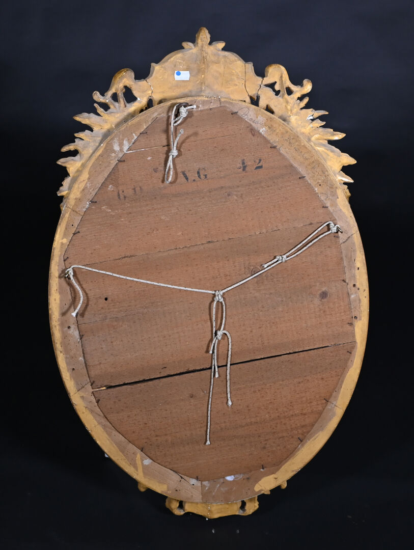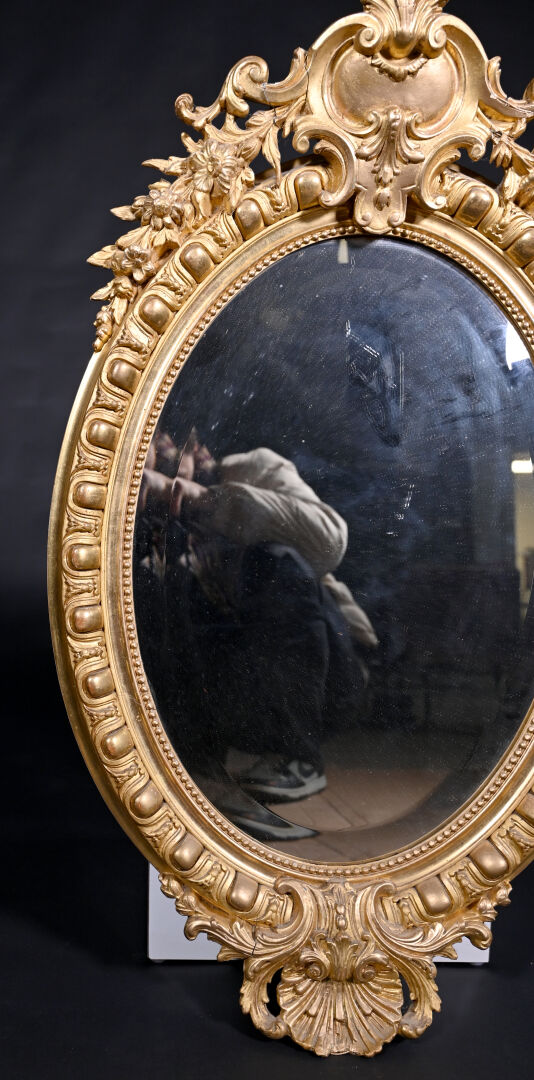 Miroir ovale en bois sculpté doré, le fronton à cartouche feuillagé, la base à décor d’une coquille (usures, éclats). La glace biseauté. XIXe siècle. 92,5 x 57 cm.