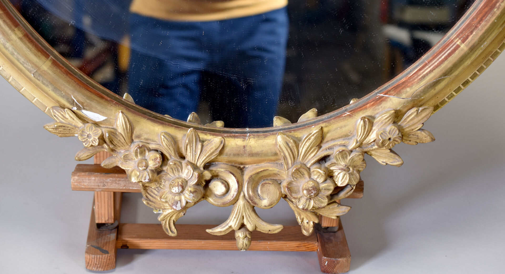 Miroir ovale en bois sculpté doré, le fronton à décor d’un cartouche et de fleurs (restaurations). Époque Napoléon III. 103 x 69 cm.