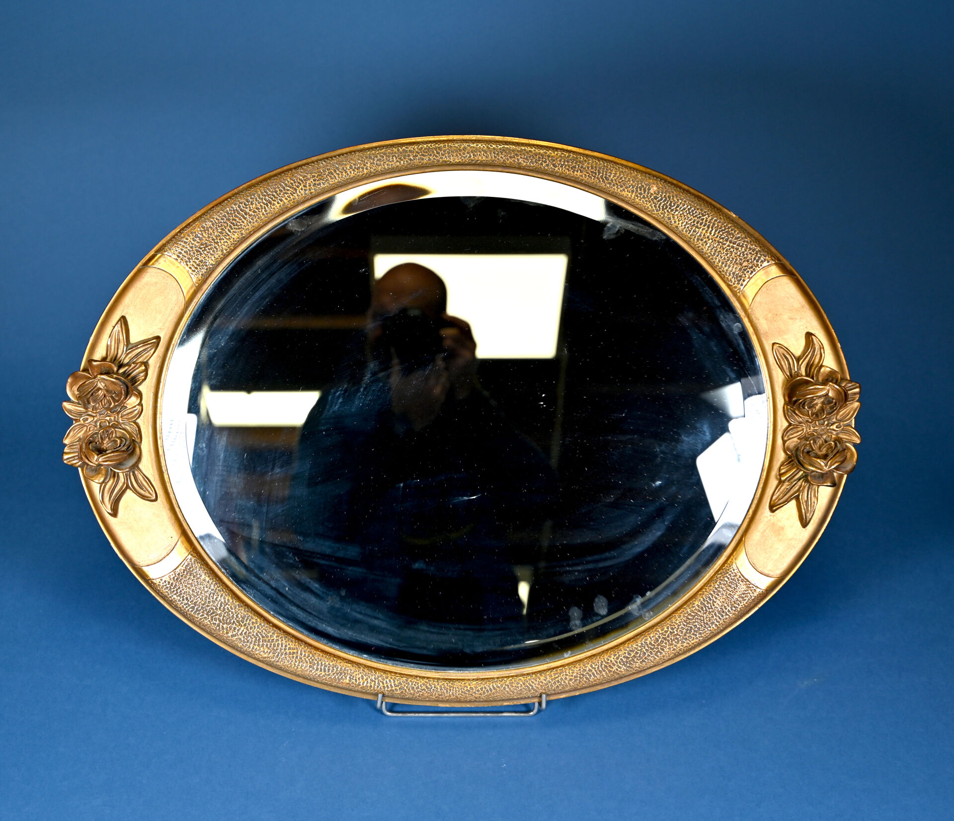 Miroir ovale et bois et composition dorés à décor en relief de roses. Glace biseauté. Vers 1910. 57 x 78 cm.