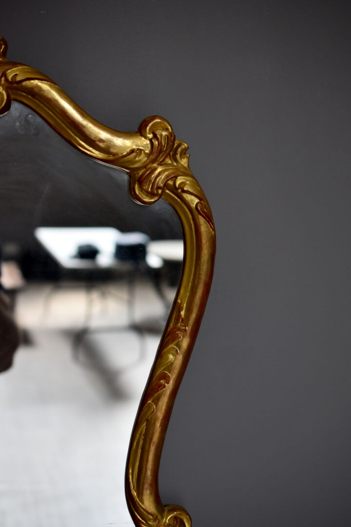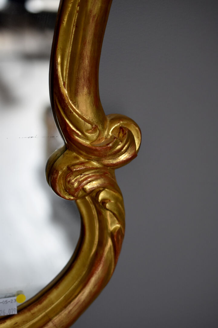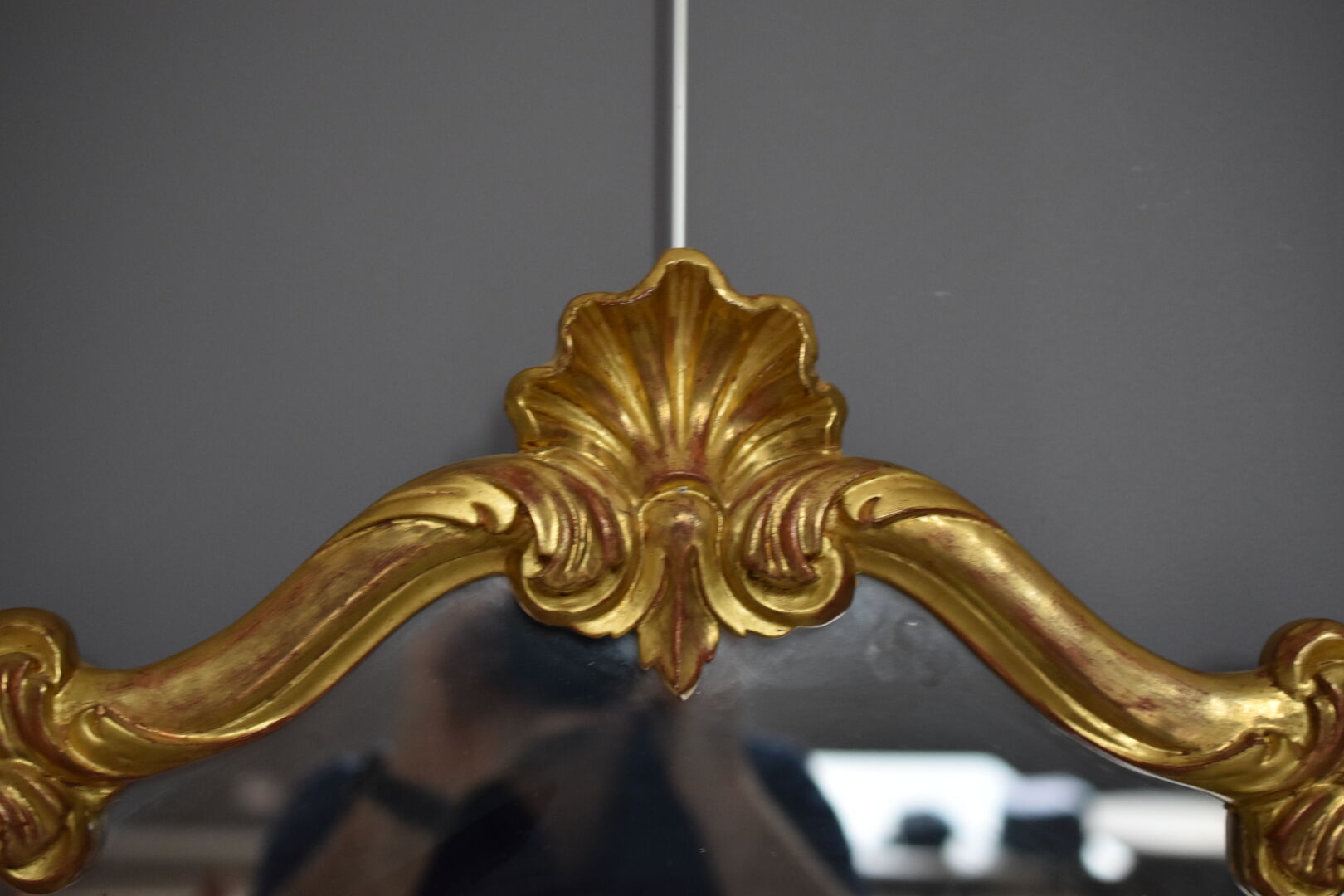 Miroir violoné en bois sculpté doré à décor d’une coquille. Style Louis XV, XXe siècle. Haut. : 80 cm – Larg. : 57 cm.