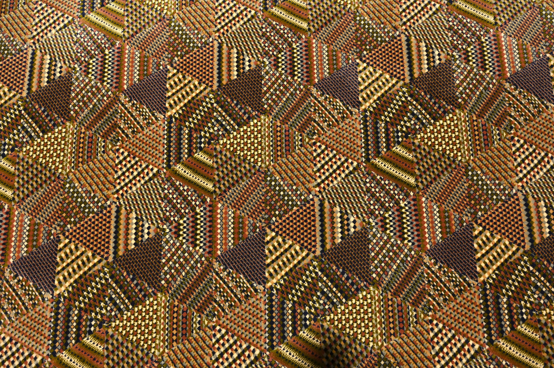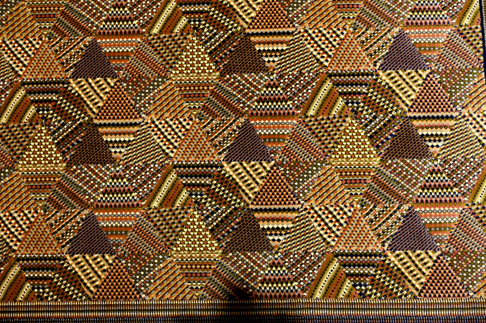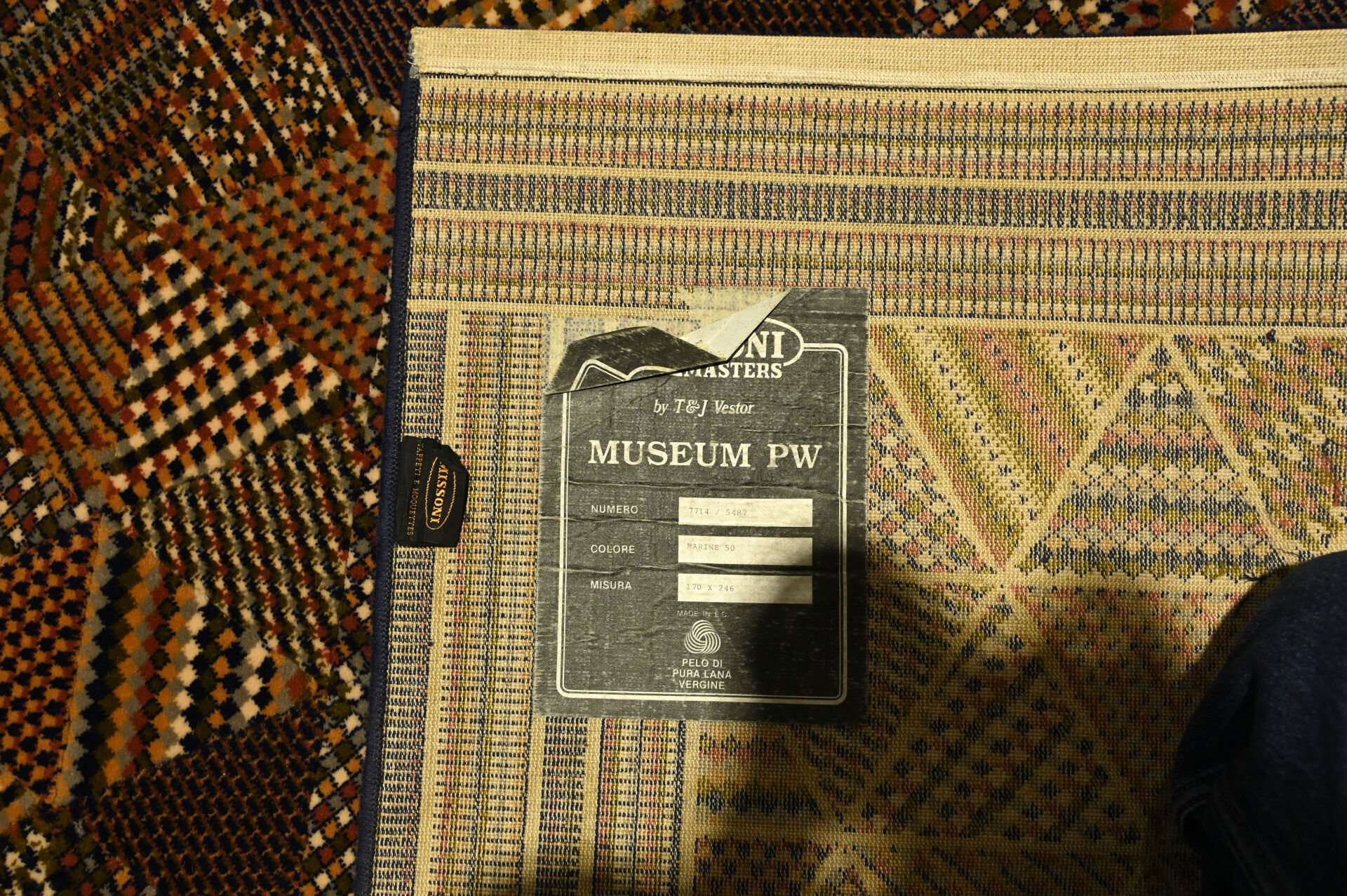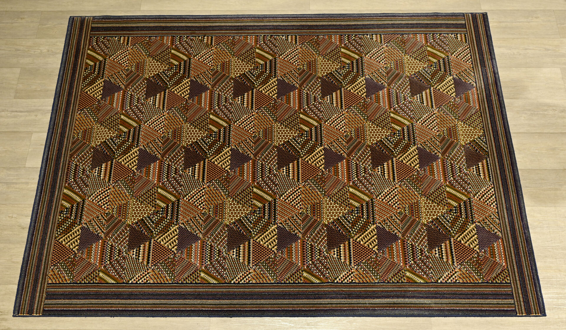 MISSONI. Tapis en laine mécanique à décor de motifs géométriques dans les tons ocres et violets. Large bordure rayée. Étiquette au dos. Dimensions : 170 x 246 cm.