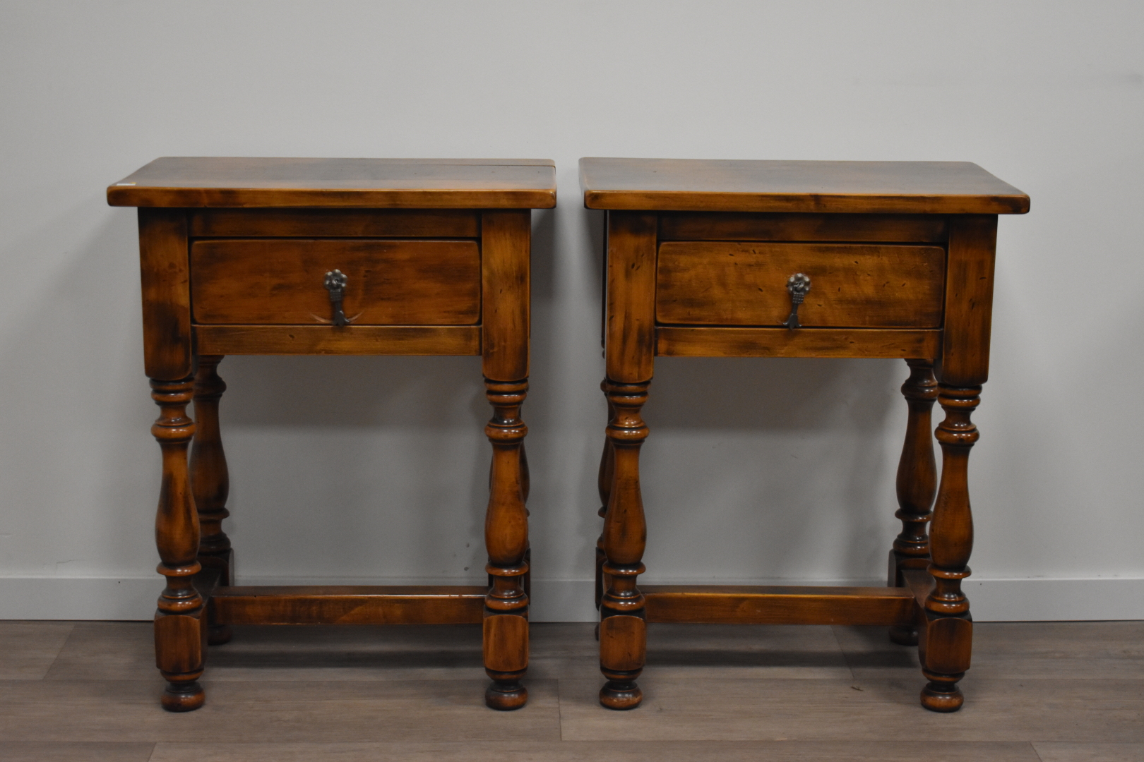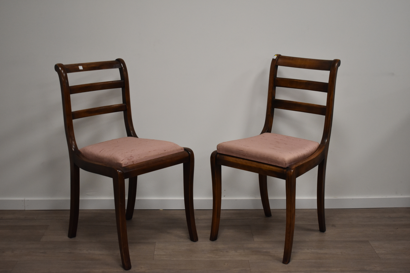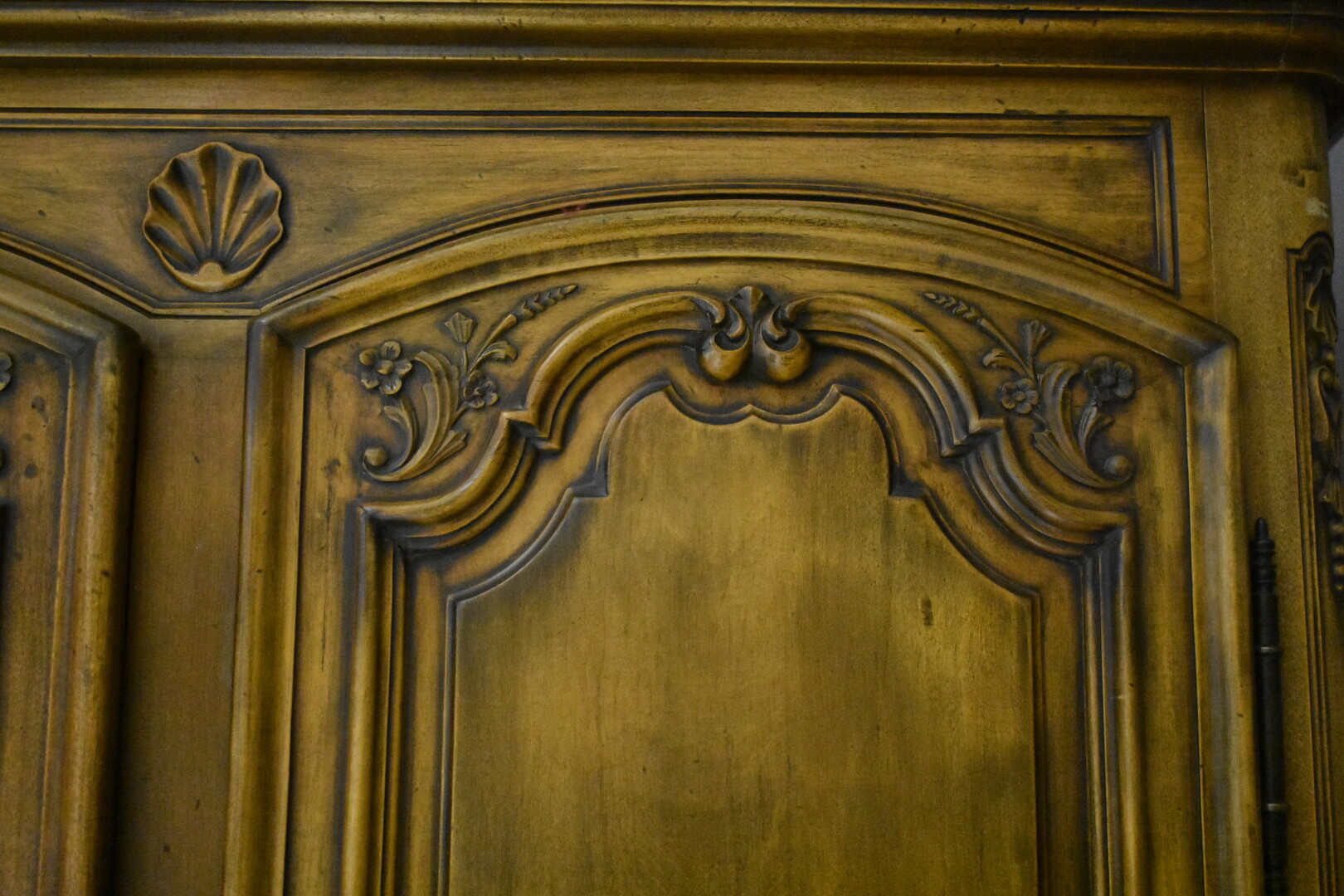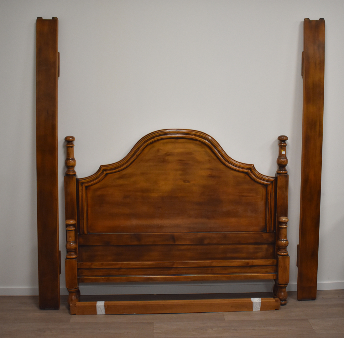 Mobilier de chambre à coucher en hêtre mouluré soit un bois de lit, une paire de chevet, deux chaises paillées et une armoire de style Louis XIV.