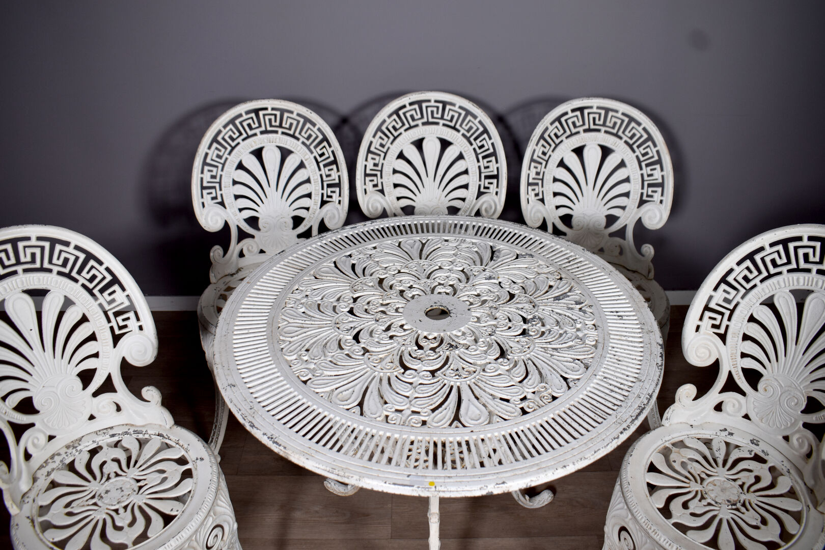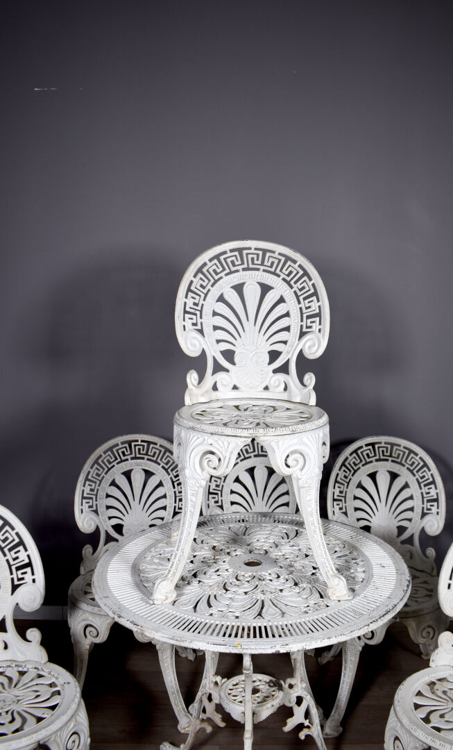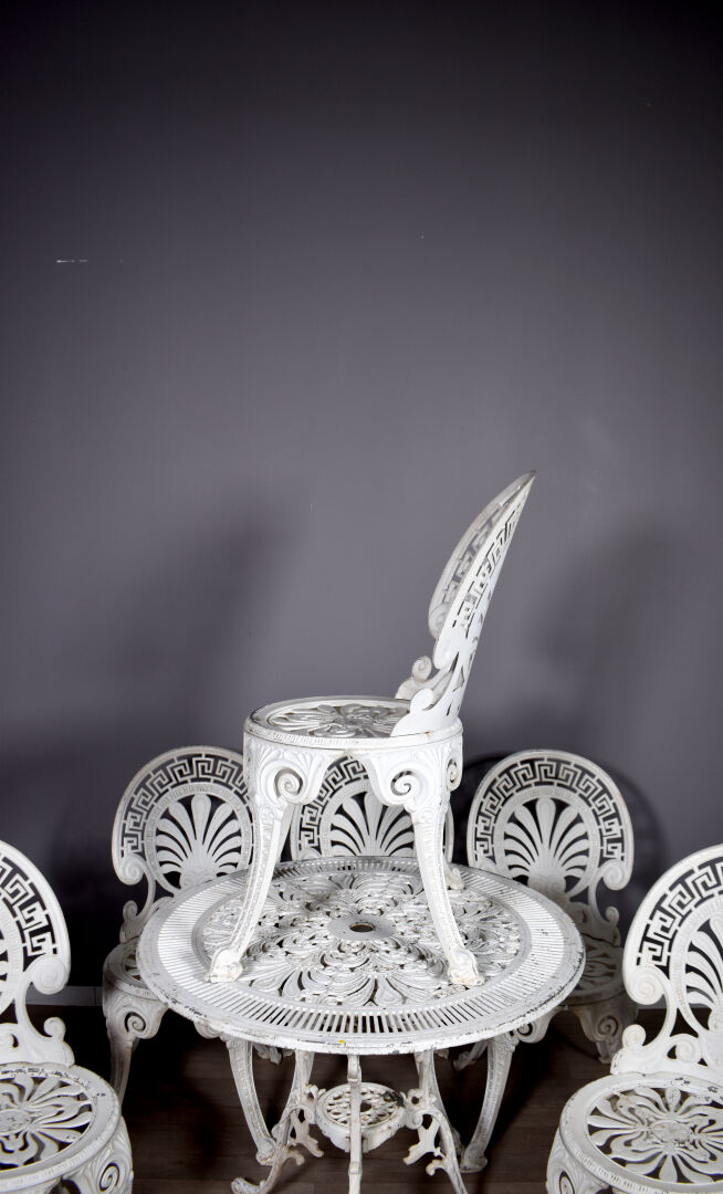 Mobilier de jardin en métal laqué crème à décor ajouré de palmettes, frises de poste et entrelacs comprenant une table à plateau circulaire et piètement tripode et six chaises. Milieu du XXe siècle. Haut. chaise : 83,5 cm – Diam. table. : 80 cm.