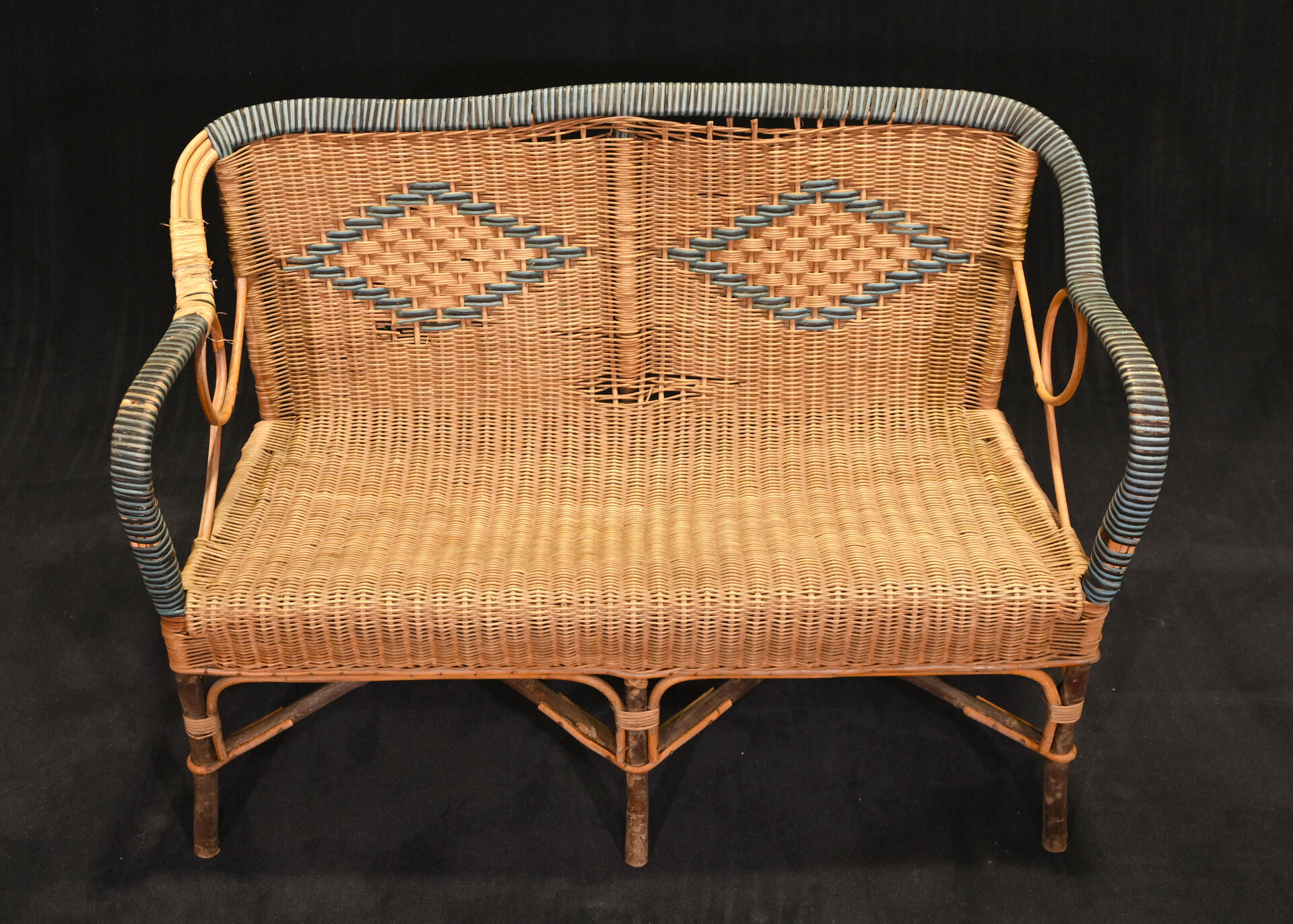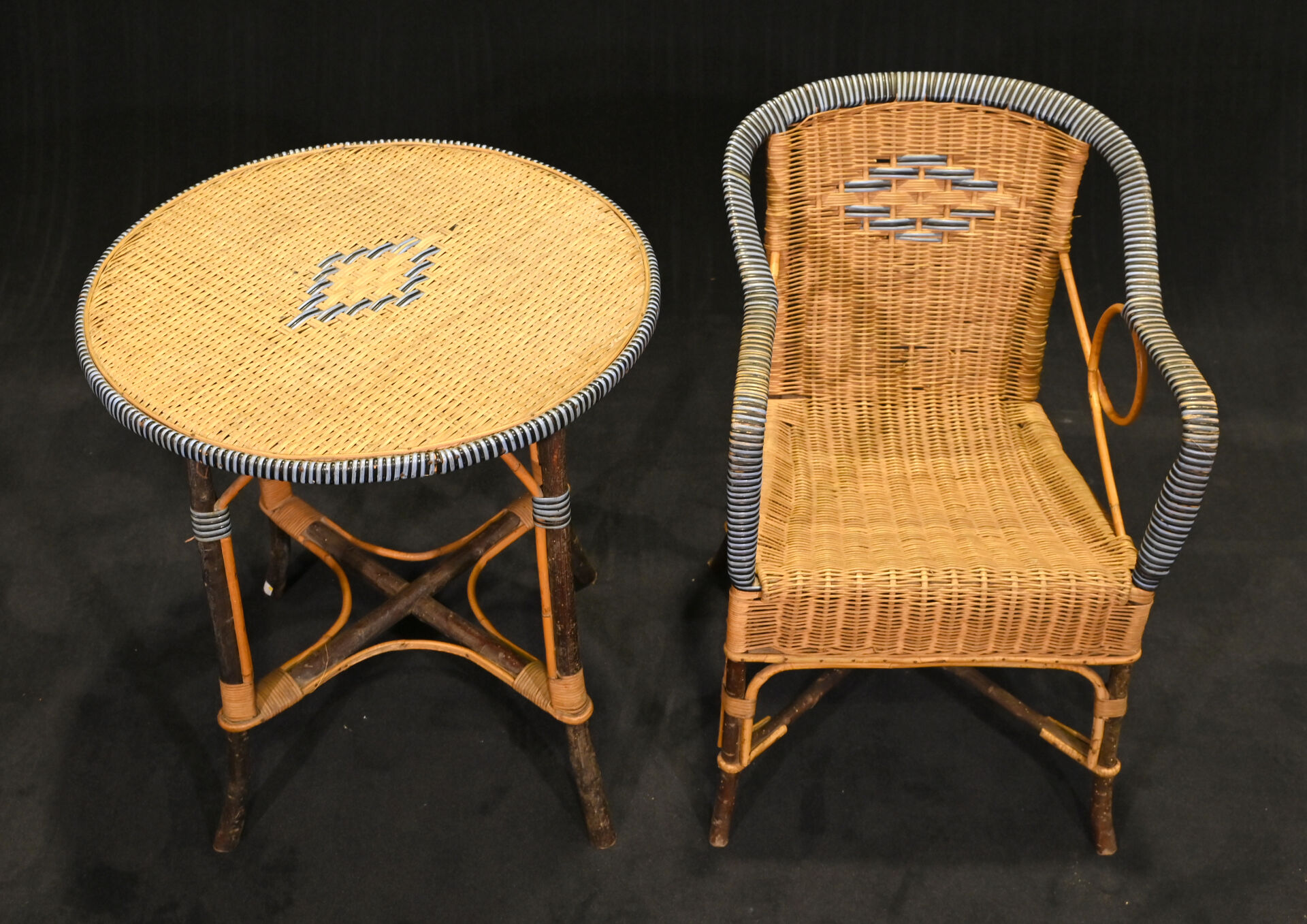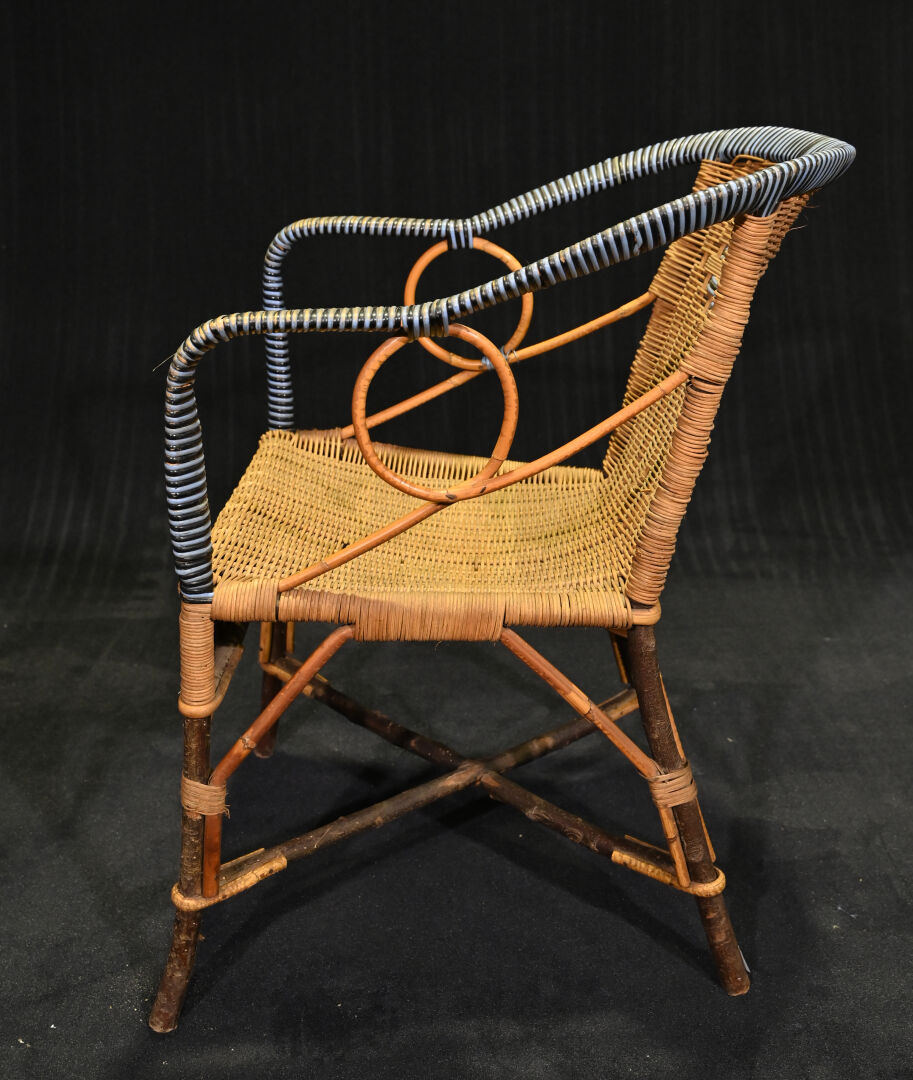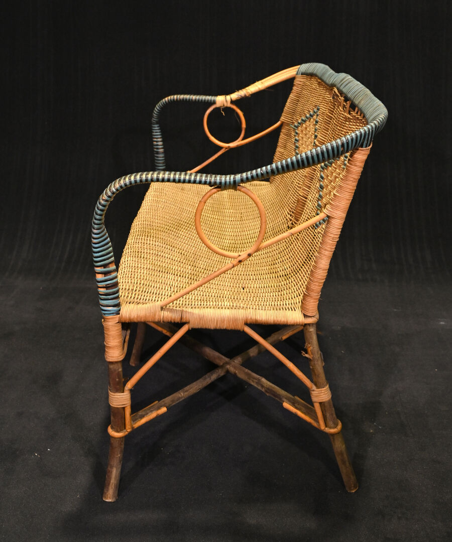 Mobilier de jardin en rotin et bois naturel comprenant une banquette, une table et un fauteuil (quelques manques, principalement sur la banquette). Dim. de la banquette; Haut. : 79 cm – Larg. : 106 cm – Prof. : 52 cm.