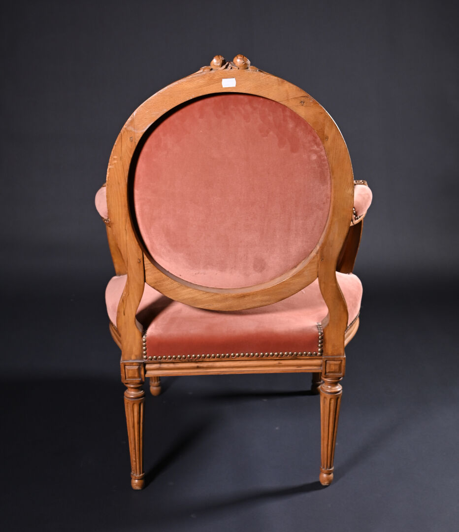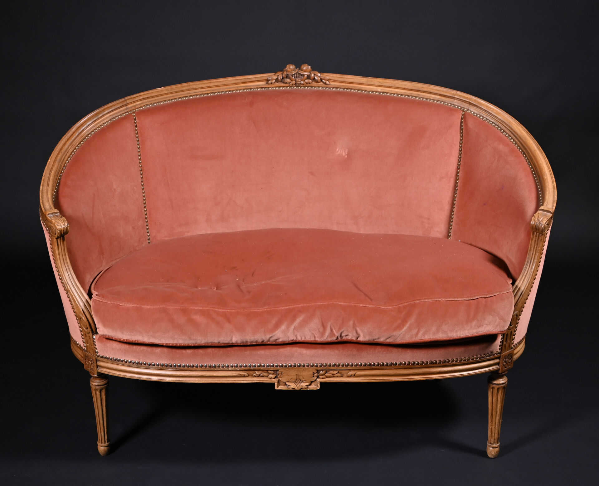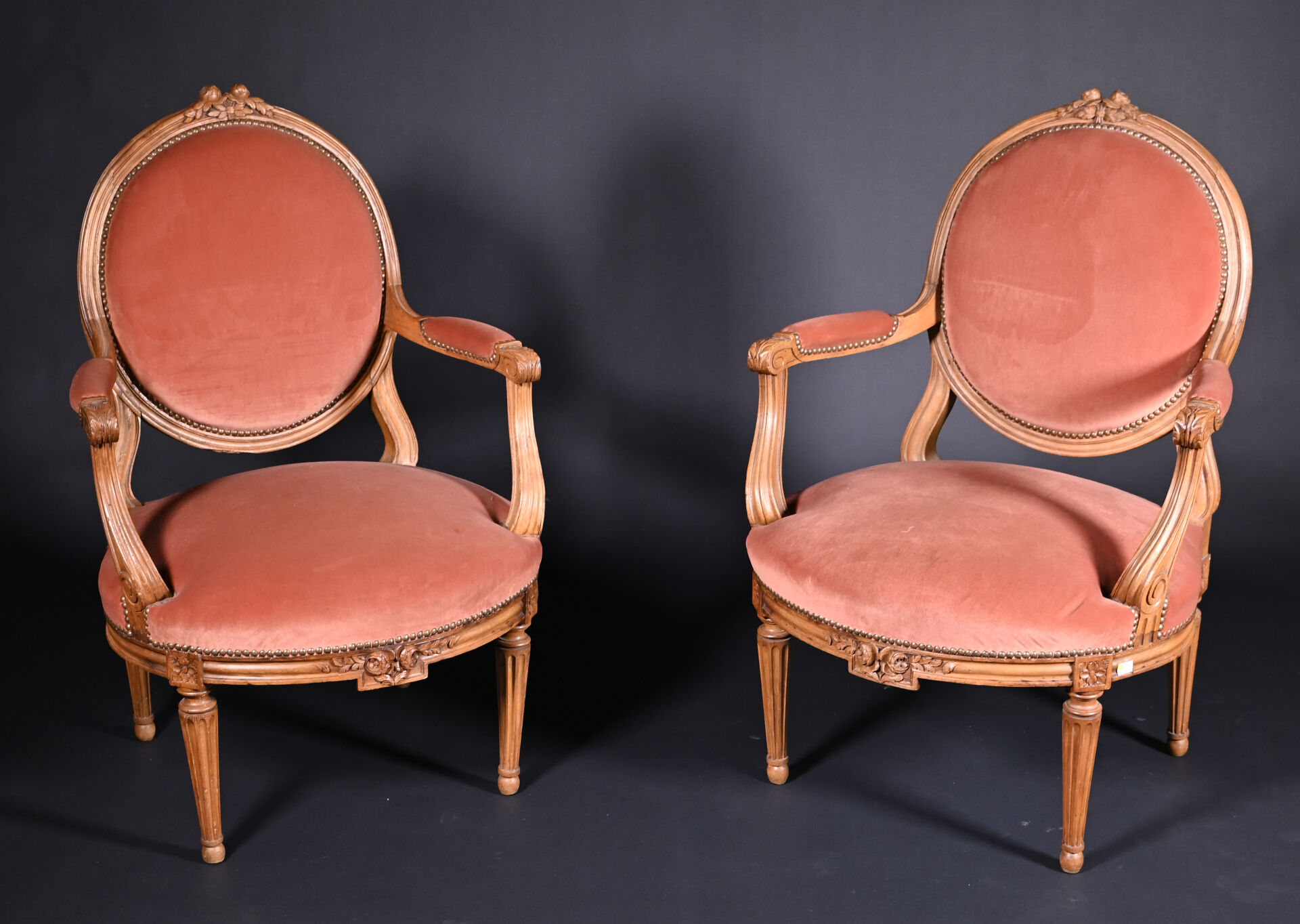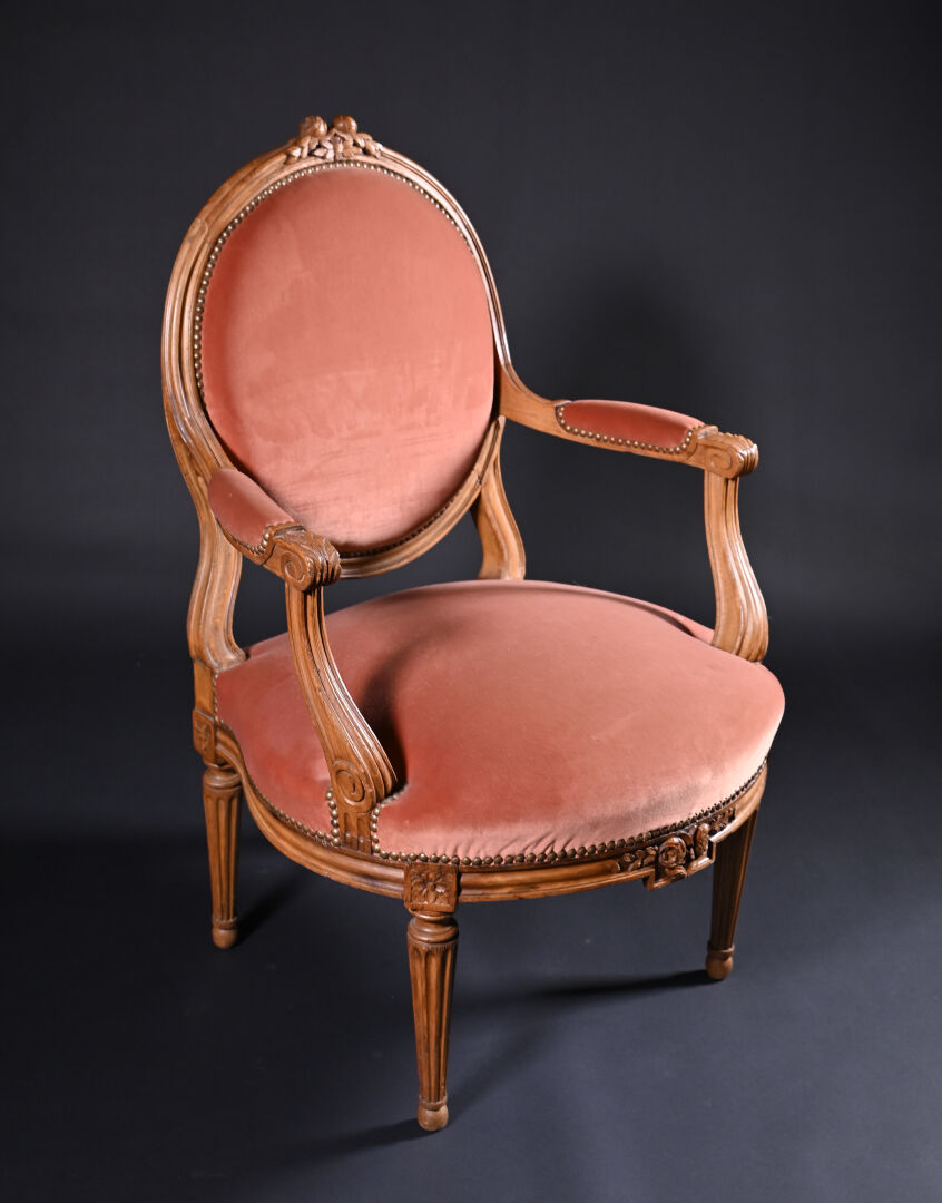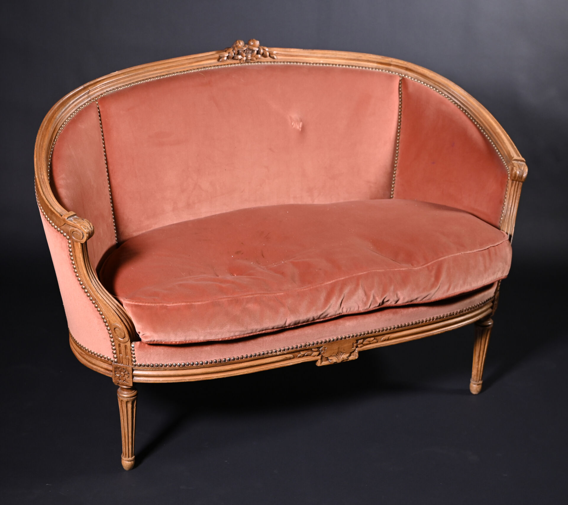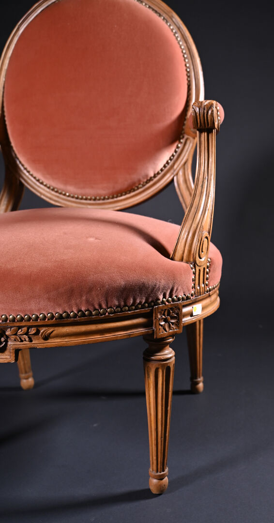 Mobilier de salon en bois mouluré sculpté à décor de roses, cannelures, les pieds fuselés cannelés comprenant un canapé corbeille et une paire de fauteuils à dossier médaillon (usures d’usage, manques). Style Louis XVI. Garniture de velours vieux rose et rose pâle. Dim. canapé : Haut. : 98 cm – Larg. : 137,5 cm – Prof. : 66 cm, Haut. fauteuils : 98 cm.