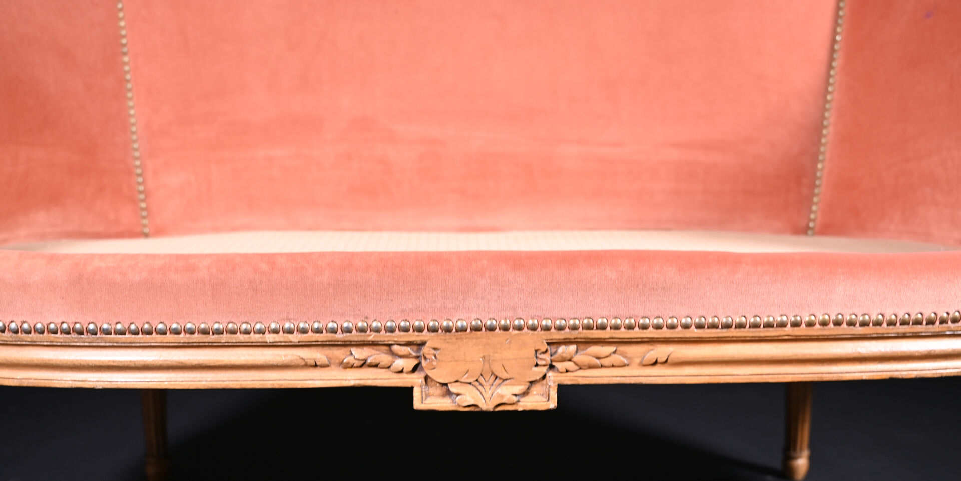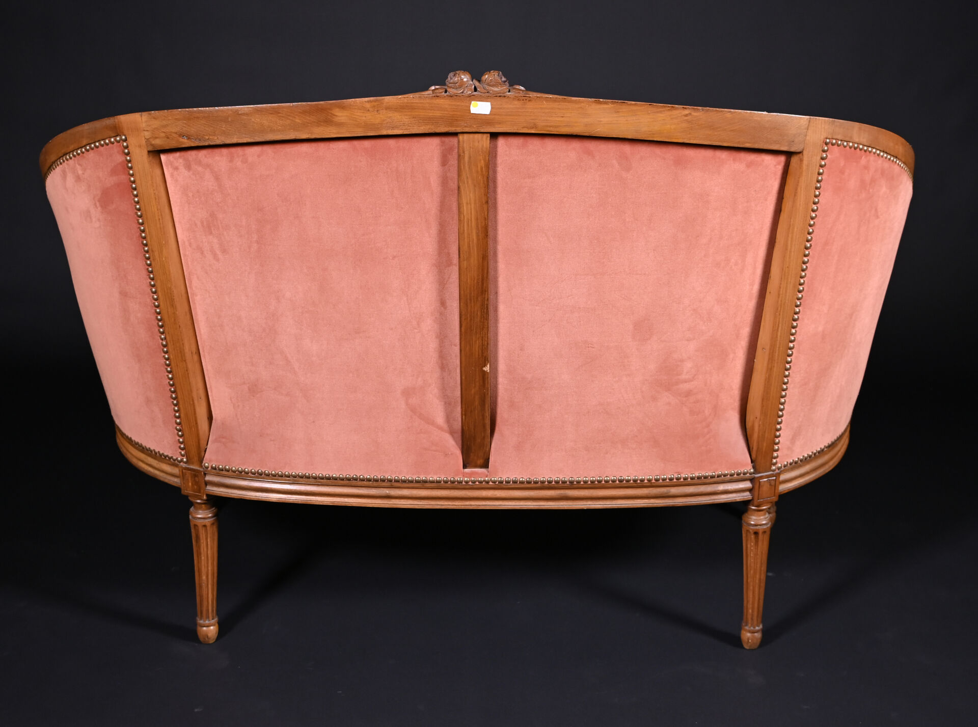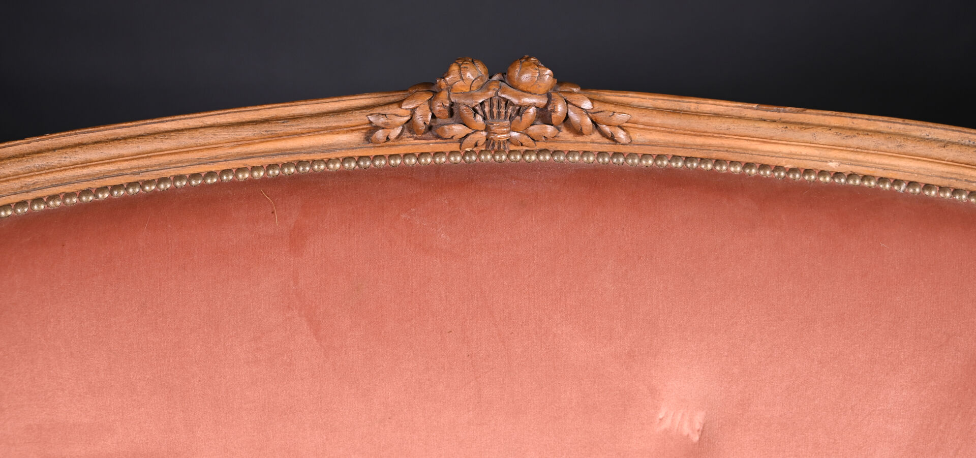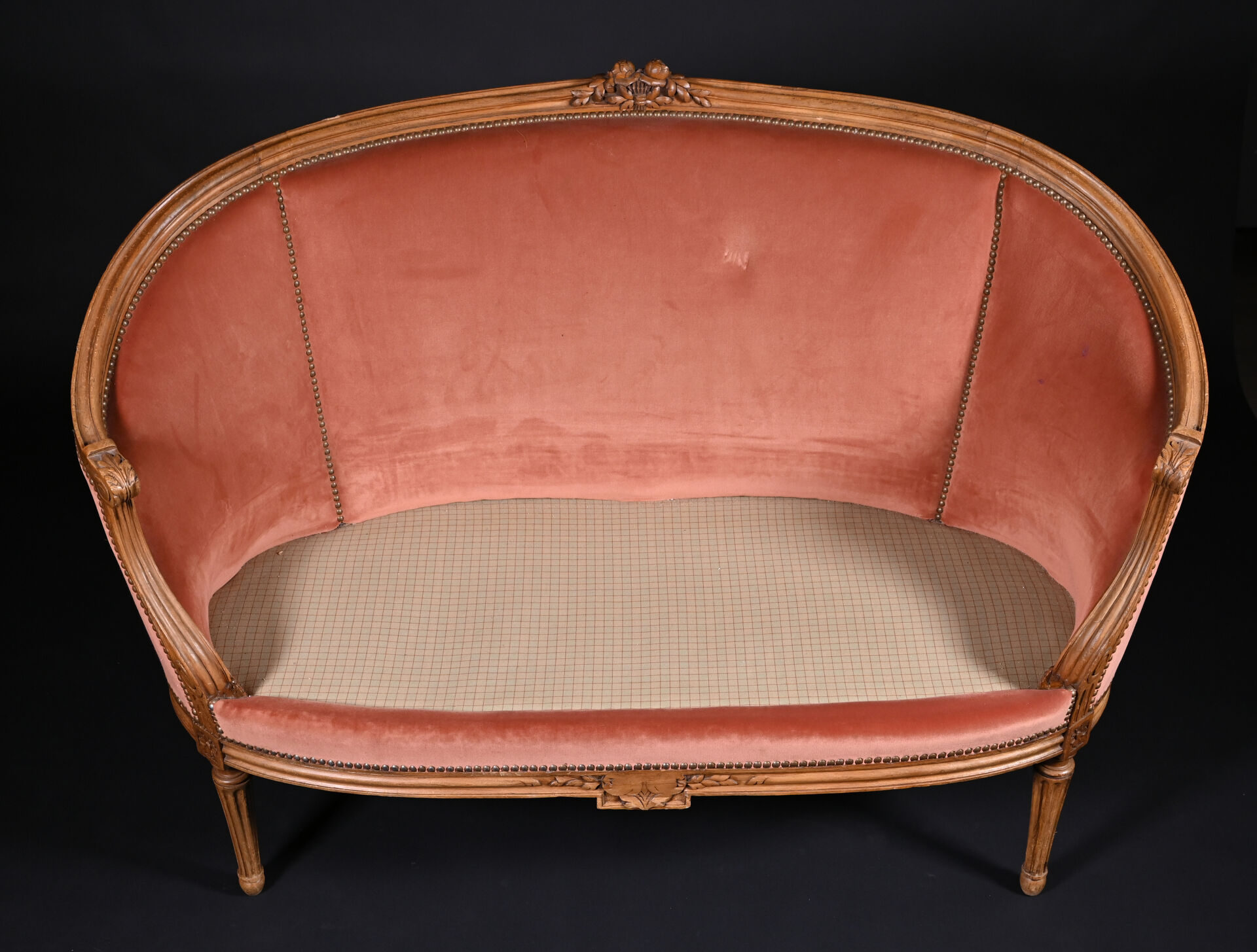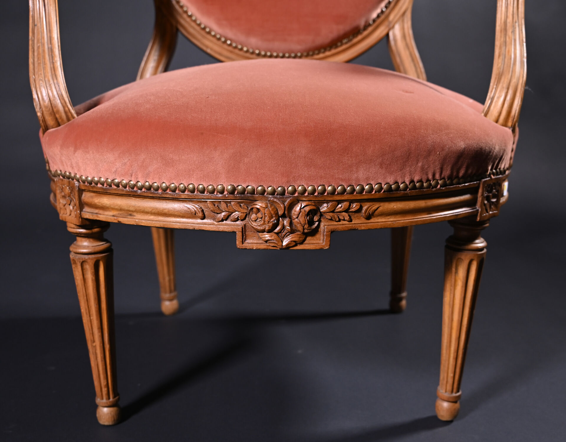 Mobilier de salon en bois mouluré sculpté à décor de roses, cannelures, les pieds fuselés cannelés comprenant un canapé corbeille et une paire de fauteuils à dossier médaillon (usures d’usage, manques). Style Louis XVI. Garniture de velours vieux rose et rose pâle. Dim. canapé : Haut. : 98 cm – Larg. : 137,5 cm – Prof. : 66 cm, Haut. fauteuils : 98 cm.